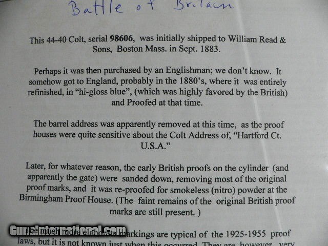 Description: Colt SAA 1883 British Proof Battle of Britain, re-blue 100% Cal. 44-40, with a good bore 7 ½’ barrel, Manufactured in Hartford Connecticut in 1884 on top of the barrel one line Colt address and hard to see on the side of the frame is three line patent address on the trigger guard is 44 CF. Comes with Colt one piece wood grips in very good condition. Mechanically in good condition with a tight cylinder lockup in single action this is an all matching serial number gun it has all the markings of the Battle of Britain gun. Comes with a factory letter this gun was shipped to William Read & Sons Boston, Massachusetts in September 25, 1883 in a 3 gun Shipment. Serial Number 986XX This Gun is “ANTIQUE” Ship right to your Door” SOLD Antique: Yes Manufacturer: colt Model: SAA Barrel Length: 7 1/2 Chambers: 44-40 Finish: Re blued |