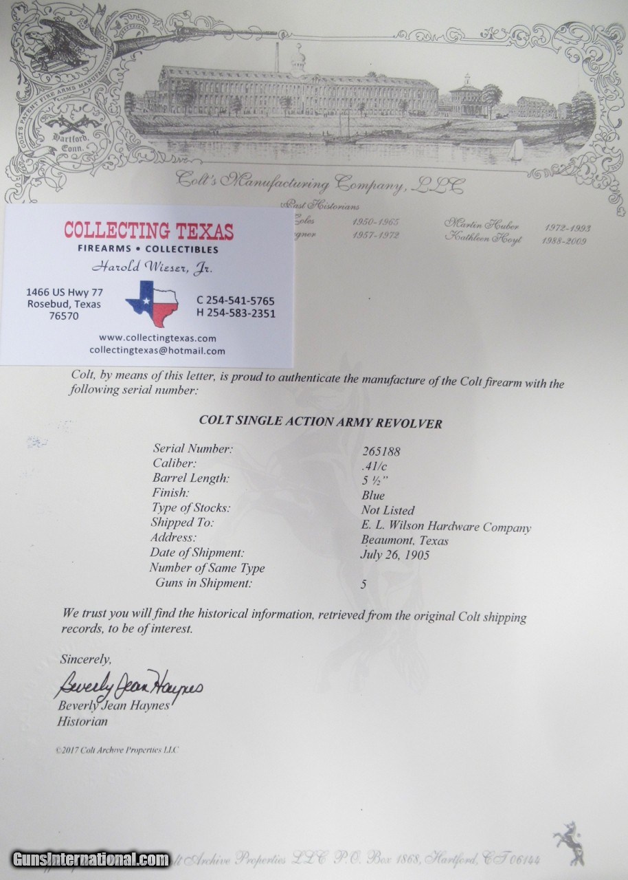 Description: Colt Single Action Army; Serial No. 265188; 41 Caliber with 5 ½” Barrel; Shipped in 1905 to E.L. Wilson Hardware Co. of Beaumont, Texas; All Matching and Original; Traces of Original Metal Finish Remains; Original Colt Hard Rubber Grips with wear; Crisp Tight Action and Excellent Strong Bore with only minor flaws; Great 115 Year-Old Colt Shipped to Wild and Wooly Oil Boom Town; See All Photos for Condition; No Texts. Call or Email Only; PERSONAL PROPERTY of Harold Wieser; Price: $2,975 + $45 S&H Via FedEx Express; Price includes insured shipping; return policy: three days inspection from the date the item is received; full refund of shipping both ways ONLY IF THE ITEM IS MISREPRESENTED. SOLD Manufacturer: Colt Model: 1873 Serial Number: 265188 |