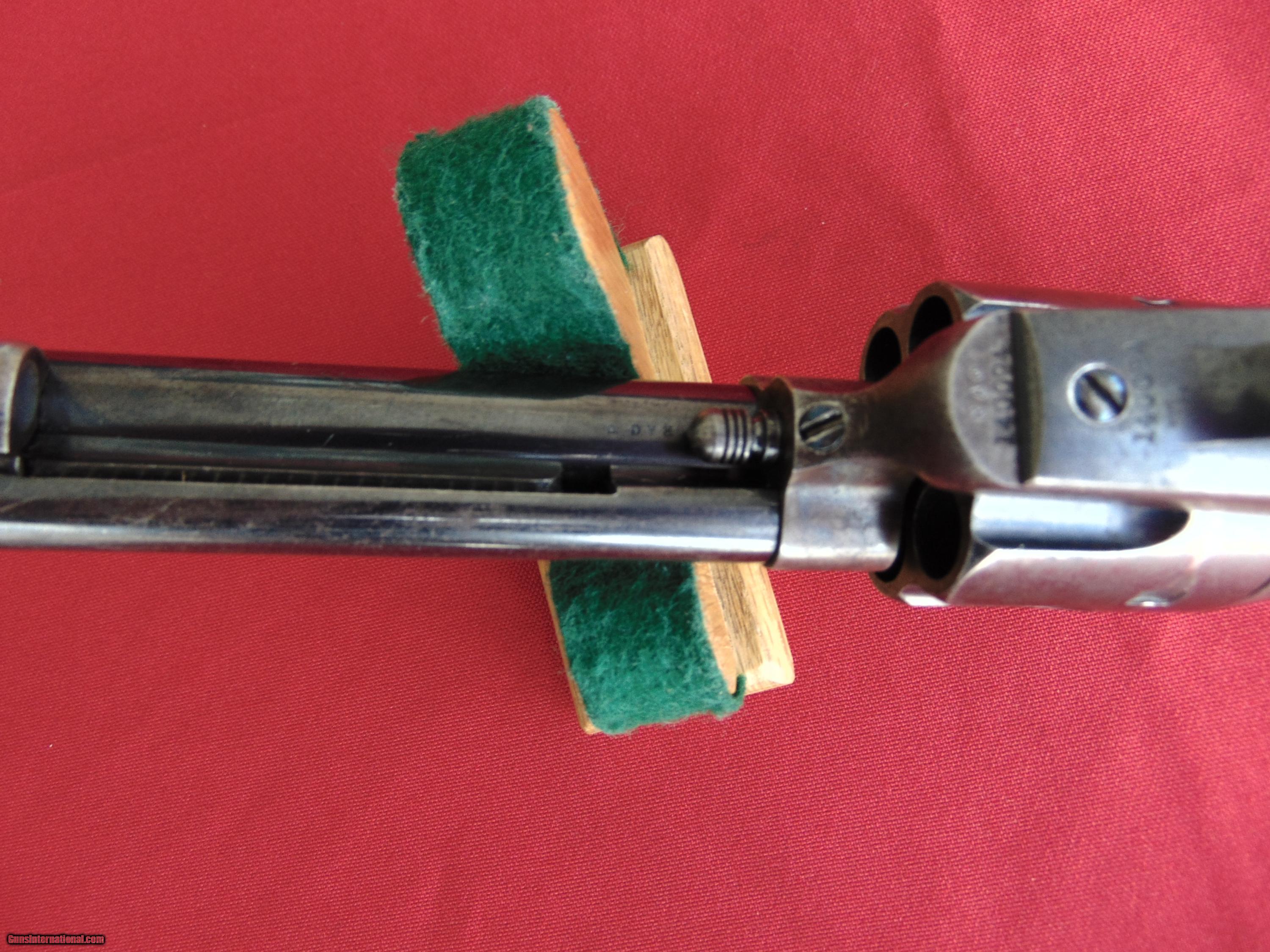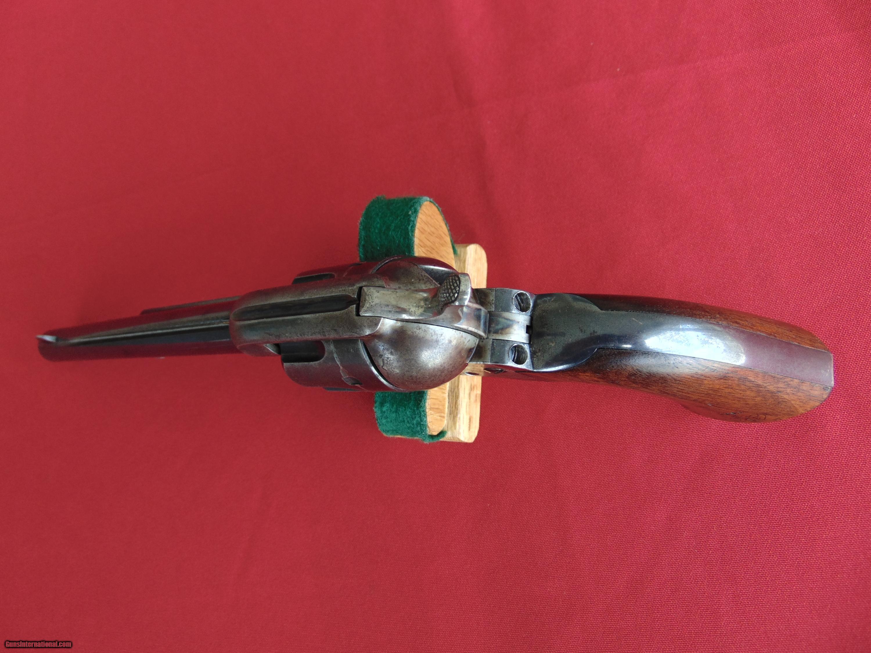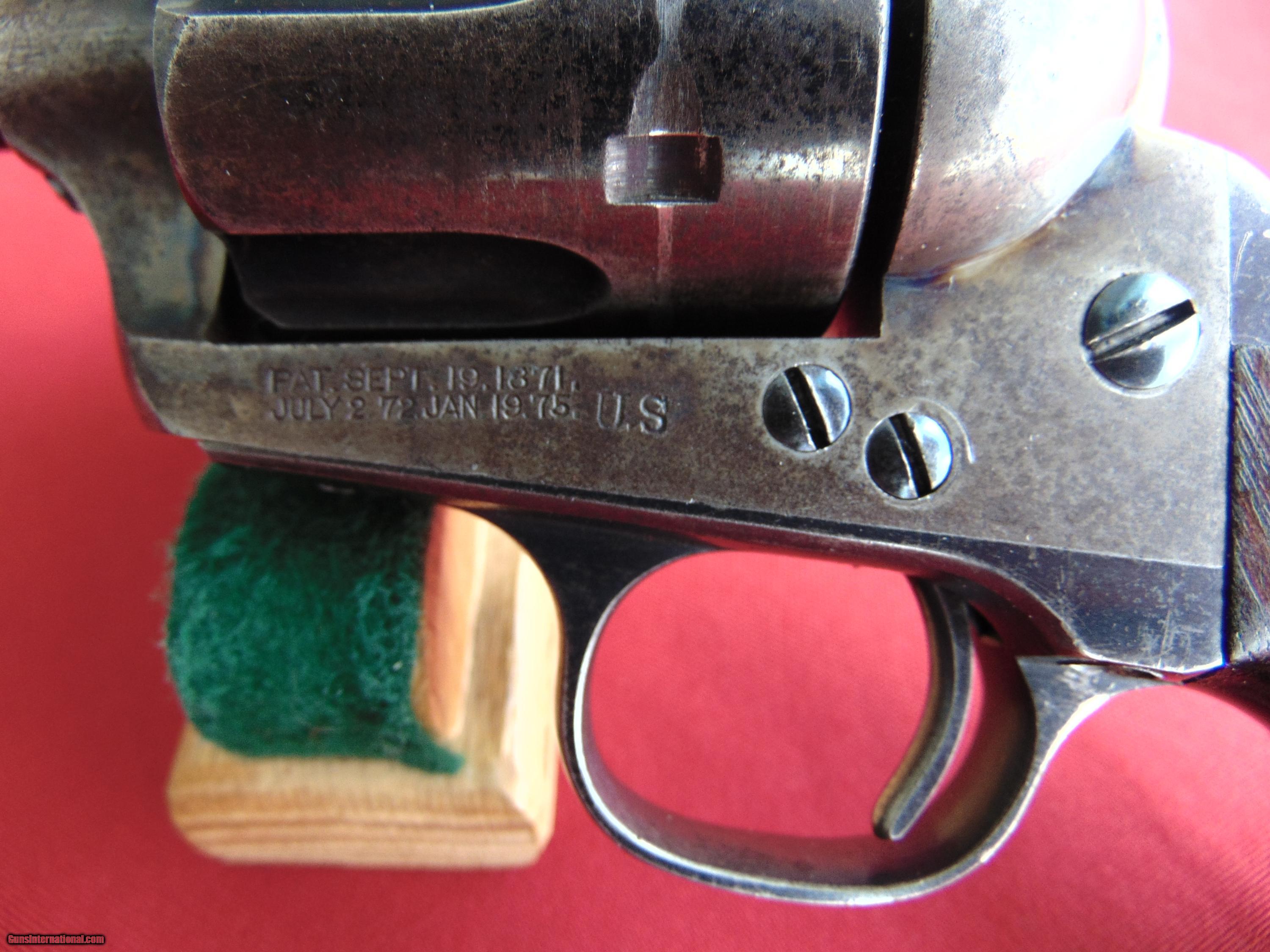 Description: Colt SAA Cavalry Serial # 1400xx (1891 Vintage). One of the last 275 Built for the Military. RAC Inspected and properly marked. Blued areas retain a minimum of 90% original finish excluding the bottom of the butt and cylinder that retain a good 60%. The Case Colored areas retain 45-50% Original Color with more in the protected areas. Bore is bright with good lands and grooves with very little pitting if any. Grips retain an honest 80% Original Finish with very legible inspectors mark ( RAC ) on the right grip and the date,1891 along with the sub inspectors initials of which I cannot make out the first Initial on the left grip. The only real wear on the grips is on the bottom of the butt which have a couple of small marks or indentations. RAC is also on the bottom of the barrel just ahead of the cylinder pin. This is an exceptional specimen which are hard to locate these days because most of them are either in museums or collections such as this one was. A truly rare find these days. No license or papers required being an antique. Thanks for Looking. SOLD Antique: Yes |