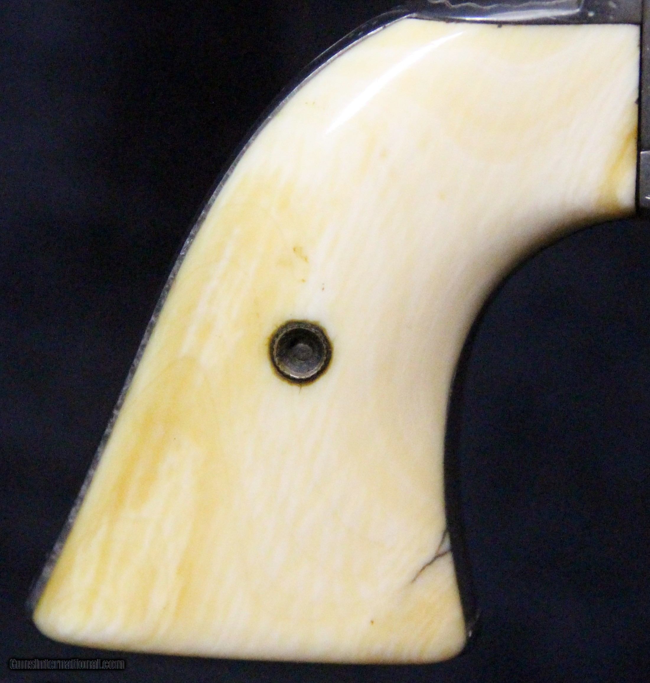 Description: .45, #111122, 4 3/4 inch barrel, nickel finish, 2 piece ivory grips, serial numbers all match but have obviously been after the nickel was applied, letter says this number should be 7 1/2 inch barrel and blued finish, by the markings it would be post 1890, New York style engraving is worn smooth, no engraving on hammer. Condition: very good bore, 60% nickel scattered around on different surfaces, has been buffed, grips are very good and appear to have been on the revolver quite a while, excellent mechanically, very good marks. SOLD Antique: Yes |