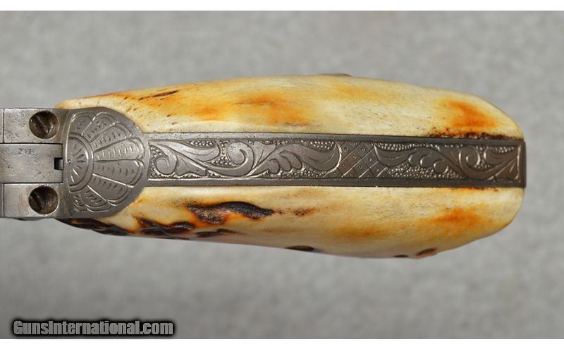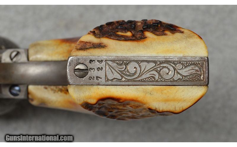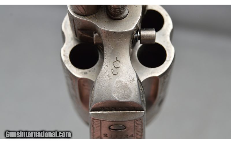 Description: Colt Generation 1 proffesionally engraved by unknown engraver. This Colt features an excellent finish with 90% coverage engraving signed with the initials "JC" on the front of the frame, above the serial number, and on the rear of the hammer. Gun is mechanically sound and still locks up. SN: 233724 MFG: 1902 .38 WCF SOLD Curio/Relic: Yes Metal Condition: Excellent Wood Condition: Excellent Bore Condition: Clean Barrels: 4 3/4 Weight: 2 lb 8 oz Item Location: Fort Worth, TX |
