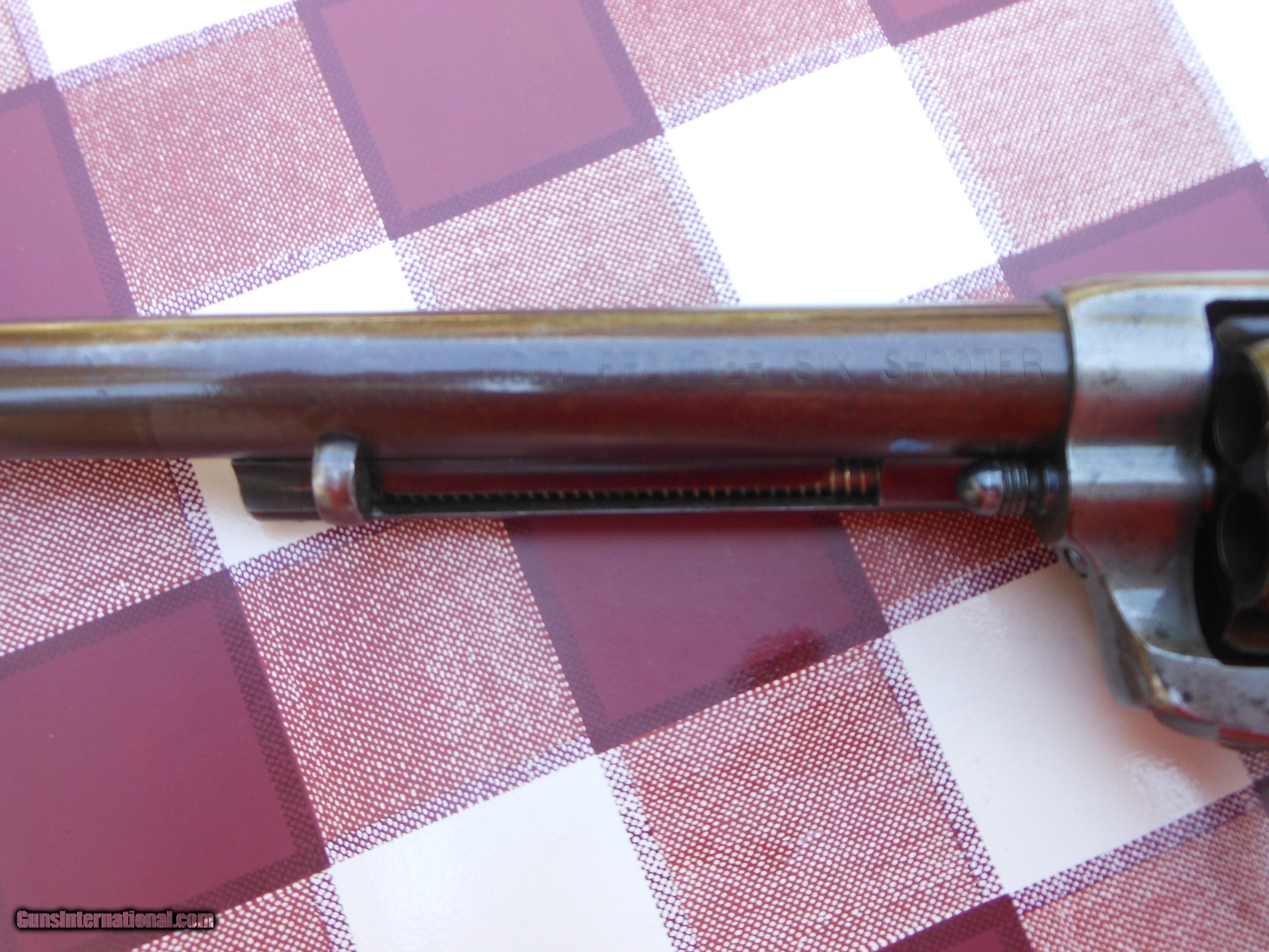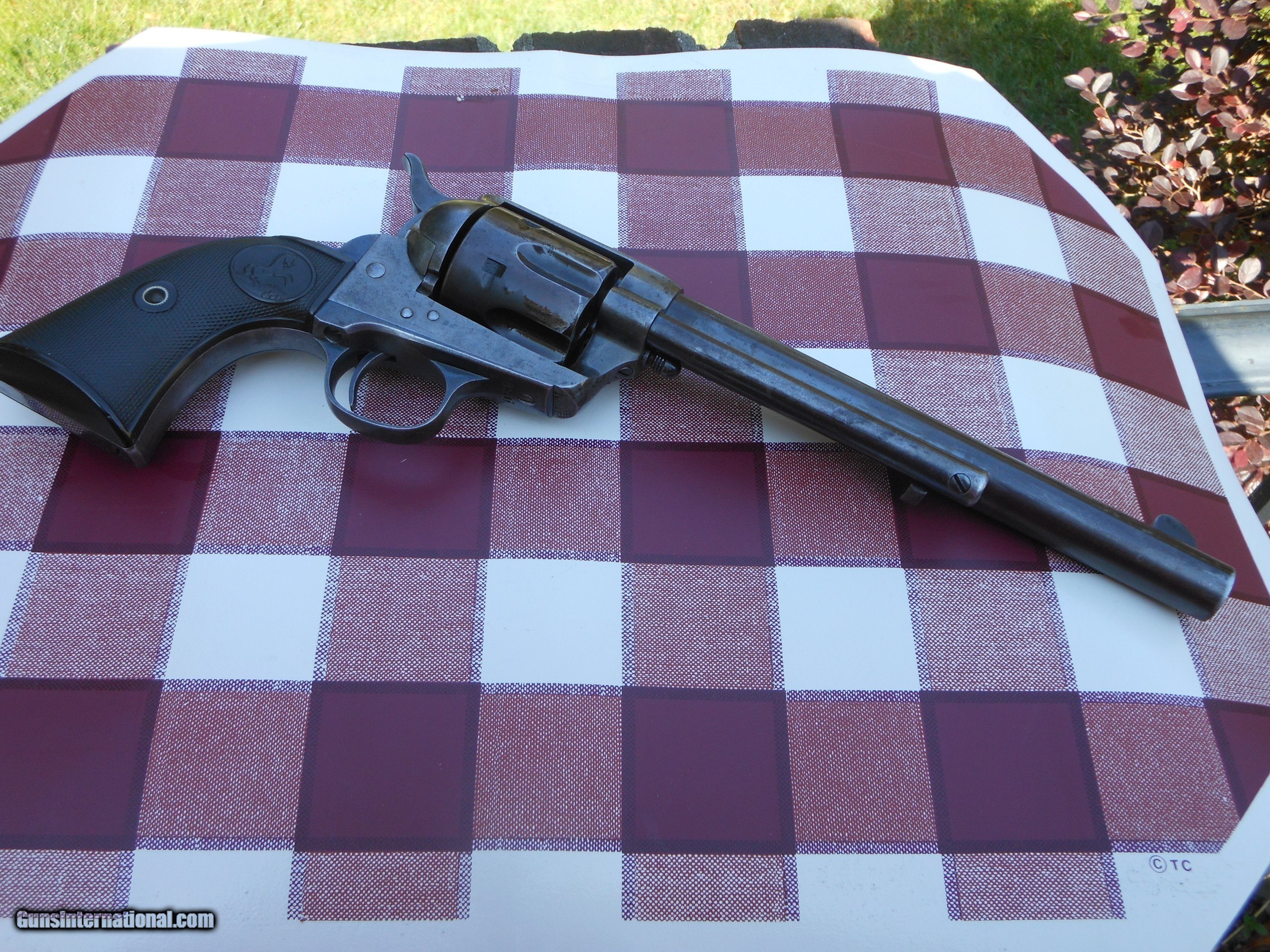 Description: Hi This is a 44-40 lettered just like it stands here. 7.5 inch roll marked 'Colt Frontier Six Shooter'. Lots of blue and some case. The bore and grips are perfect. Sent to E.C. Meacham in Oct 1892. Buyer pays $40 shipping and Ins. SOLD |