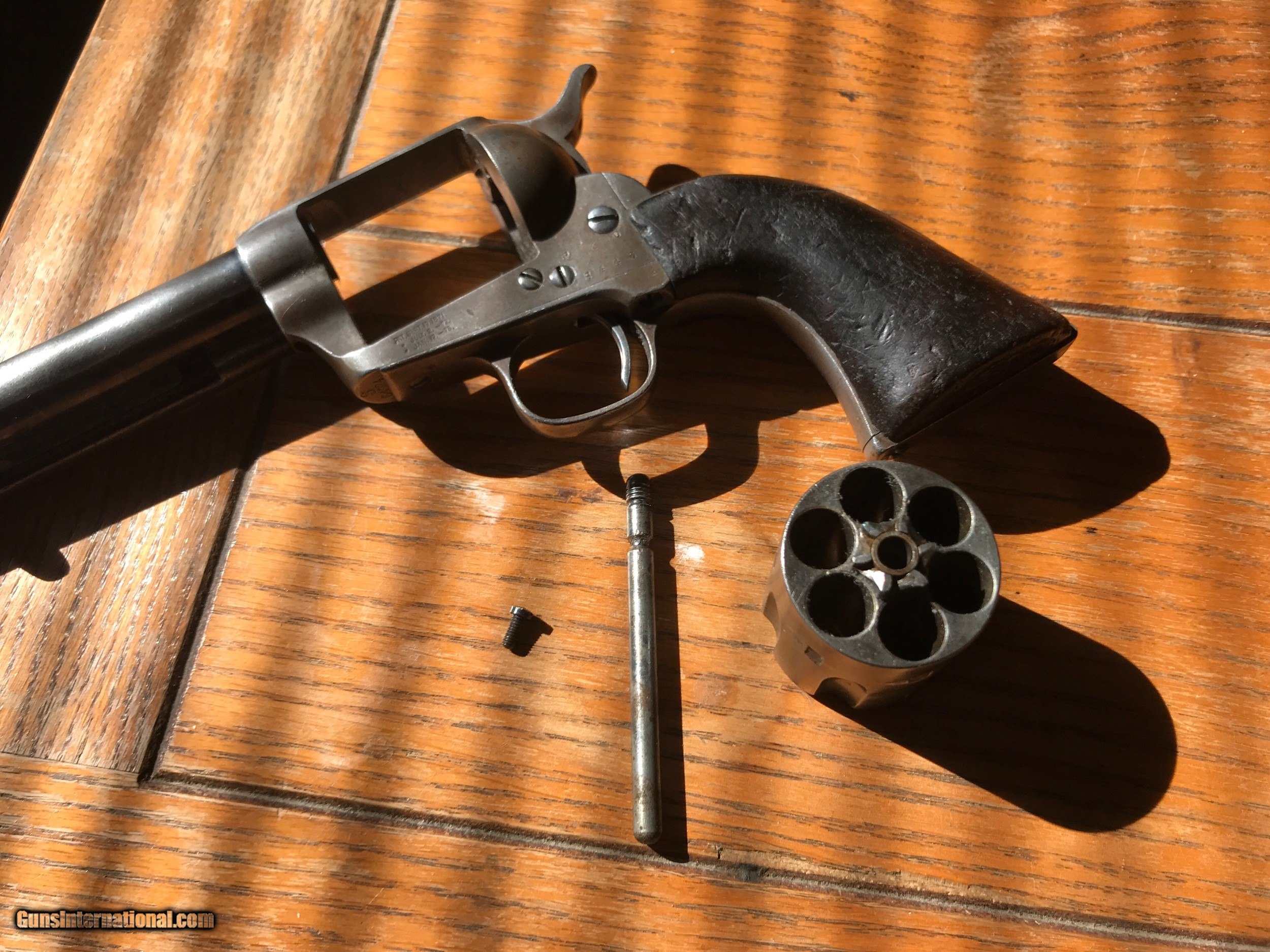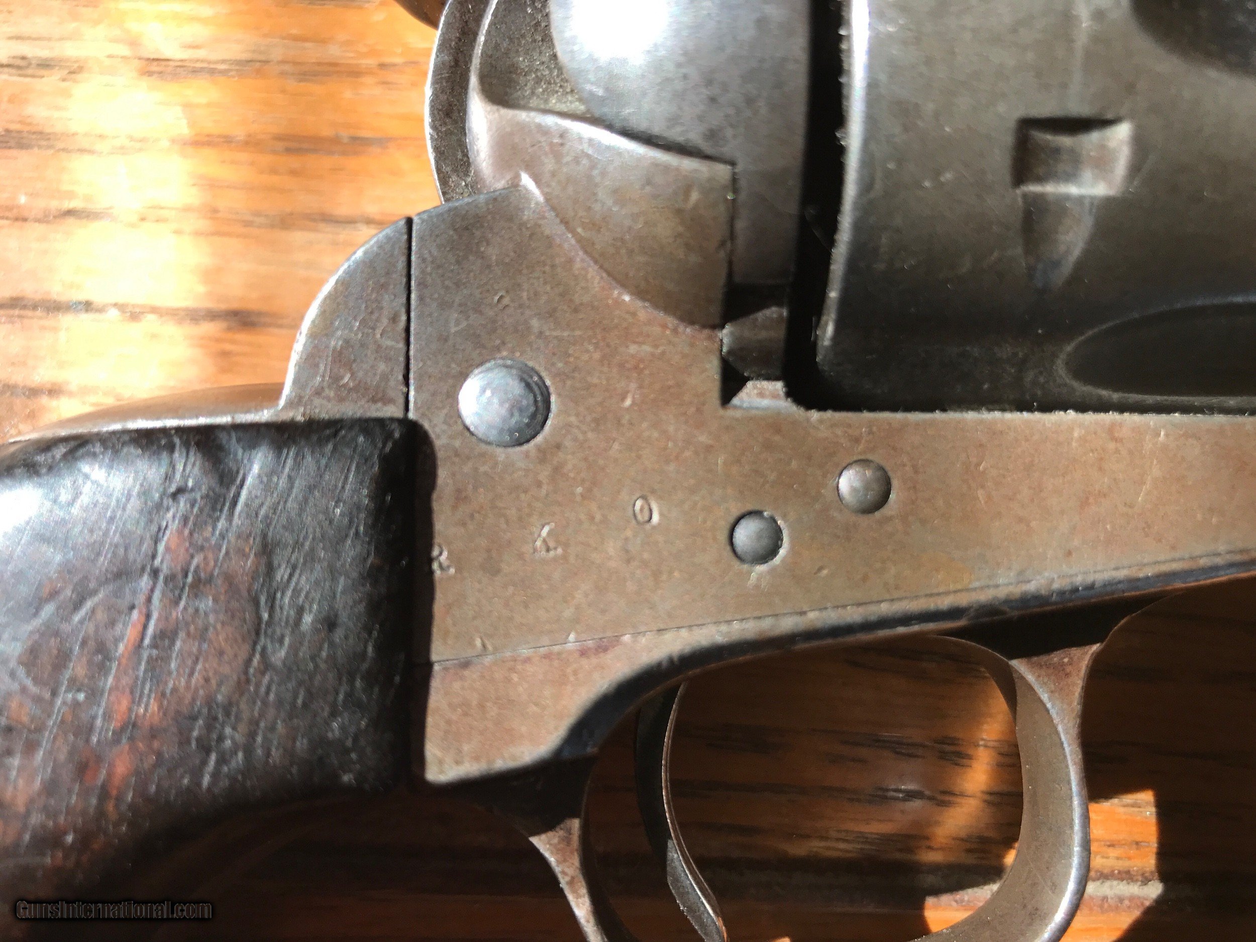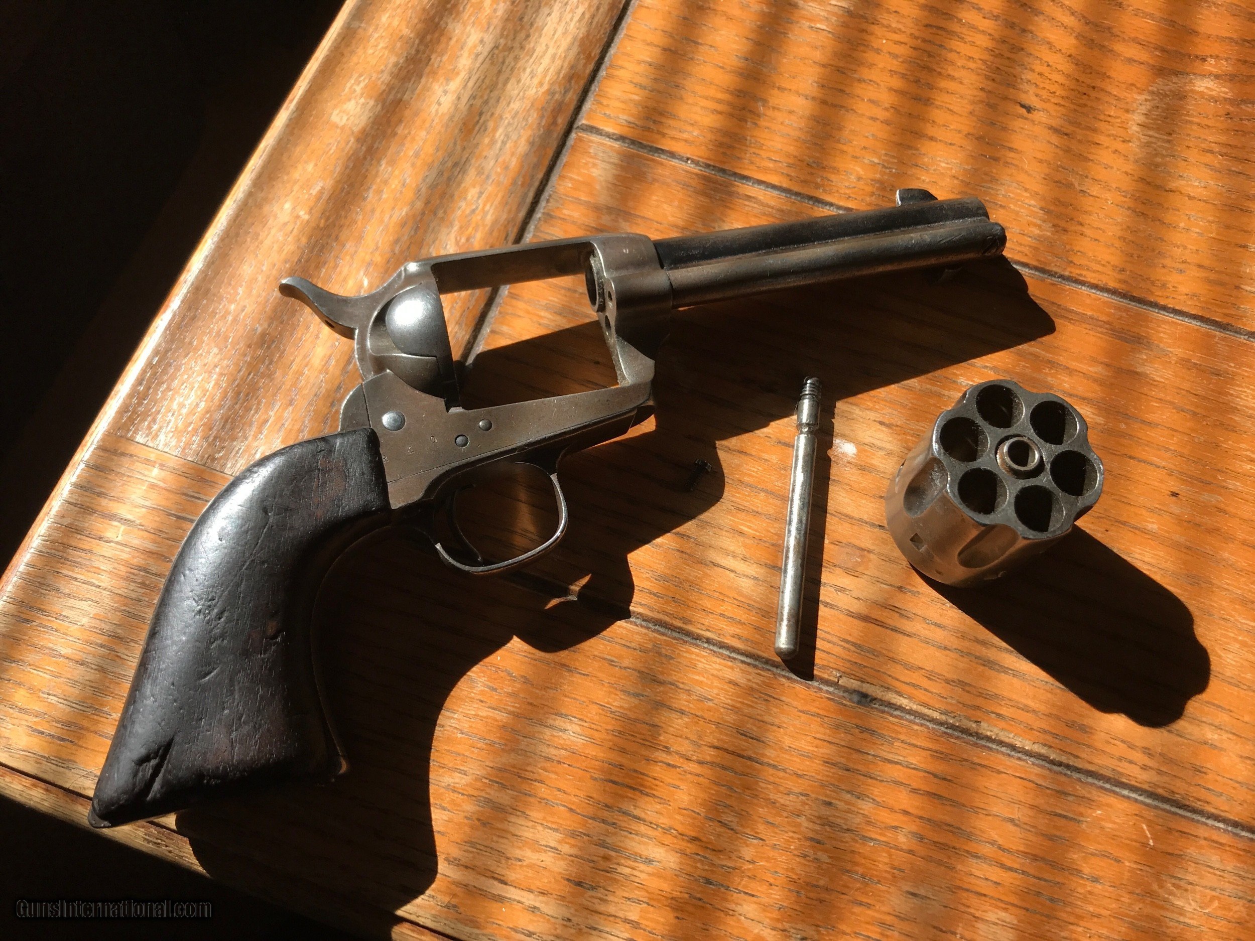 Description: The presented object appears to be Colt SAA Peacemaker 45. revolver. The revolver jas the serial number 64294 which dates this revolver into the 1880's ?This piece is in medium condition and there is no serious damage. This is a RKO RADIO PICTURES gun. Blueing is gone from holster wear. I believe it has the original walnut grips. Has been checked by a gunsmith. All matching #’s. Black powder frame. This is a working revolver. Provenance Just know that it has RKO stamped on it with a catalog #. It could be a very important gun if someone could find out more from the RKO archives. SOLD Antique: Yes Handgun Caliber: .45 Colt Manufacturer: Colt Model: SAA Serial Number: 64294 Condition: Good Metal Condition: Blueing gone Wood Condition: Appears to be original grips. Lots of wear Extras: RKO RADIO PICTURES serial numbers Item Location: 92543 |