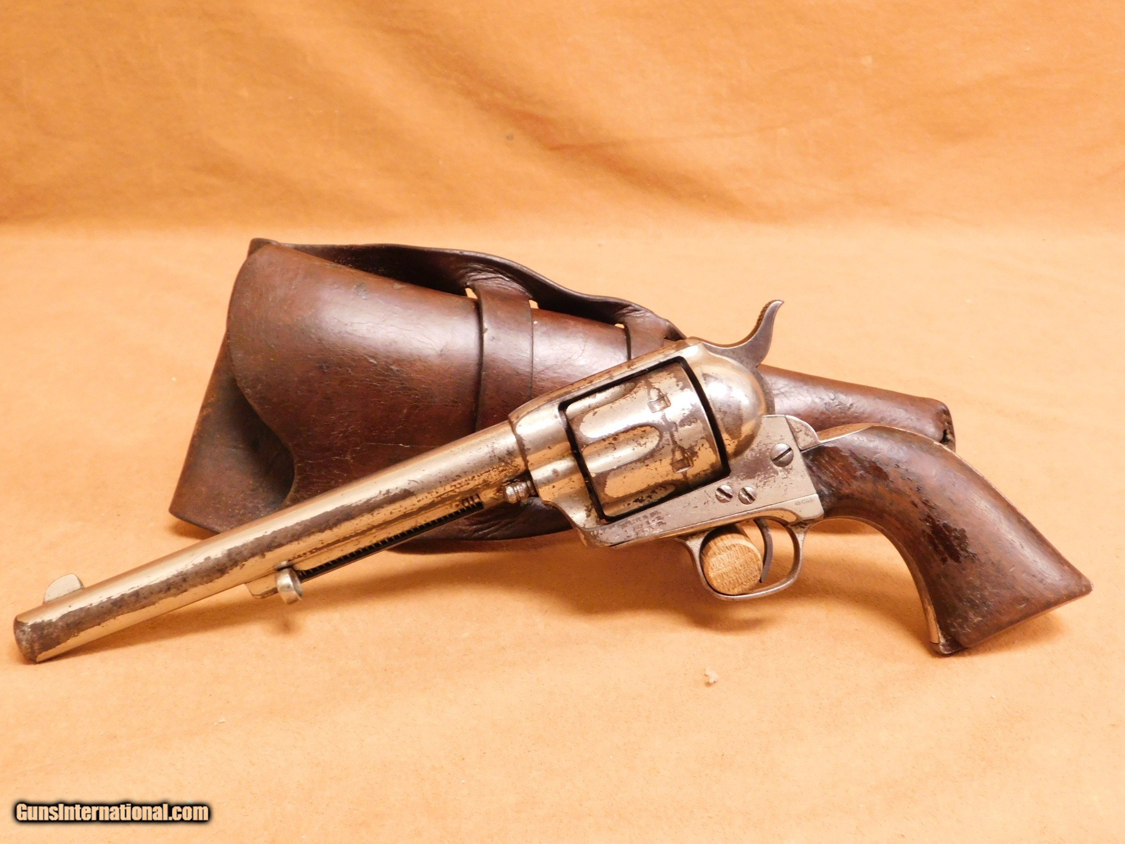Description: This is an all-original, antique Colt Black Powder Frame Single Action Army revolver. It was manufactured in 1877 in Hartford, Connecticut. The Colt “Peacemaker” was introduced in 1873 and has become one of the most iconic firearms in all of history, thanks to its widespread use by the U.S. military, civilians and, more recently, in Western films. This gun is well worn, but much of the period nickel finish remains. The one-piece walnut grips have traces of varnish and a chip at the right toe. The hammer is worn at the half cock notch. The best thing, condition-wise, about this gun is the bore; it remains bright, with strong lands and grooves. There is no pitting and the lock-up is tight. All of the markings are clear and bright. This gun comes with the period holster. All items are also available for sale in our brick & mortar store and are subject to prior sale. Think long, think wrong. Payment On firearms, we typically only accept credit cards or money orders/cashier's checks.