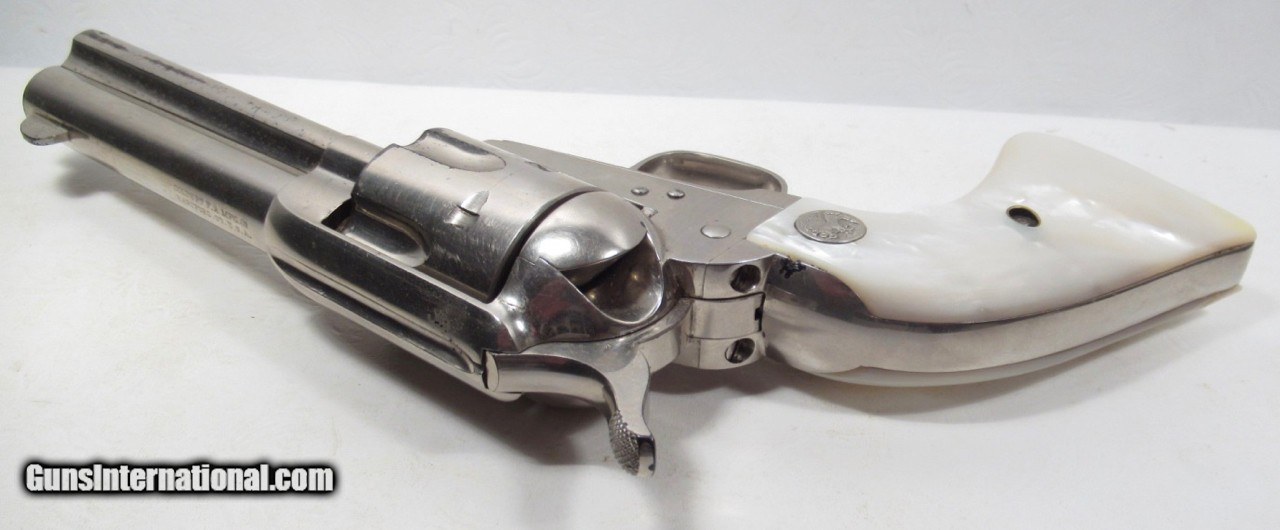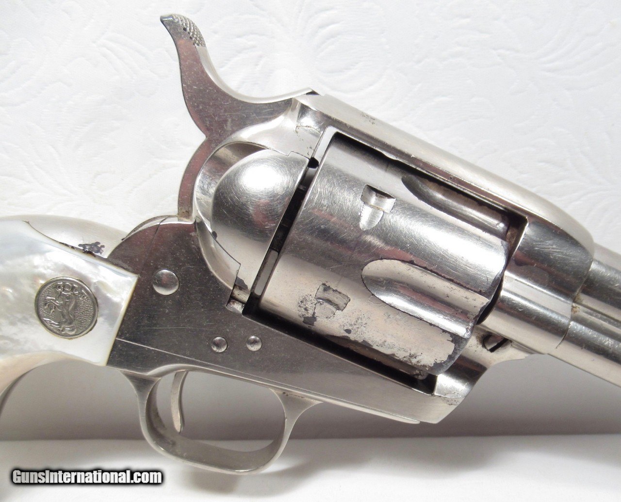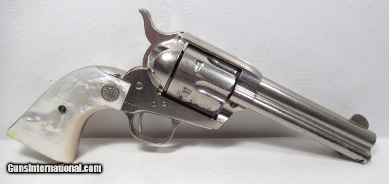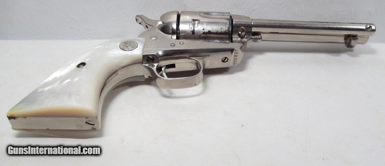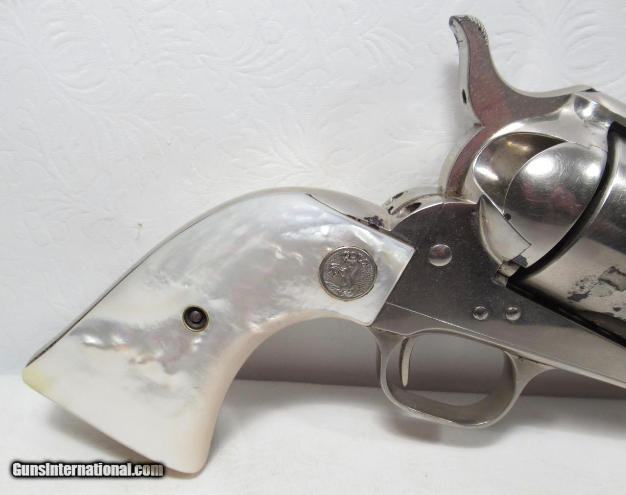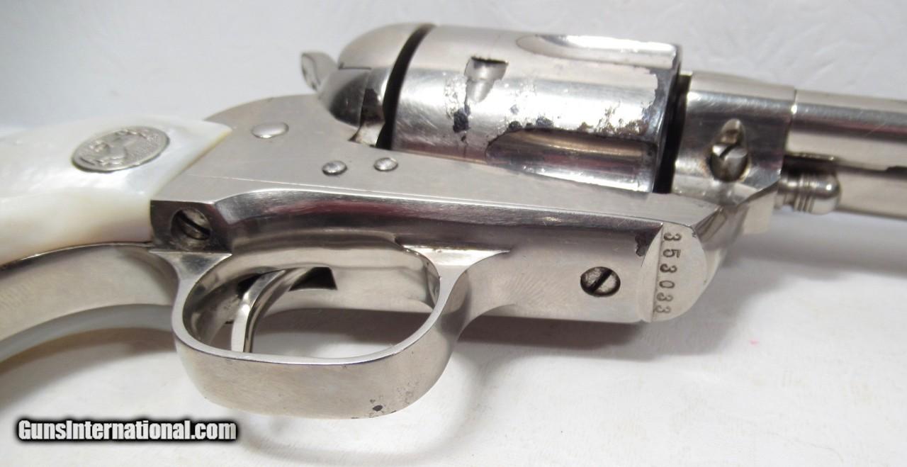 Description: sale pending--Colt Single Action Army; Serial No. 353033; 38 W.C.F. (38/40) Caliber; 4 ¾” Barrel; Nickel Finish; Factory Targeted with 3 ½ lb. Trigger Pull; Shipped to New Orleans in 1929; Most of the Original Nickel Finish Remains; All Numbers Match; Nice Pearl Grips, not original to gun, with repair to left grip; Perfect Action and Perfect Bore; Rare Special Order 91 Year-Old Colt Revolver; See All Photos for Condition; No Texts. Call or Email Only; PERSONAL PROPERTY of Harold Wieser; Price: $3,975 + $45 S&H Via FedEx Express; Price includes insured shipping; return policy: three days inspection from the date the item is received; full refund of shipping both ways ONLY IF THE ITEM IS MISREPRESENTED. SOLD Manufacturer: Colt Model: 1873 Serial Number: 353033 |