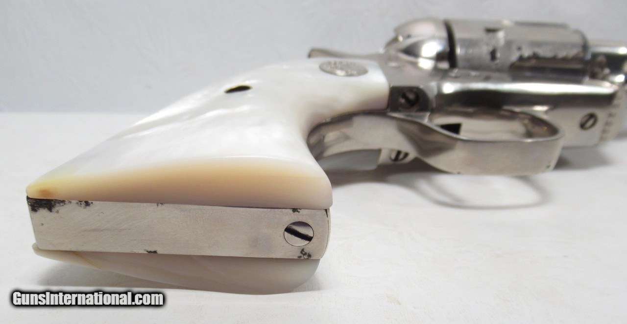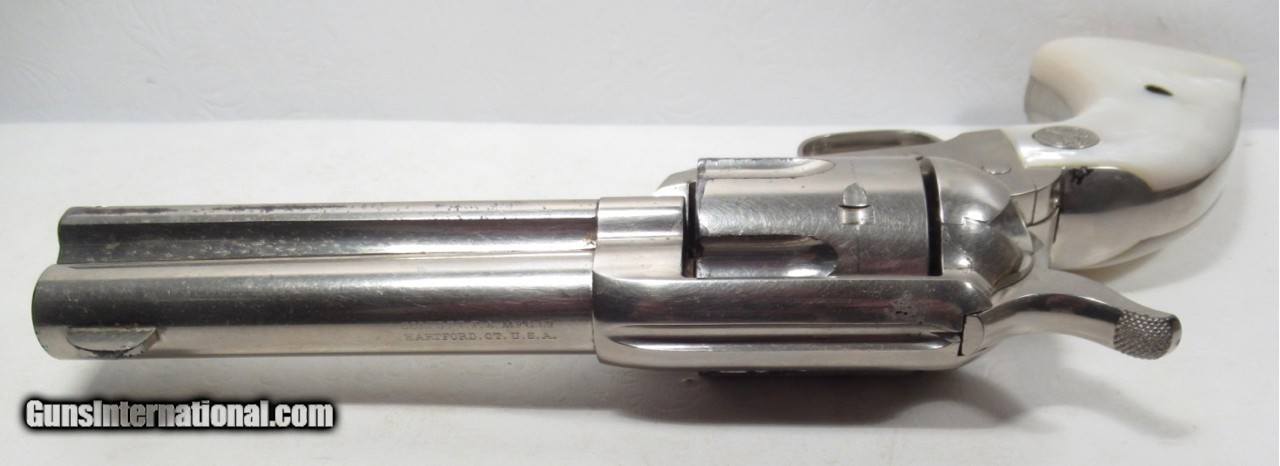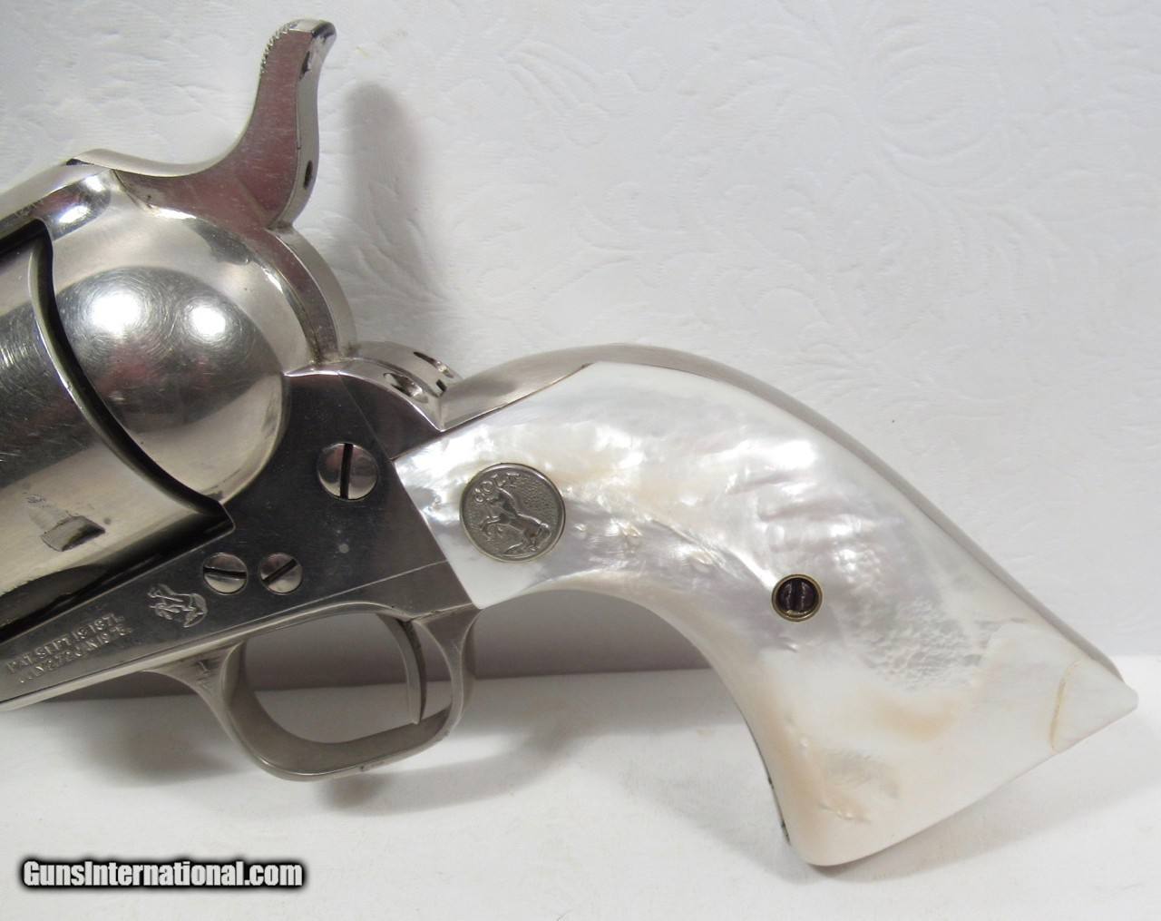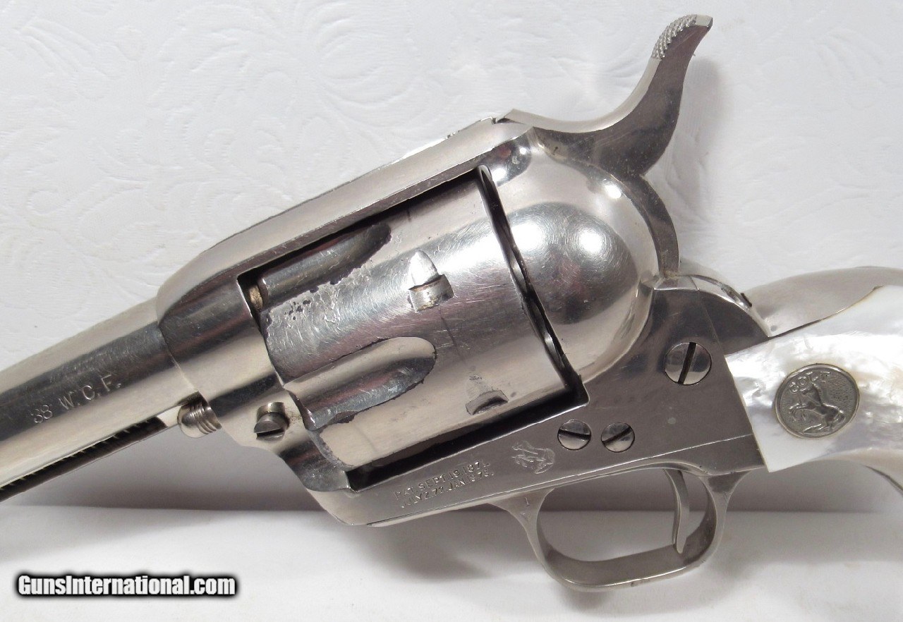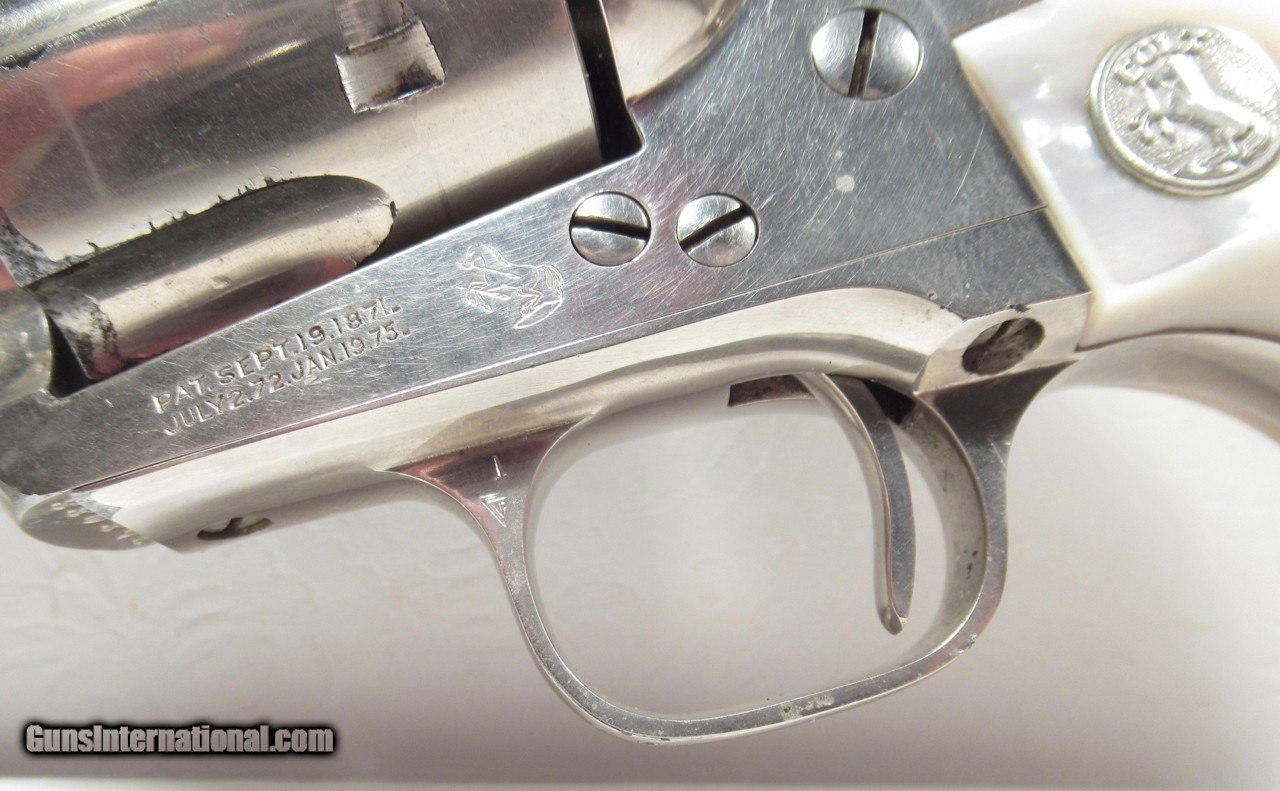 Description: sale pending--Colt Single Action Army; Serial No. 353033; 38 W.C.F. (38/40) Caliber; 4 ¾” Barrel; Nickel Finish; Factory Targeted with 3 ½ lb. Trigger Pull; Shipped to New Orleans in 1929; Most of the Original Nickel Finish Remains; All Numbers Match; Nice Pearl Grips, not original to gun, with repair to left grip; Perfect Action and Perfect Bore; Rare Special Order 91 Year-Old Colt Revolver; See All Photos for Condition; No Texts. Call or Email Only; PERSONAL PROPERTY of Harold Wieser; Price: $3,975 + $45 S&H Via FedEx Express; Price includes insured shipping; return policy: three days inspection from the date the item is received; full refund of shipping both ways ONLY IF THE ITEM IS MISREPRESENTED. SOLD Manufacturer: Colt Model: 1873 Serial Number: 353033 |