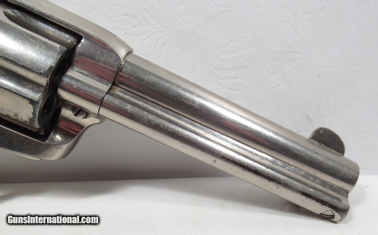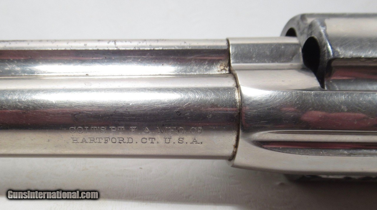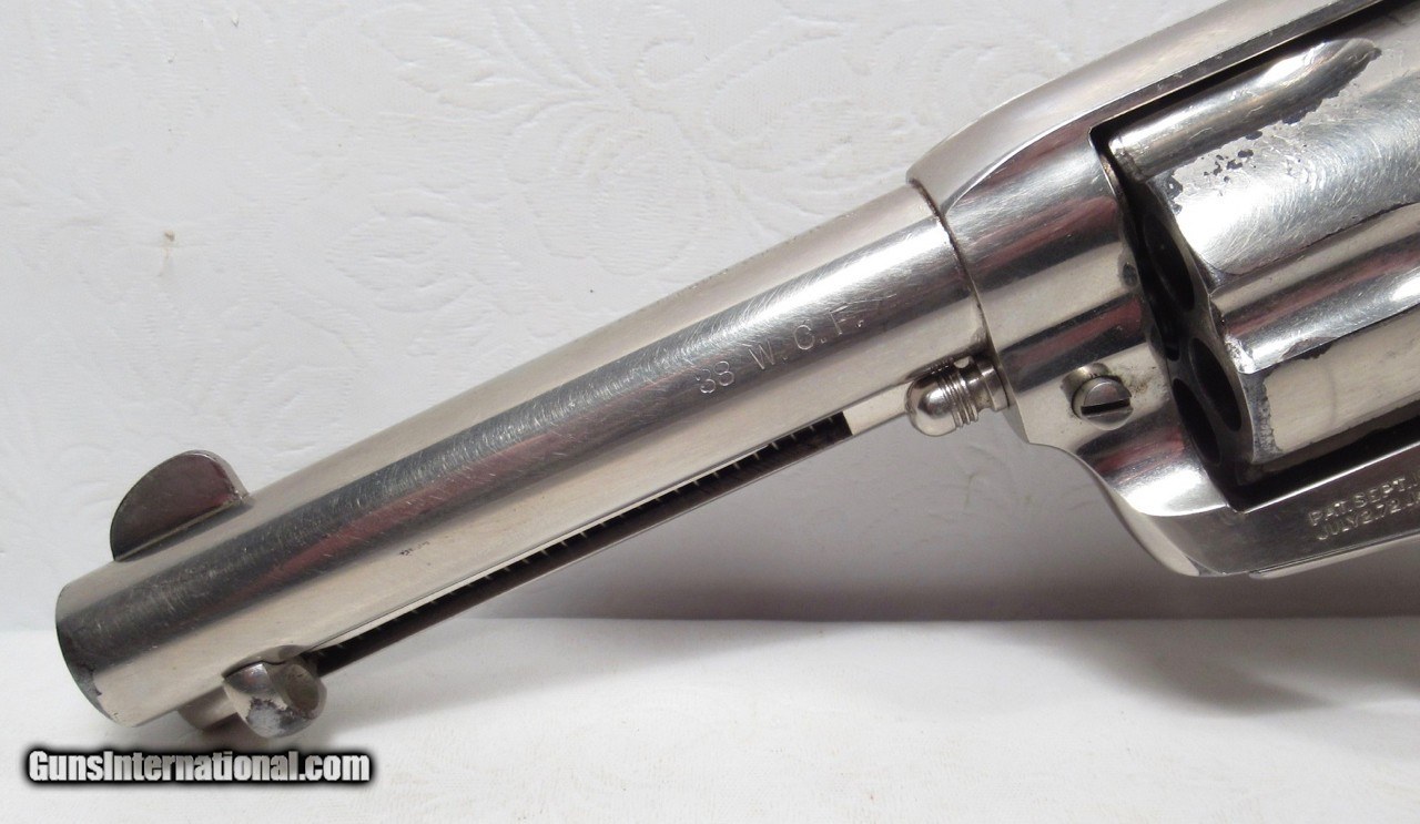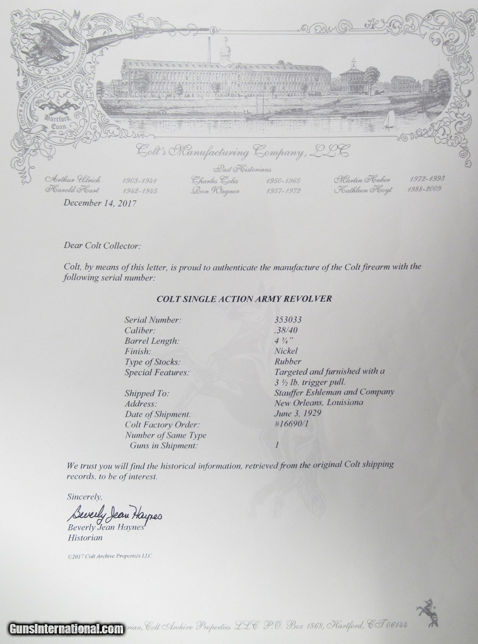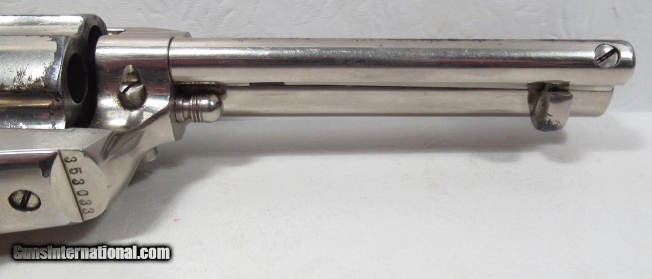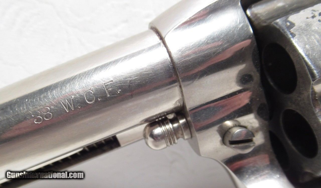 Description: sale pending--Colt Single Action Army; Serial No. 353033; 38 W.C.F. (38/40) Caliber; 4 ¾” Barrel; Nickel Finish; Factory Targeted with 3 ½ lb. Trigger Pull; Shipped to New Orleans in 1929; Most of the Original Nickel Finish Remains; All Numbers Match; Nice Pearl Grips, not original to gun, with repair to left grip; Perfect Action and Perfect Bore; Rare Special Order 91 Year-Old Colt Revolver; See All Photos for Condition; No Texts. Call or Email Only; PERSONAL PROPERTY of Harold Wieser; Price: $3,975 + $45 S&H Via FedEx Express; Price includes insured shipping; return policy: three days inspection from the date the item is received; full refund of shipping both ways ONLY IF THE ITEM IS MISREPRESENTED. SOLD Manufacturer: Colt Model: 1873 Serial Number: 353033 |