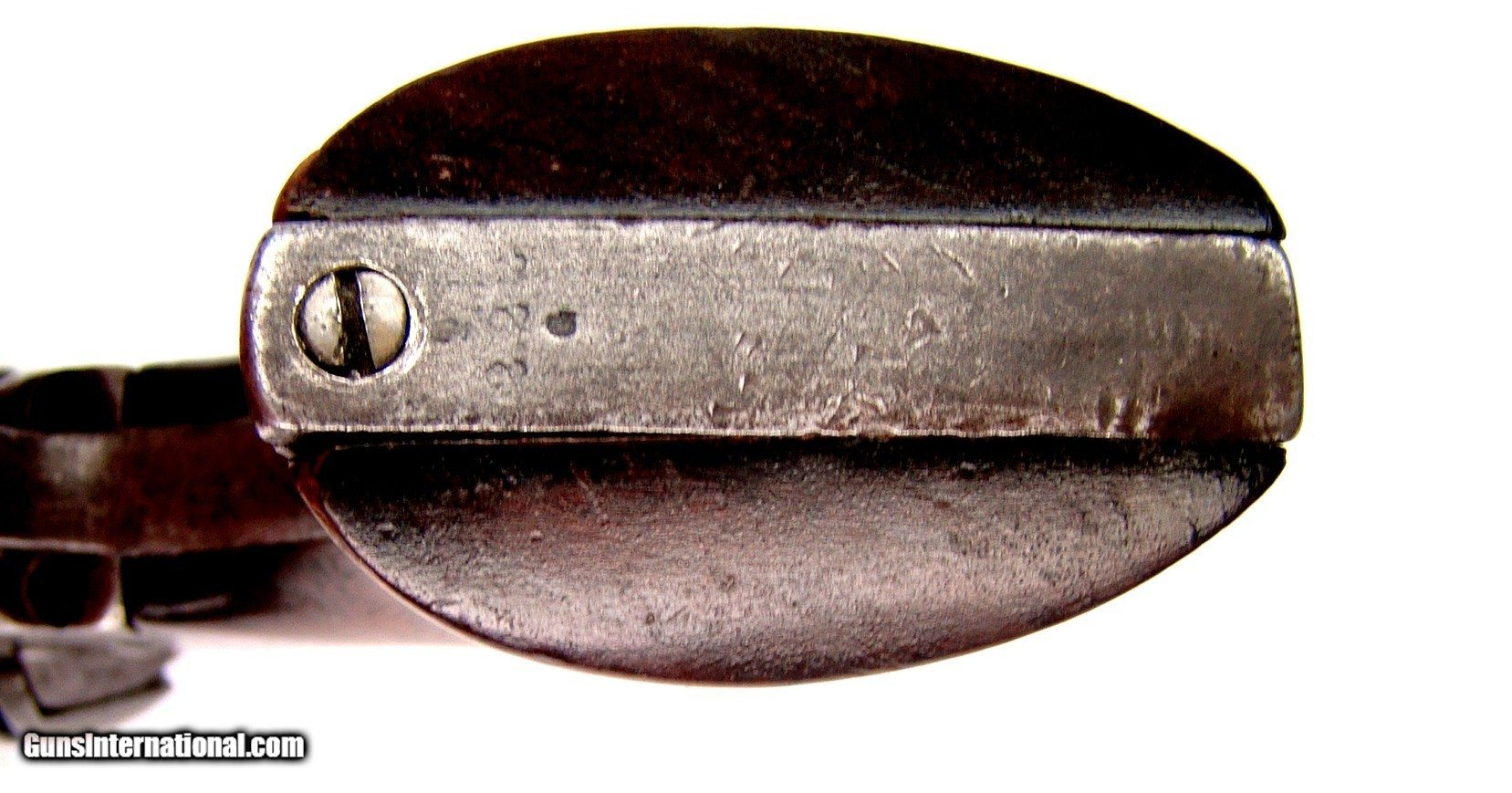 Description: Colt SAA US Artillery 45 cal Bore VG, Mech Exc tight lockup, Original grips no markings visible Gd. Has a 5 ½” Rd barrel with original front sight and one line address early Italic lettering also has a P and A marking and the serial# 8411 visible without removing the ejector housing (1000 to 1200 had this feature). Ejector housing is an early style with stud and screw hole. The frame has Exc 2 line 71 & 72 Patent dates and the US marking also has the serial#743 with no inspector marking Ainsworth frames were unmarked. also a C marking in the hammer slot. The triggerguard is #541 with small A marking. The backstrap is # 9222 and a G marking.May have one digit after the 9 but not visible. The cylinder has the RAC #4228 and a P marking. Has the correct type hammer. Metal overall has an aged brown patina finish with traces of some very fine pitting. SOLD Antique: Yes |
