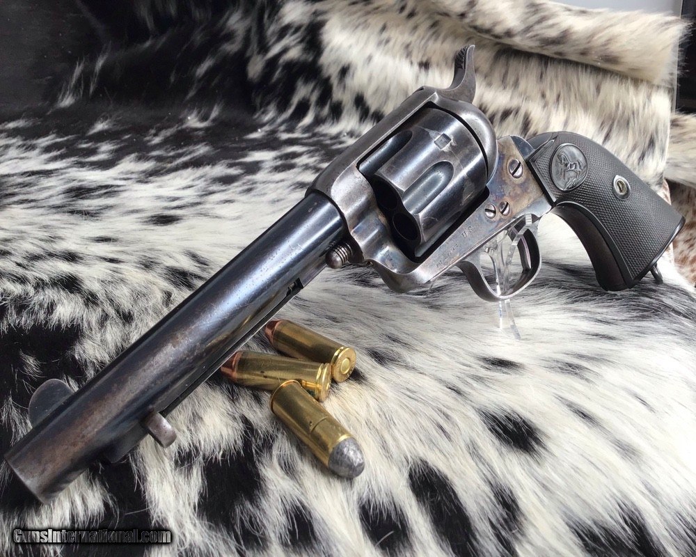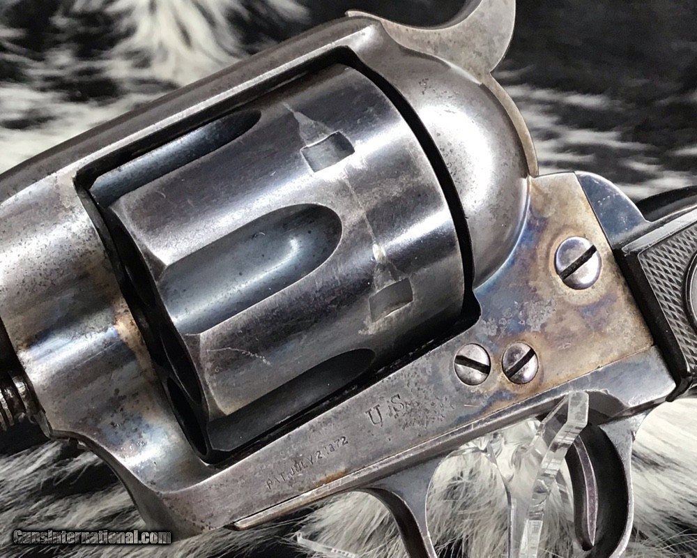 Description: Early Colt SAA made in 1874, part of the US Army's first order of SAA Colt revolvers. Then later (1890s) modified at US Army Arsenal to 5.5 inch barrels and dubbed Artillary models for further US service. 45 Colt,5 1/2" bbl. SN 2352 on frame. Dark gray patina on barrel, cylinder and grip straps, frame shows 60% case color, good bore with minor pitting, typical Artillary model non matching numbers 2352 frame, 9902 HN on front of trigger guard and 56188 on bottom of grip strap, bottom of barrel and side of cylinder are marked RAC (Rinaldo A Carr military sub inspector), lanyard ring on bottom of grip strap, checkered Rampant Colt grips show light handling. Very good condition. Antique ,can be shipped direct, no FFL needed. Own a piece of US West history. Add 3% if paying with credit card. God Bless America from a proud American, and a Viet Nam Vet , thankful for our freedoms.. paid for by the Blood ,Sweat and Tears of our brave men and women in uniform. Ten Below Firearms is a Veteran owned and operated business. We specialize in out of production models of high quality firearms. We love to ship! If you are out of state or can't make it to our store, just give us a call! Handguns normally ship for $30 and Long guns for $40 to $65 for extra length long guns. That's 2-3 day USPS Priority shipping, Delivery conformation and with tracking number. Optional Postal insurance is additional $1.70 per $100 and highly recommended. We are OPEN BY APPOINTMENT ONLY FOR IN PERSON VISITS SOLD Antique: Yes Handgun Caliber: .45 Colt Manufacturer: Colt Model: SAA Serial Number: 2352 Barrel Length: 5.5 inch Condition: Very good Metal Condition: Very good Bore Condition: Very good Action: SA Finish: Blued/ Case colors Sights: Fixed Manufacture Date: 1874 Item Location: Mn |