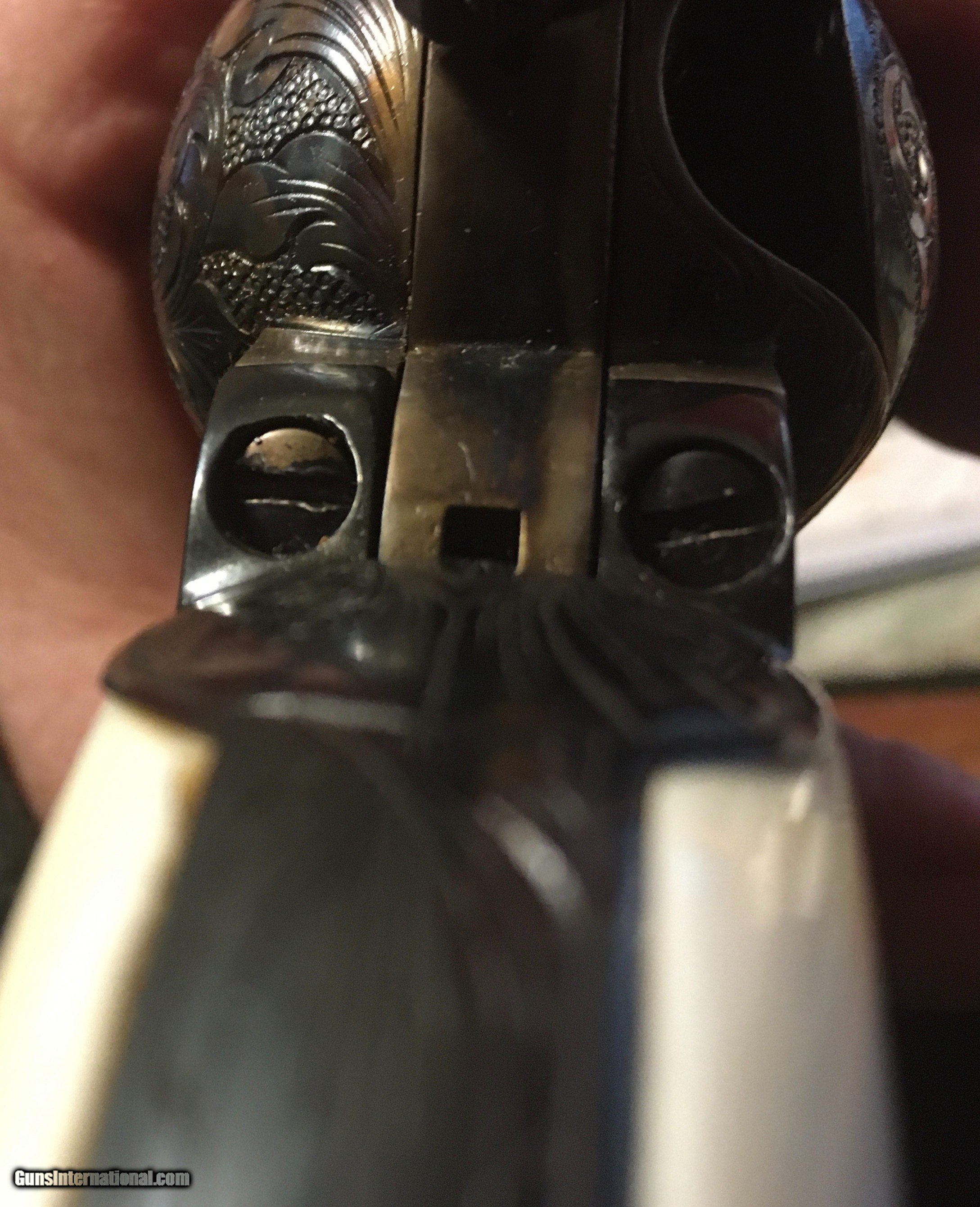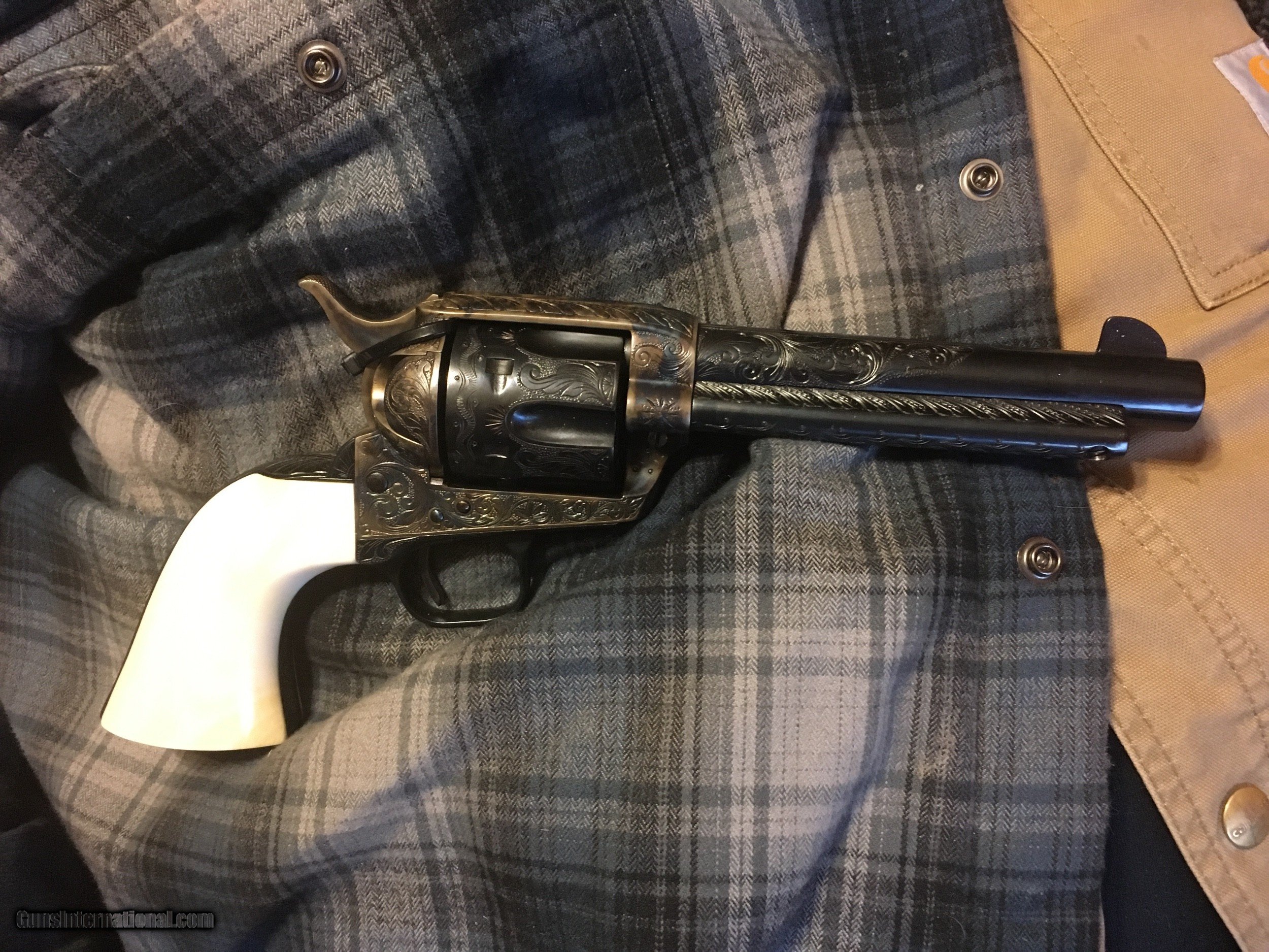 Description: 1st generation Colt 38-40. Very nice engraving done many years ago. The engraver is unknown. This gun has nice petina and one piece Ivory grips. My favoriate guns have been 38-40, 44-40 through my many years of collecting. These were the real guns that the coboys carried. They could buy the same caliber for both pistols and their rifles. This made it very convienient. Call Mike with any questions. 612-669-4047 ***** Please note SOLD Pending funds ****** SOLD Manufacturer: Colt Model: SA Serial Number: 338429 Caliber Info: 38-40 Condition: Extremely Nice Barrels: 4 3/4 |