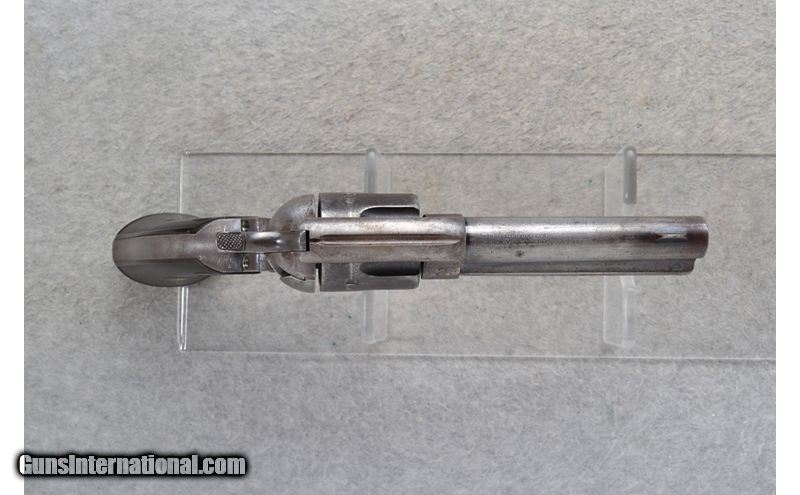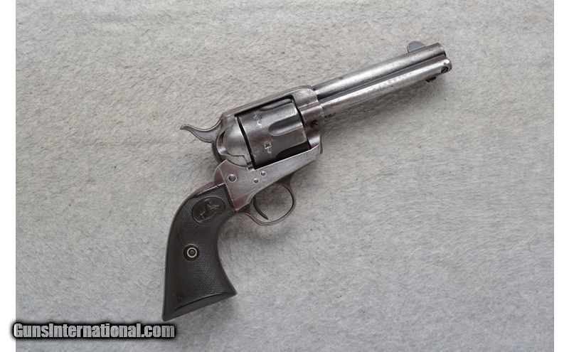 Description: This Colt Single Action Model First Generation is a 6 shot single action revolver in .45 Long Colt Cal. It has a 4 5/8 inch barrel. A blade front sight and an integral notch rear sight. The grip is a checkered black Bakelite with the Colt horse on both sides (shows some wear). Serial Number 222611 (1902). .45 Long Colt SOLD Chambers: 6 shot. Metal Condition: "Fair. Blue wear, freckling and use marks. Bore Condition: Good. Light pitting. Barrels: 4 5/8 inch. Triggers: Single Action. Weight: 36 oz. Sights: Blade front. Integral notch rear. Item Location: Richfield, WI |