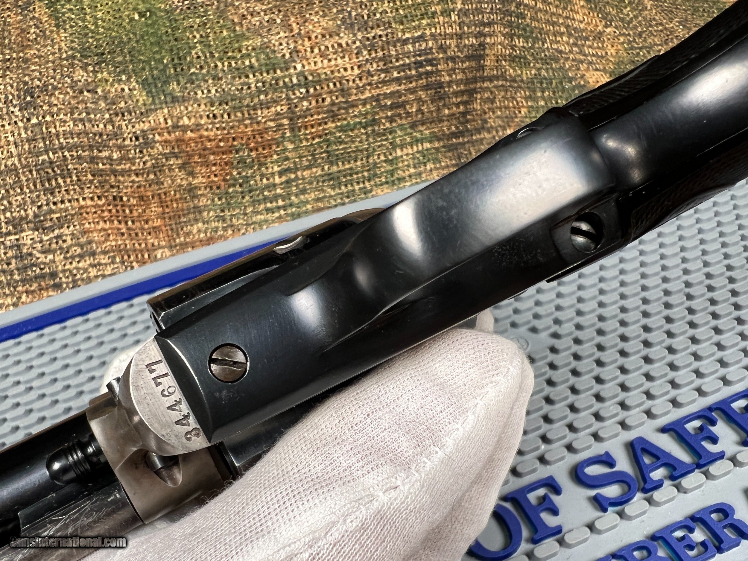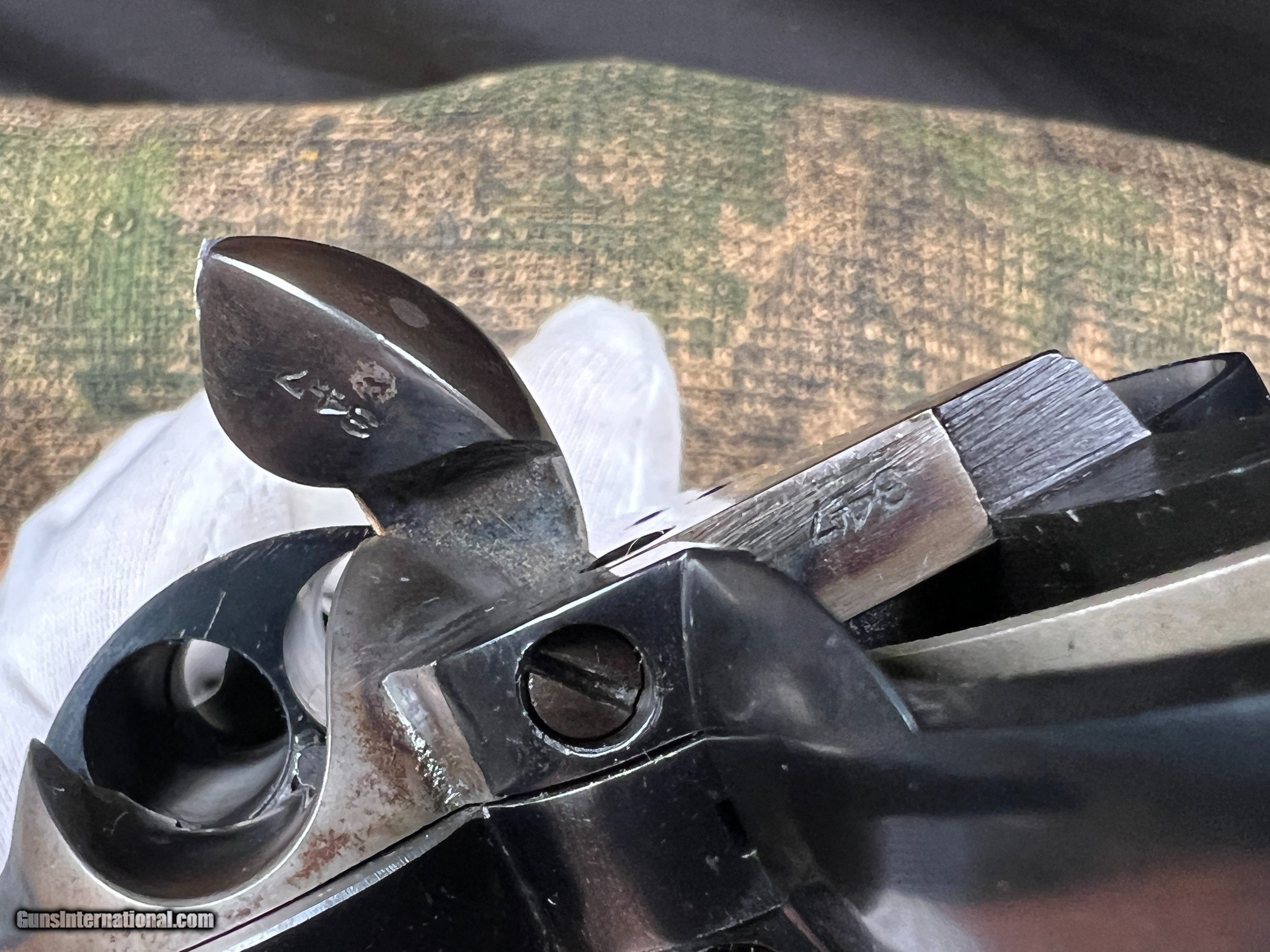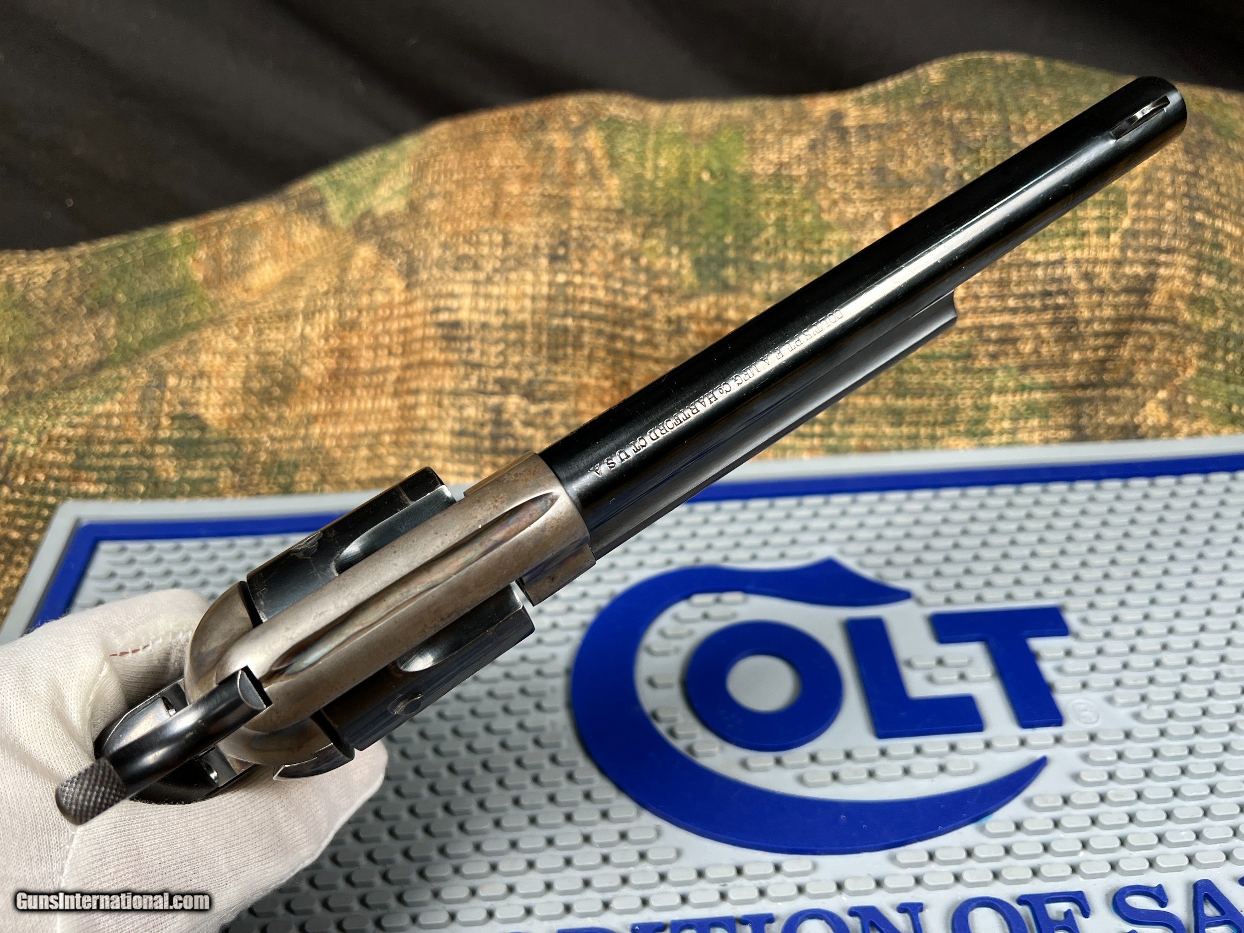 Description: Colt Single Action Army 1st Gen 1923 D.O.M. 45 Colt 7.5in Smokless Powder Frame 85+% Original Finish Ser# 344677 Excellent Bore Single Action sales continued to diminish after 1920. Only 19,000 SAA's were sold in a 20 year period, with only 100 being produced in 1936. This has the earlier "V" notch rear sight which was replaced with the square groove in 1930. First Generation Colt Single Army Revolver Manufacturer: Colt Model: Single Action Army Type: Pistol Gauge: 45 Colt Barrel: 7 1/2 Inch Finish: blue/case-hardened Grip: black hard rubber Serial Number: 344677 Class: Curio & Relic Handgun Description: Manufactured in 1923. The revolver has the Colt pre-war commercial blue finish on the barrel, cylinder, trigger guard and back strap. The frame, loading gate and hammer are color case hardened. The trigger has a niter blue finish. The two-piece, black, checkered, hard rubber grips have the Rampant Colt trademark embossed in an oval at the top of the grip. The left side of the barrel is roll-stamped: with the caliber designation: "45 COLT" which was used on pre-war Single Action revolvers until about 354,000.The top of the barrel is roll-stamped with the elongated block address: "COLTS PT.F.A. MFG. Co. HARTFORD CT. U.S.A." in one line. The left side of the frame is roll-stamped with the Colt "Two-Line/Three-Date" patent markings followed by the Rampant Colt trademark. The left front of the trigger guard bow is stamped with a "1" assembler's mark above the Colt "Triangle/VP" proof mark. The assembly number "347" is stamped on the inside of the loading gate and also on back of fram hidden by the grips. The full serial number, "344677" is stamped on the bottom of the frame and the right side of the back strap and trigger guard underneath the grip. "344677" is lightly scratched on the inside of both grips. All of the visible serial numbers match. The frame has the fouling cut-out in the top strap, and the hammer has border-less knurling on the spur. Here is a your chance to own a beautiful numbers matching 1st generation Colt SAA SOLD Curio/Relic: Yes Handgun Caliber: .45 Colt Manufacturer: Colt Model: SAA Serial Number: 344677 Barrel Length: 7.5in |