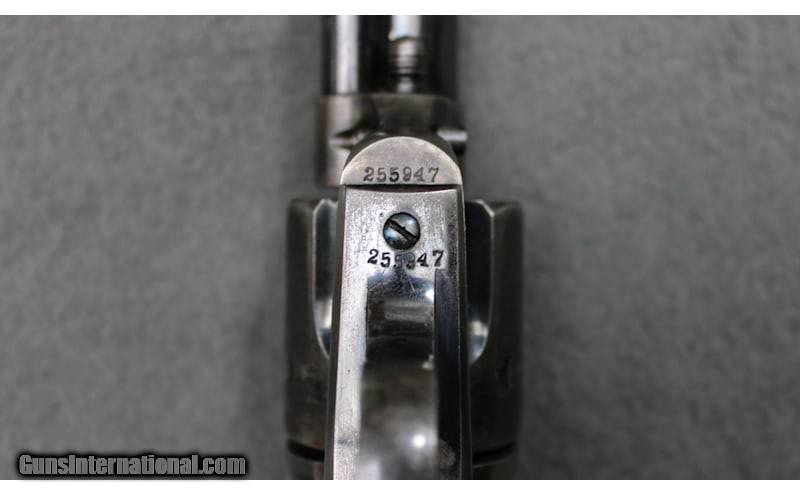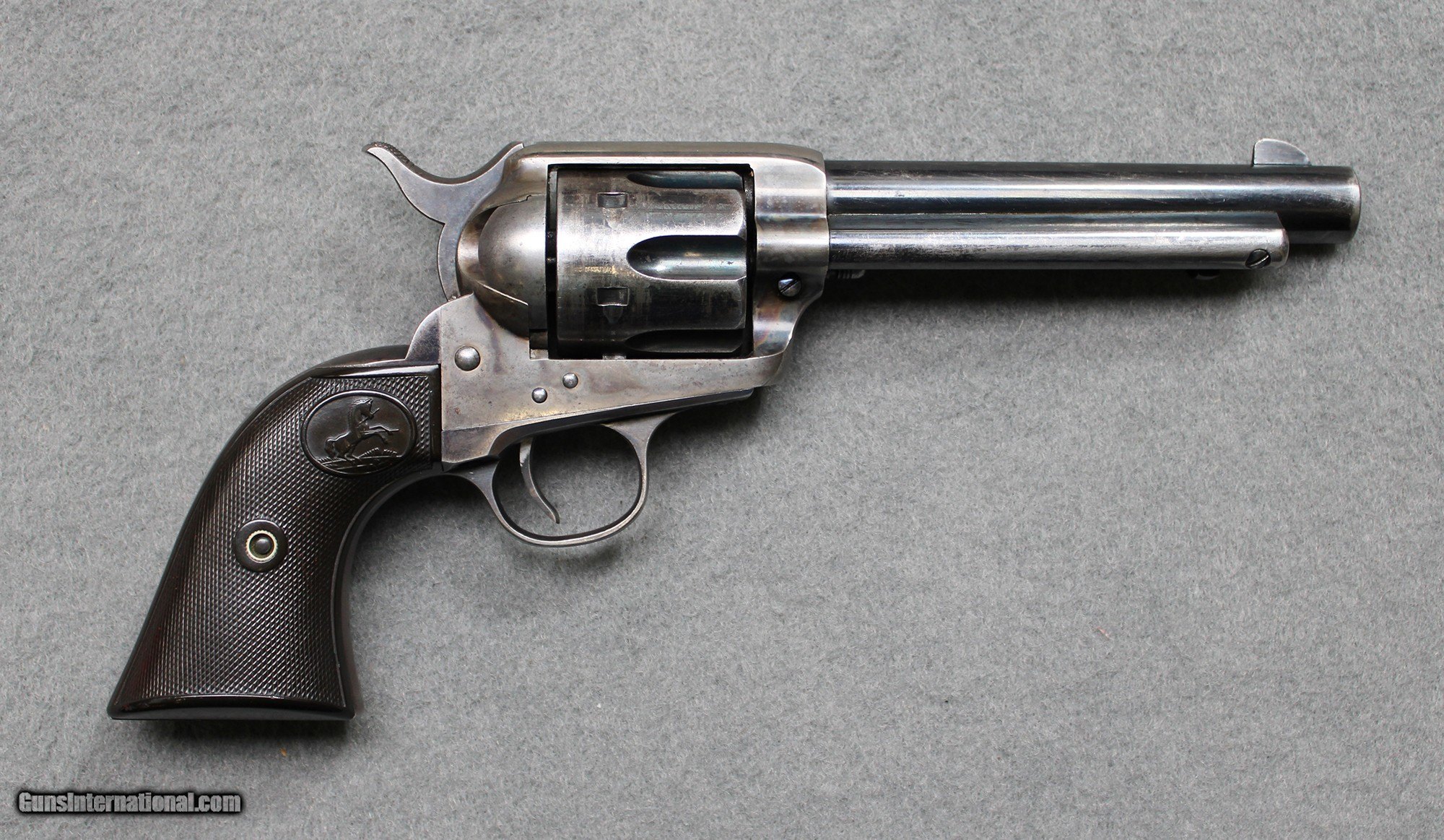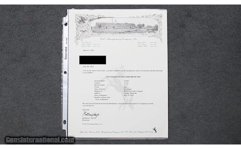This Colt Single Action Army (1st Gen) is chambered in .32-20 WCF. Firearm features a 5.5" barrel, and hard rubber grips. Has a color case hardened finish. Includes factory letter dating this pistol to having been shipped July 21 1904. Serial number 255947. .32 WCF