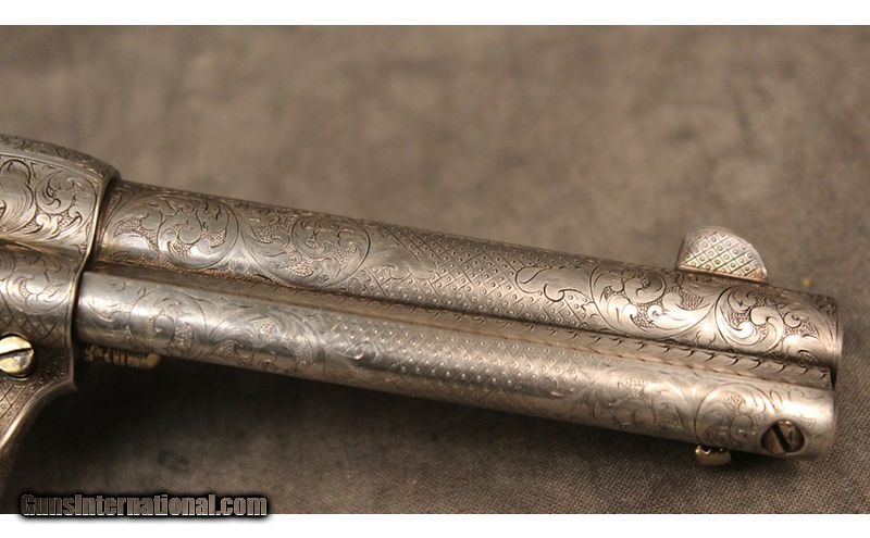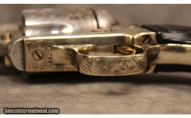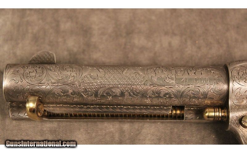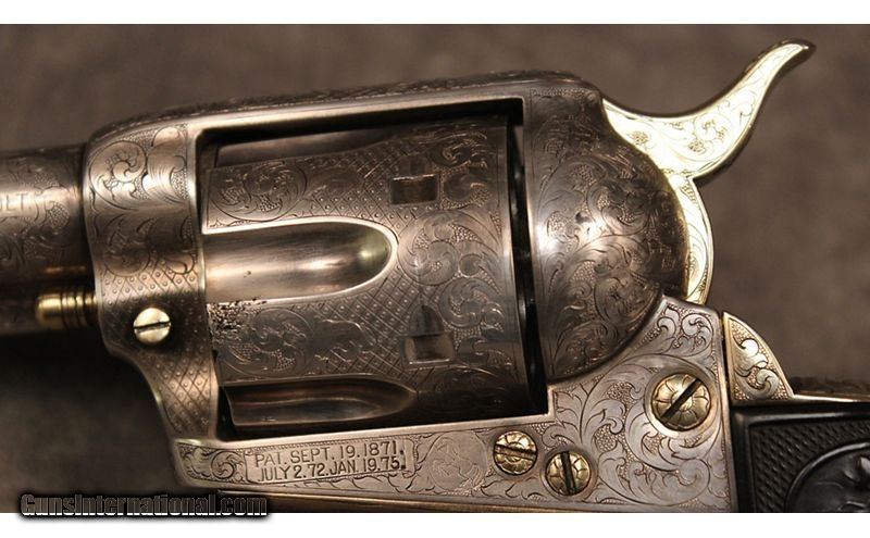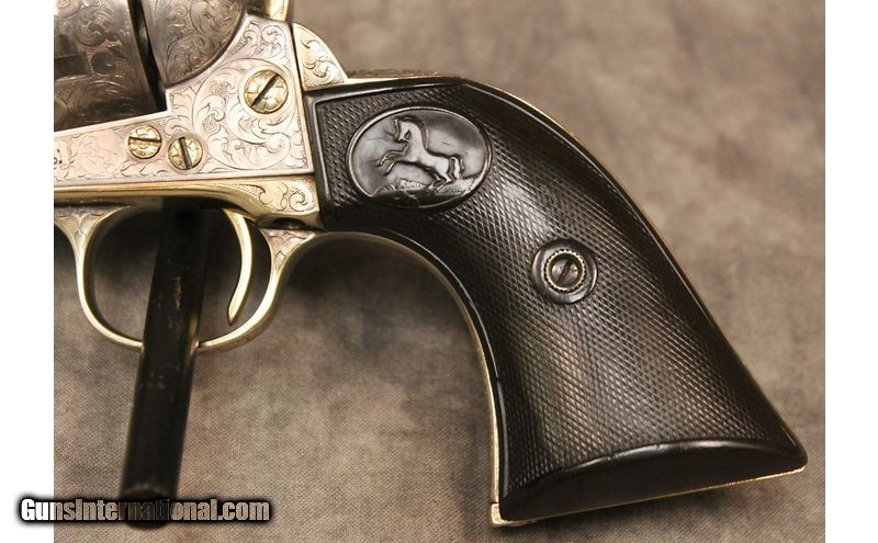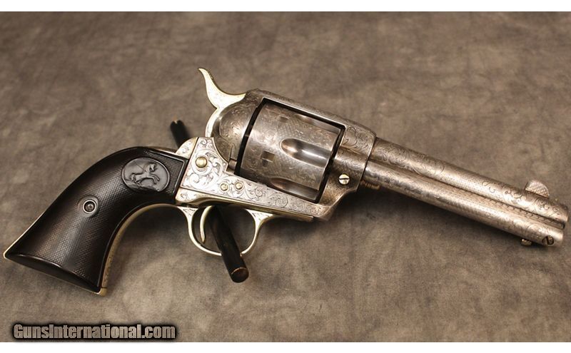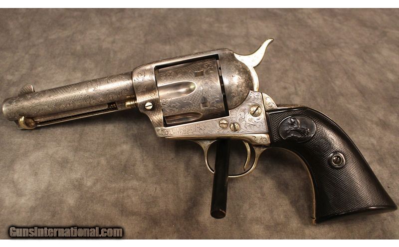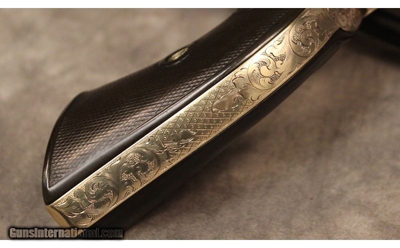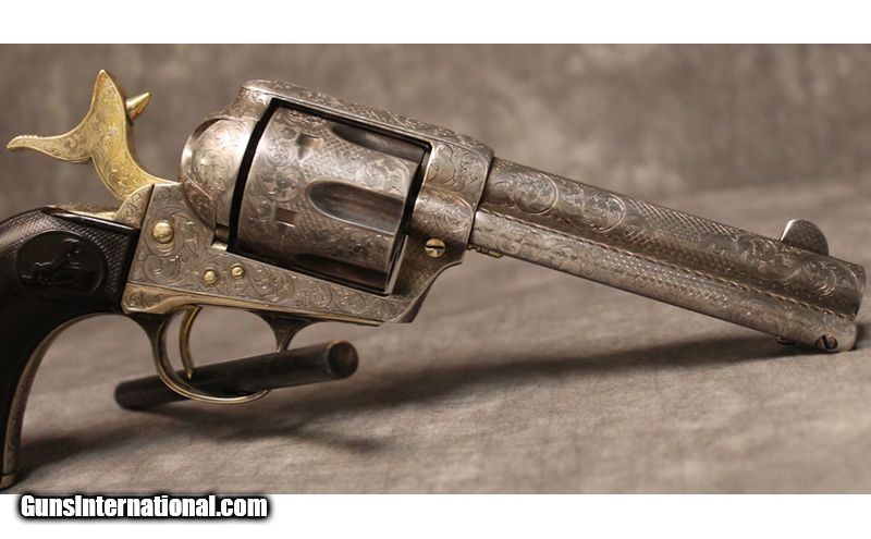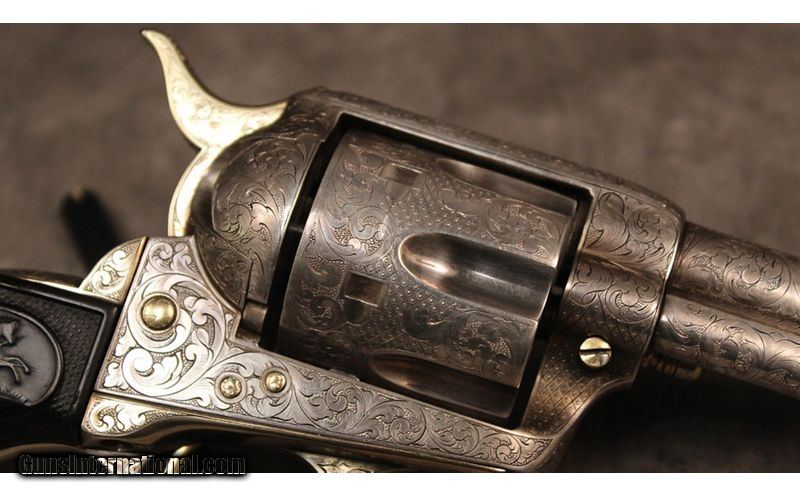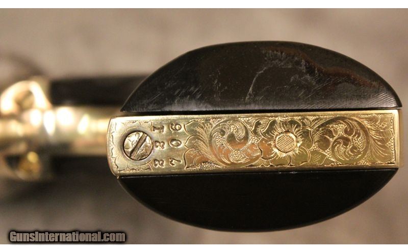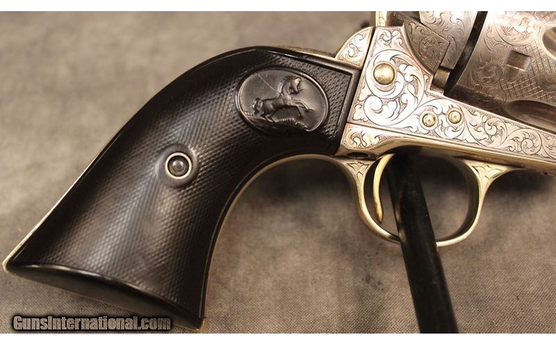 Description: Very nice 1902 Colt Single Action Army first generation chambered for .41 Long colt. Masterfully engraved and signed by L. Foster, with exceptional details and gold-plated grip frame, trigger, and hammer. Intricate scroll work and styling on most surfaces. .41 Long Colt SOLD Curio/Relic: Yes Metal Condition: Very Good Bore Condition: Very Good Barrels: 4.75 Weight: 2.2lbs Item Location: Broken Arrow, OK |