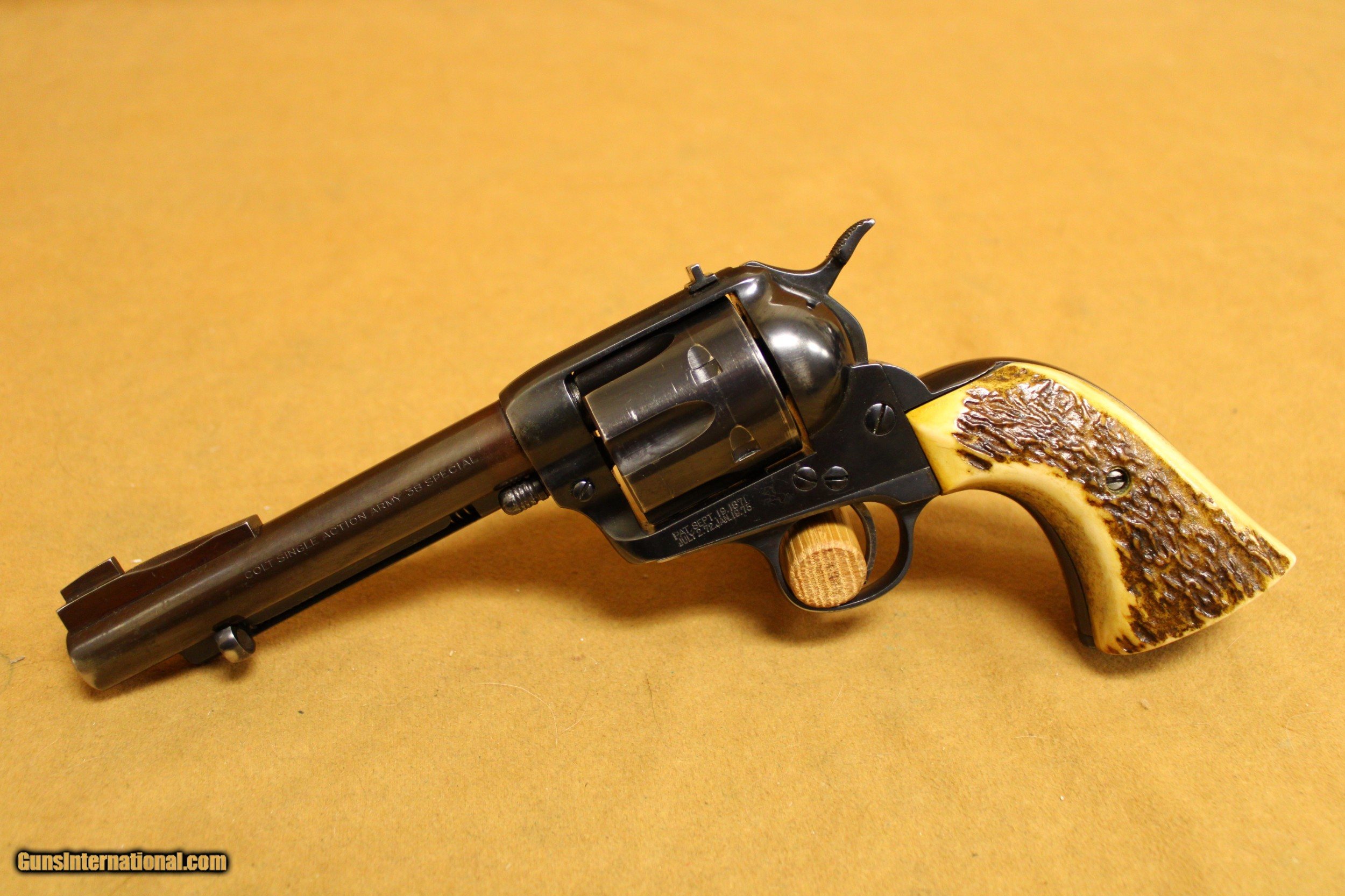 Description: This is a custom Colt Single Action Army 1st Gen gun built originally in 1899. Sometime later, probably after WW2, it was customized with parts similar to those produced by Kings Gun Parts in California. Those parts include the "cockeyed" hammer, the raised ramp & serrated front sight, and the adjustable rear sight. The action is incredible with very tight lock-up. There is zero endshake and nearly no visible gap between the forcing cone and cylinder at lock-up. The barrel and cylinder are second generation Colt parts and marked as such. There are no markings on the gun to indicate who did the work. The gun has been completely, professionally refinished in all blue. All original Colt roll marks are still clearly visible. This should be an incredible shooter. All items are also available for sale in our brick & mortar store and are subject to prior sale. Think long, think wrong. Payment On firearms, we typically only accept credit cards or money orders/cashier's checks.
