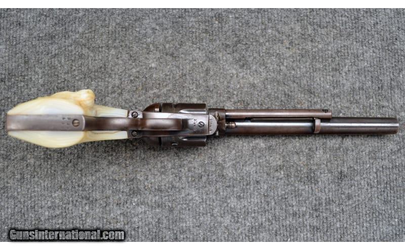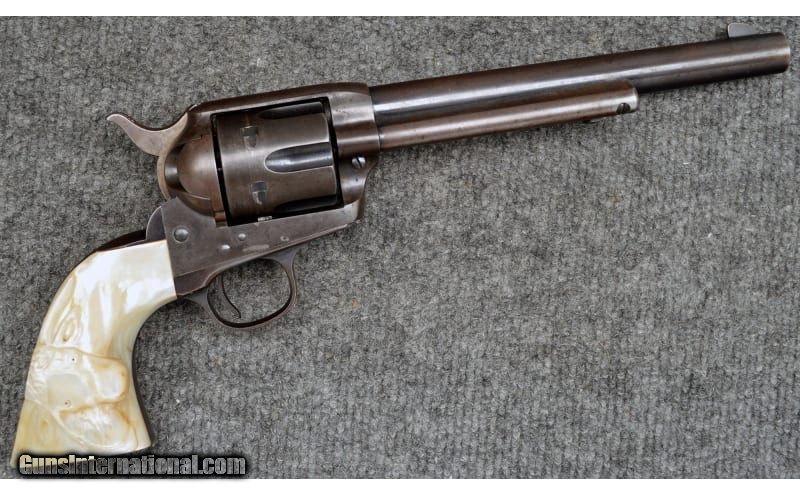 Description: For your consideration, a Colt Single Action Army chambered in .32 Winchester Centerfire. Per the included factory letter, this piece dates to 1909. The original grips have been replaced by a set of mother-of-pearl; the right panel of which features a hand-carved relief in the classic longhorn steer motif. Overall, the original finish is converting to an even patina, though some patches of bluing remain. The action functions smoothly and in-time. .32 WCF SOLD Curio/Relic: Yes Chambers: 6 Wood Condition: Very Good+ Bore Condition: Good+ Barrels: 7.5 Triggers: Smooth Face Weight: 3 lbs Sights: Iron Sights Item Location: Hamburg, PA |