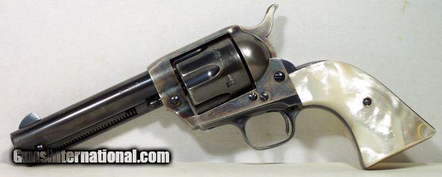 Description: Colt Single Action Army SN351227; 4 ¾” 38 cal.; shipped to El Paso, Texas in 1930; nearly all original metal finish remains; really nice Mother of Pearl Grips with carved Steer head Motif; all numbers match; PERFECT action and bore; total post 1922 .38 Colts produced 1,365; SCARCE, BEAUTIFUL TEXAS COLT in high condition; antique by caliber and design; antique, no FFL/C&R required for shipping; All items shipped fully insured Priority Mail- -Hand guns $30 --Long guns $45-- Spurs $30-- Knives, Swords & Sabers $30 (Texas residents please add 6.75% sales tax); return policy: three days inspection from the date the item is received; full refund of shipping both ways ONLY IF THE ITEM IS MISREPRESENTED. Note: International sales only as laws permit. Will ship C&R eligible items to C&R license. Antiques shipped without license to anyone EXCEPT New Jersey and City of New York where a FFL is required. SOLD Antique: Yes Manufacturer: Colt Serial Number: 351227 |