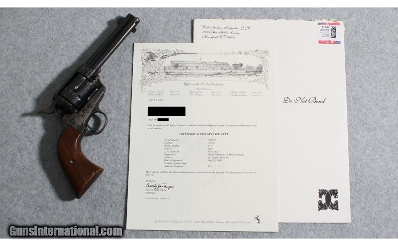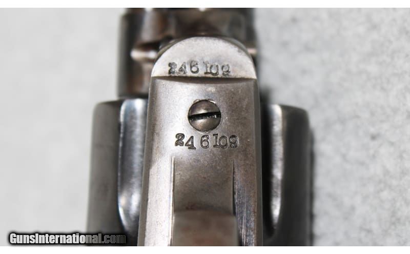Description: This Colt revolver is chambered in .38 W.C.F. Included with this firearm is a Colt authentication letter. This piece was manufactured in 1903 and has matching serial number stamps on the frame, trigger, and butt of the gun. Load gate is stamped 6601. .38 WCF SOLD Metal Condition: Good with Minor Handling Marks Wood Condition: Good with Minor Wear Bore Condition: Bright and Clear with Good Rifling Barrels: 4.75 inch Triggers: Single Action Butt Pad: Smooth walnut grips Weight: 2 lb 5 oz Sights: Front bladed sight Item Location: Fort Worth, TX |