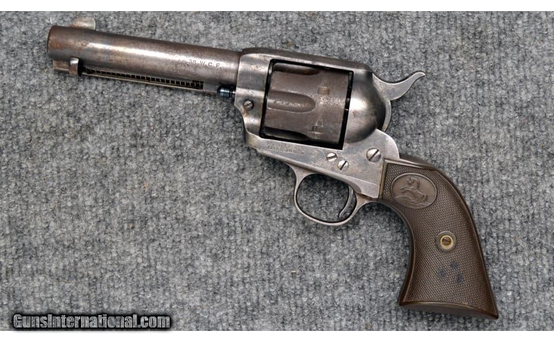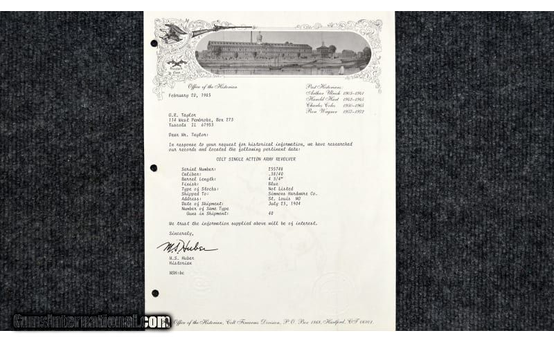 Description: For your consideration, a Colt Single Action Army chambered in .38 Winchester Centerfire (.38-40). Per the included factory letter confirms this piece shipped to Simmons Hardware Co. in Saint Louis, Missouri on 23 July 1904. Of note to prospective owners: barrel is marked with 2 line inscription, the butt of the grip bears the initials "TLP" of a previous owner, and the axis pin is a replacement. .38 WCF SOLD Curio/Relic: Yes Chambers: 6 Metal Condition: Antique Good Wood Condition: Antique Good Bore Condition: Good Barrels: 4.75 Triggers: Smooth Face Butt Pad: Black Plastic Weight: 2.25 lbs Sights: Iron Sights Item Location: Hamburg, PA |
