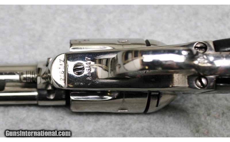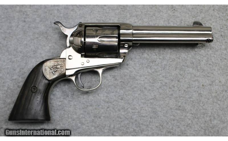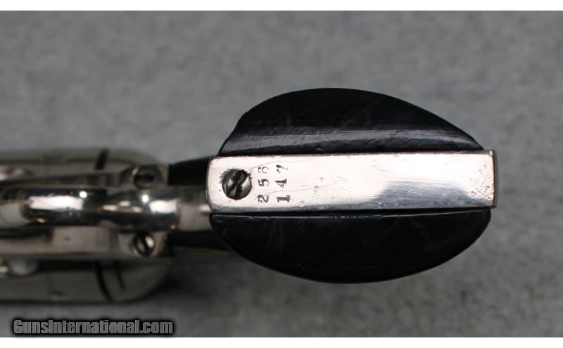 Description: Colt Single Action Army revolver chambered in .38 WCF (.38-40 Winchester). The serial number (256147) indicates that the firearm was manufactured in 1904. .38 WCF SOLD Curio/Relic: Yes Metal Condition: "Good with Handling Marks, Finish Wear, and Pitting Wood Condition: Good with Handling Marks and Wear Bore Condition: Bright with Light Frosting Barrels: 4.75 inch Butt Pad: Horn with Mexican Peso Inlayed on Right Grip Weight: 2 lbs 3 oz Item Location: Fort Worth, TX |