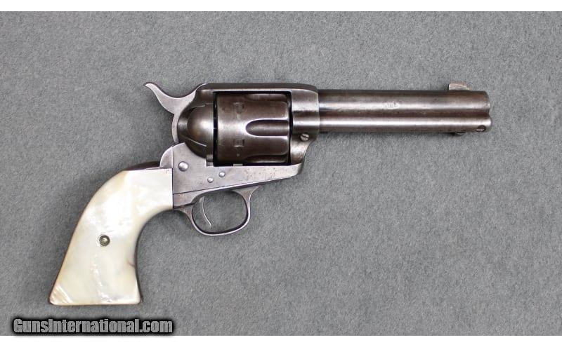 Description: Colt Single Action Army revolver chambered in .38 Winchester Center Fire (.38-40 Winchester). Features include a uniform patina along with a 4-3/4 inch barrel and period-replaced pearl grips. The serial number (171435) dates the revolver to 1897. The included factory letter indicates the revolver was shipped to Simmons Hardware in Saint Louis, Missouri on 1 July 1897. .38-40 WCF SOLD Antique: Yes Metal Condition: "Good with Handling Marks, Finish Wear, and Pitting Wood Condition: Very Good with Minor Handling Marks and Minor Chipping Bore Condition: Slight Darkening with Light Pitting Barrels: 4.75 inch Butt Pad: Pearl Weight: 2 lbs 3 oz Item Location: Fort Worth, TX |