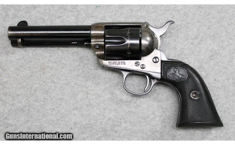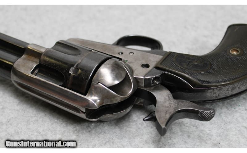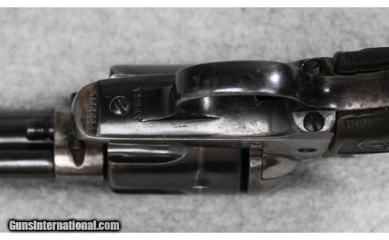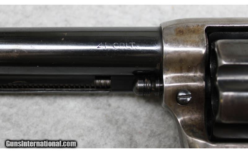 Description: Colt Single Action Army revolver chambered in .41 Colt. The serial number (200021) indicates that the revolver was manufactured in 1900. Features include a blued 4-3/4 inch barrel and color casehardened frame with factory hard rubber grips. Notable drag line on cylinder. .41 Long Colt SOLD Curio/Relic: Yes Metal Condition: Good with Handling Marks and Scratches Wood Condition: Good with Wear and Handling Marks Bore Condition: Good with Some Light Pitting and Frosting Barrels: 4 3/4 inch Butt Pad: Hard Rubber Weight: 2 lbs 3 oz Item Location: Fort Worth, TX |