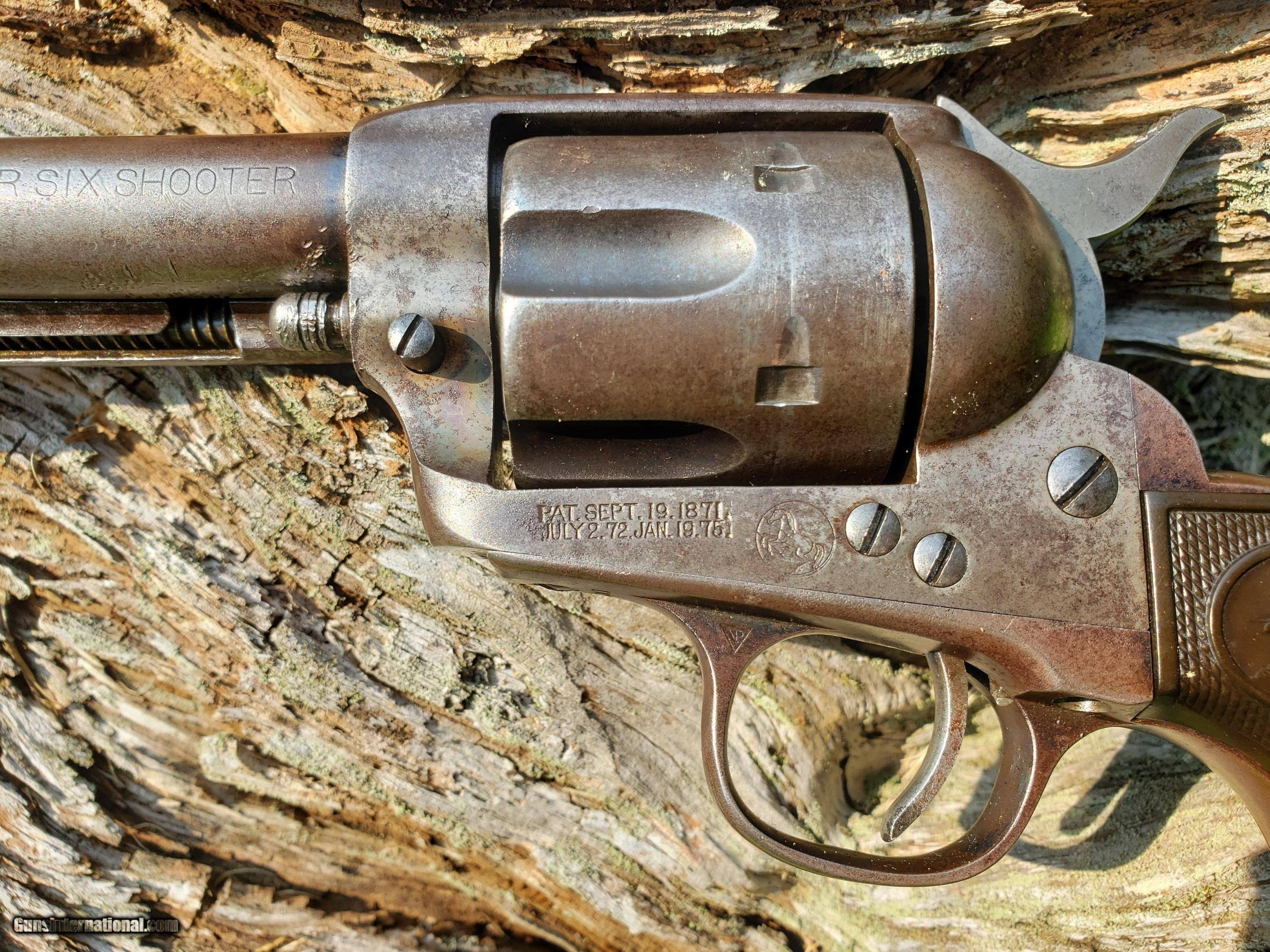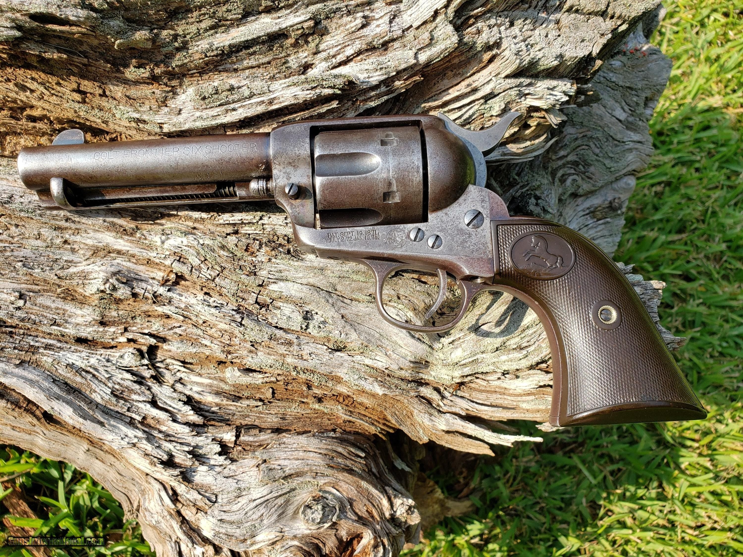 Description: COLT SINGLE ACTION ARMY, BLUE, 44 - 40, 4 3/4" BARREL, MANUFACTURED 1905, SHIPPED TO KRAKAUER, ZORK & MOY COMPANY IN EL PASO, TX. GRIPS NOT ORIGINAL TO GUN. ALL NUMBERS MATCHING. RESEARCH OF RECORDS INDICATE THE COLT WAS PURCHASED BY A THEO LOPEZ. SEE ATTACHED DOCUMENTATION. FACTORY LETTER AND RESEARCH DOCUMENTS INCLUDED. PHOTOS TAKEN OUTSIDE IN NATURAL LIGHT TO BEST SHOW CONDITION OF THIS COLT. PRICE INCLUDES SHIPPING TO YOUR FFL. A THREE DAY NON FIRING INSPECTION PERIOD IS HONORED. IF YOU ELECT TO RETURN THE COLT JUST CALL ME WITHIN 3 DAYS OF RECEIPT OF THE COLT TO MAKE RETURN ARRANGEMENTS. BUYER IS RESPONSIBLE FOR RETURN SHIPPING AND INSURANCE COSTS. A NICE, HONEST EL PASO SHIPPED COLT SAA. SOLD |