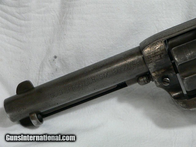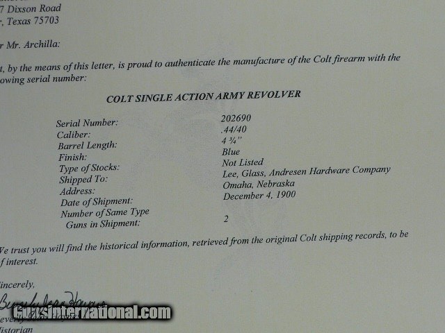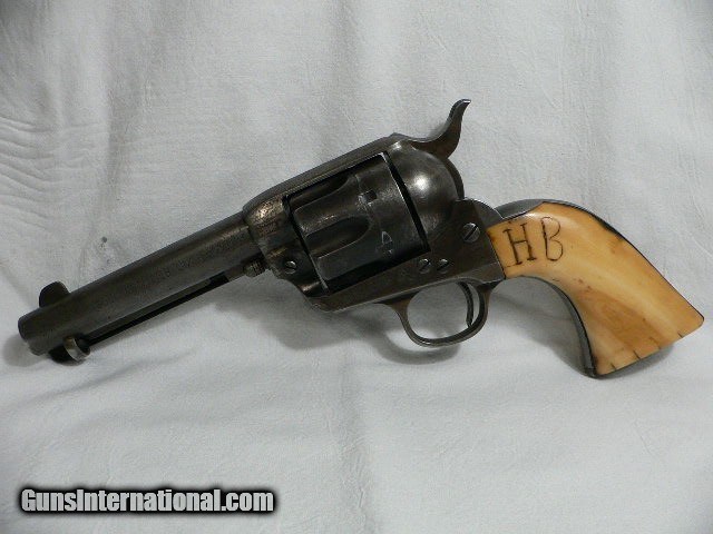 Description: Colt Single Action Army 44 WCF 4 ¾” Barrel, this is a gray patina gun, Manufactured in Hartford Connecticut in 1900 it has colt two line barrel address and on the right side of the barrel is colt frontier six shooter roll on the frame is two line patent address with horse in a circle all matching serial number. The screws are in excellent condition in excellent working condition comes with original one piece Ivory grips that has HB carved into the grips the grips are nice old yellow grips. The bore is good 7 out of a 1 – 10 and 10 being the best with a little erosion. Comes with a factory letter shipped to Lee, Glass, Andresen Hardware Company Omaha, Nebraska December 4, 1900 Serial number 202690 This is a C&R or FFL Shipping $50.00 SOLD Handgun Caliber: .44-40 Winchester (.44 WCF) Manufacturer: Colt Model: SAA Barrel Length: 4 3/4 Chambers: 44 WCF Condition: Good |