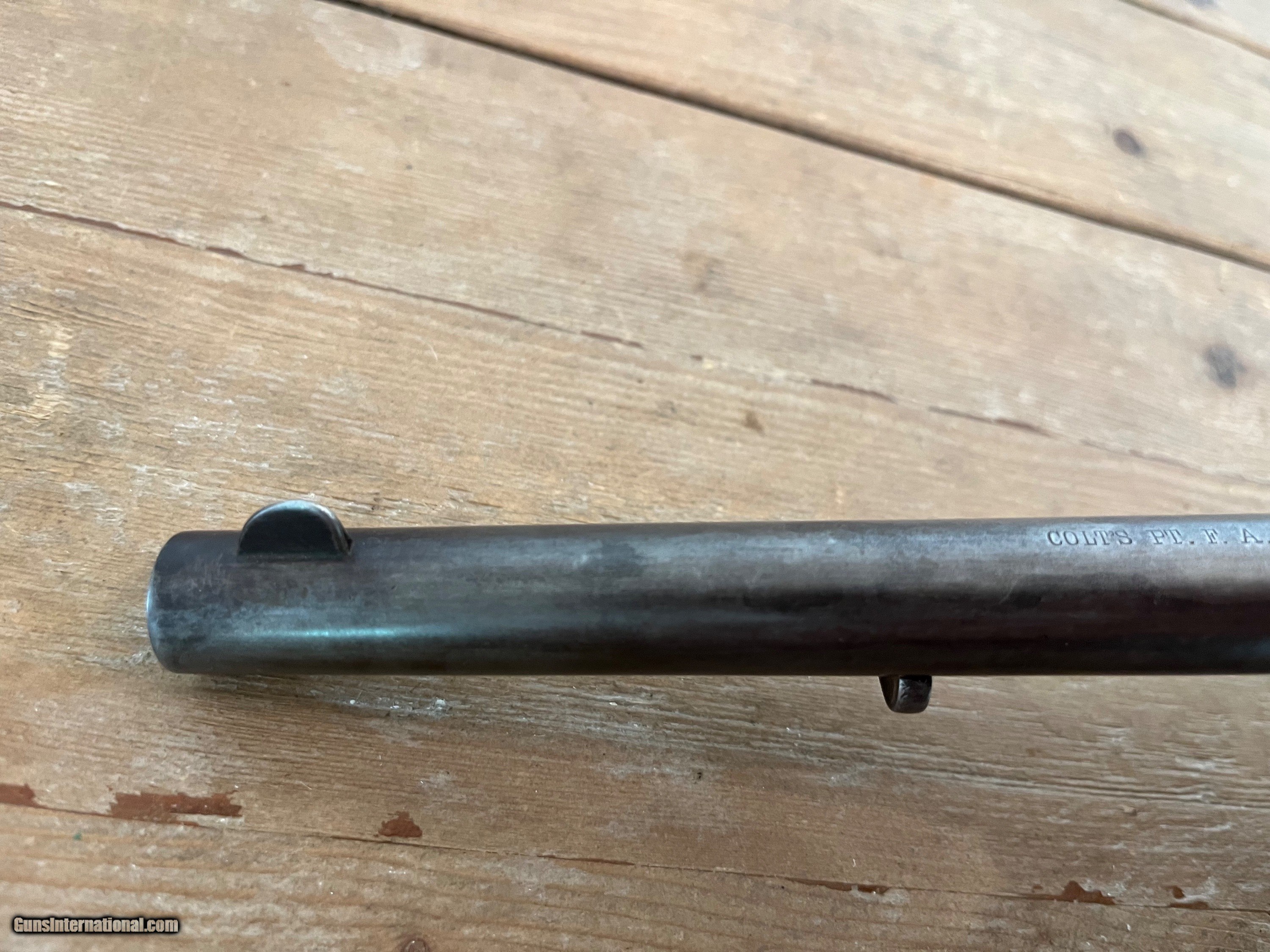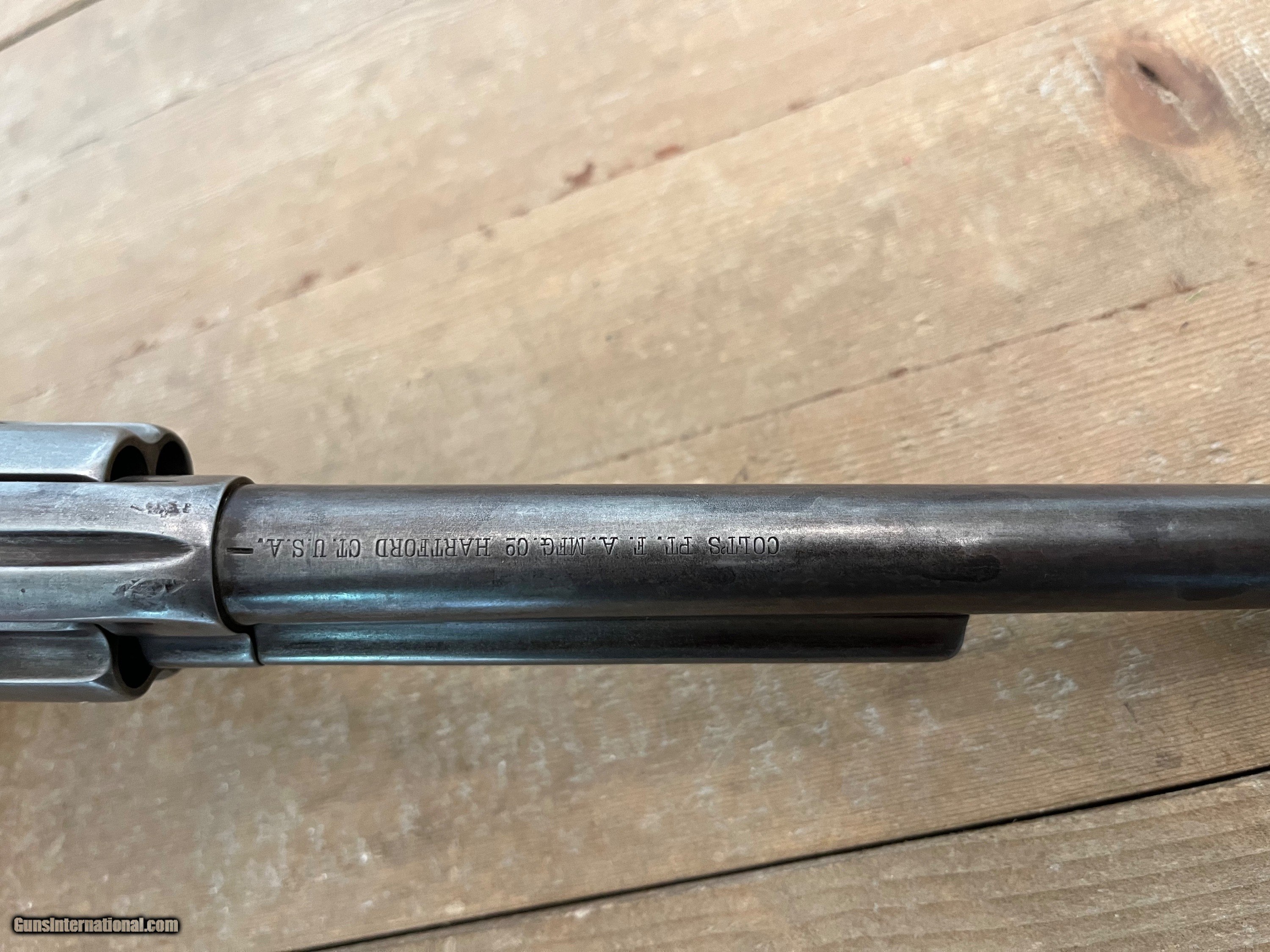 Description: For sale is a black powder frame Colt Single Action Army in 45 Colt. This first-generation Colt will ship directly to your house with no background check. 7 1/2" barrel, original and correct rubber grips, bright shiny bore, and a perfect action, with all four colt clicks. Indexing and locking up tight. All three serial numbers match. The most interesting part of the pistol is the W.K. initials on the bottom of the frame. There were not many names that started with a K. in the late 1800's aside from German names. If you have any family with a K in their last name, this is the pistol for you, as it is your relation. I am asking $4,000 delivered SOLD Antique: Yes Handgun Caliber: .45 Colt Manufacturer: Colt Model: SAA Serial Number: 109819 |