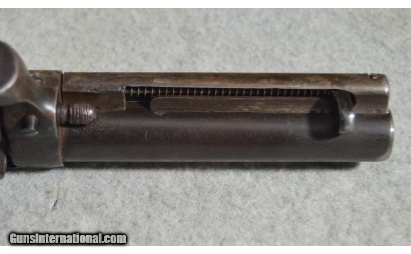 Description: Colt Single Action Army chambered in .45 Colt. The serial number (207500) dates the revolver to 1901. The revolver features a 4-3/4-inch barrel, factory hard rubber grips, and vague remnants of the original blued finish. .45 Colt SOLD Metal Condition: Fair with Handling Marks Wood Condition: Fair with Wear Bore Condition: Frosted with Good Rifling Barrels: 4.75 inches Triggers: Single Action Butt Pad: Factory Hard Rubber Weight: 2 lb 6 oz Item Location: Fort Worth, TX |
