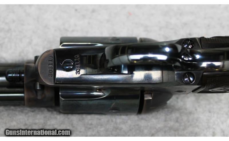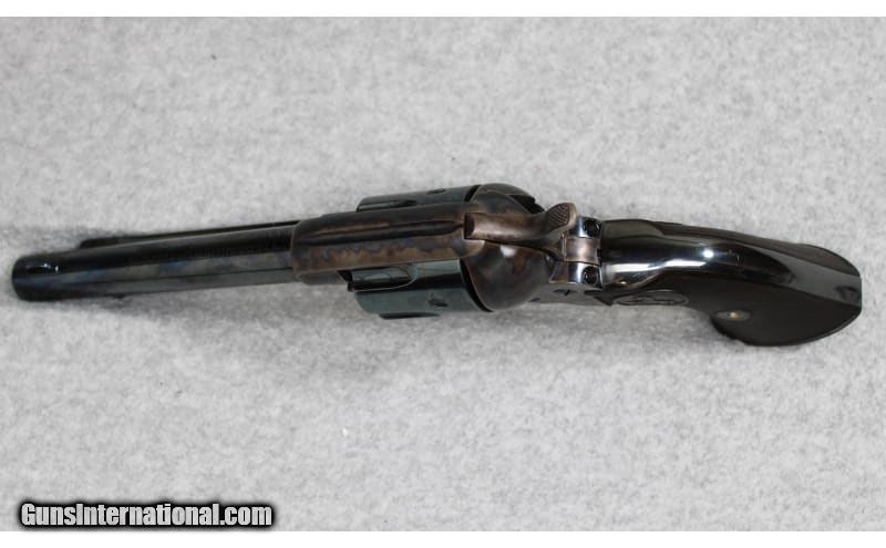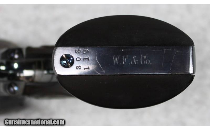 Description: Colt Single Action Army revolver chambered in .45 Colt. The serial number (303119) indicates that the revolver was manufactured in 1907. Features include a 5-1/2 inch blued barrel and color casehardened frame with hard rubber grips. In overall very good condition, the revolver appears to have been professionally restored at some point. Butt is stamped "W.F. & Co.". .45 Colt SOLD Curio/Relic: Yes Metal Condition: Excellent with Minor Handling Marks Wood Condition: Very Good with Minor Handling Marks Bore Condition: Slight Darkening with Some Pitting Barrels: 5.5 inch Butt Pad: Hard Rubber Weight: 2 lbs 4 oz Item Location: Fort Worth, TX |