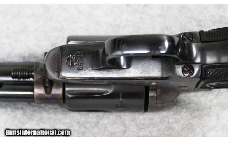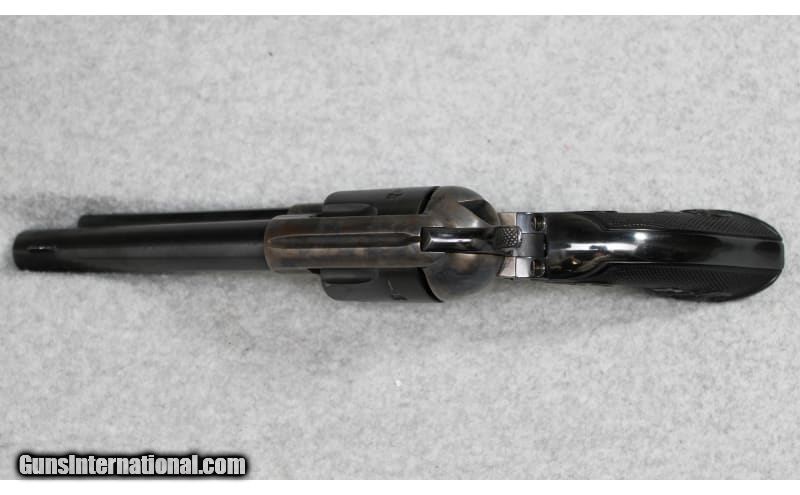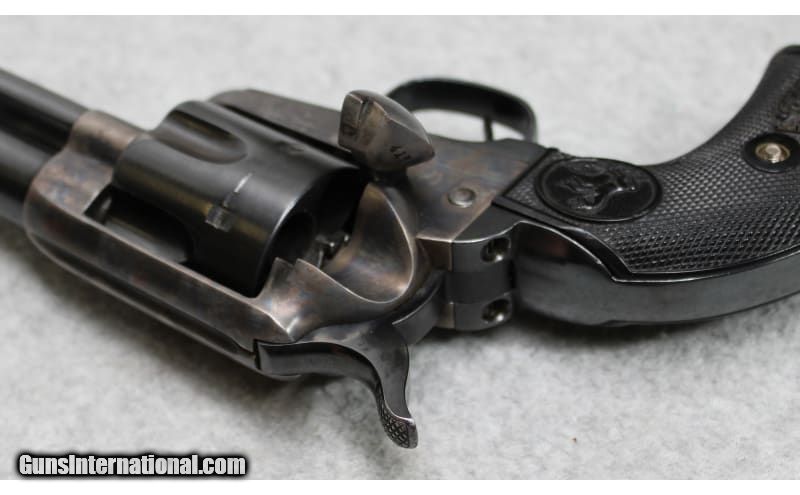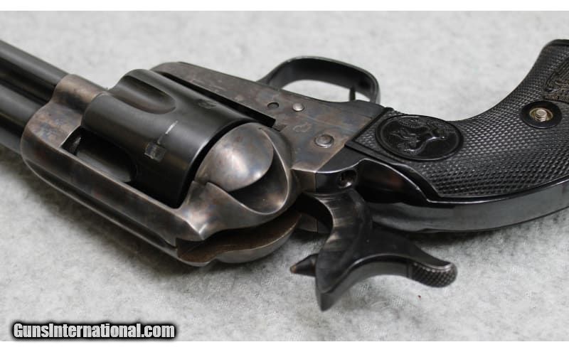 Description: Colt Single Action Army revolver chambered in .45 Colt. The serial number (173070) indicates that the revolver was manufactured in 1897. Features include a 5-1/2 inch blued barrel and color casehardened frame with hard rubber grips. Appears to be professionally restored. Trigger guard replaced at some point and has the serial number 65916. .45 Colt SOLD Antique: Yes Metal Condition: Excellent with Very Minor Handling Marks Wood Condition: Very Good with Minor Handling Marks Bore Condition: Bright And Clear with No Pitting Barrels: 5.5 inch Butt Pad: Hard Rubber Item Location: Fort Worth, TX |