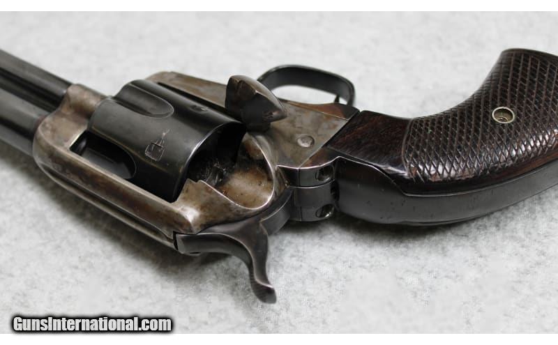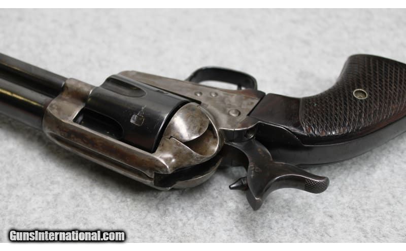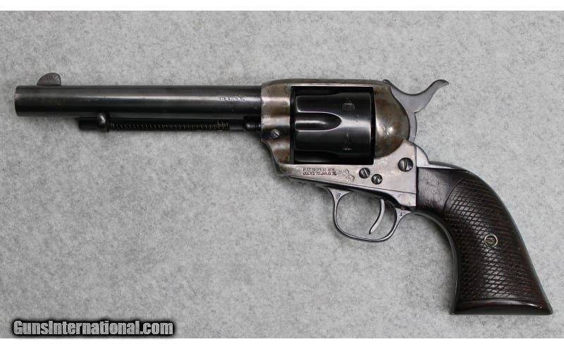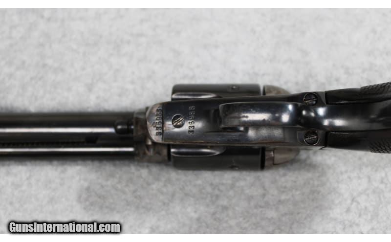 Description: Colt Single Action Army revolver chambered in .45 Colt. The serial number (336933) indicates that the revolver was manufactured in 1917. Features include a 6 inch blued barrel and color casehardened frame with checkered walnut grips. In overall good condition, the revolver has wear as one would expect from a firearm of this age. Appears to have had spot cold bluing applied at some point. Barrel measures to 6 inches, which may indicate a cutdown and recrowned barrel. .45 Colt SOLD Curio/Relic: Yes Metal Condition: Very Good with Minor Handling Marks Wood Condition: Good with Handling Marks and Wear Bore Condition: Bright And Clear with No Pitting Barrels: 6 inch Butt Pad: Checkered Walnut Weight: 2 lbs 5 oz Item Location: Fort Worth, TX |