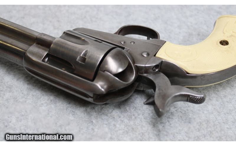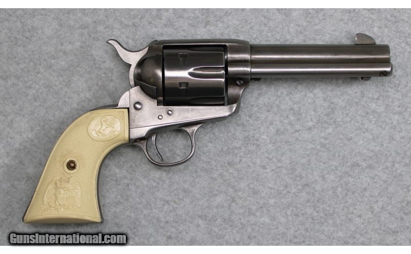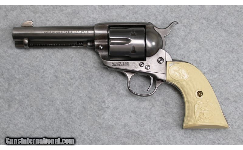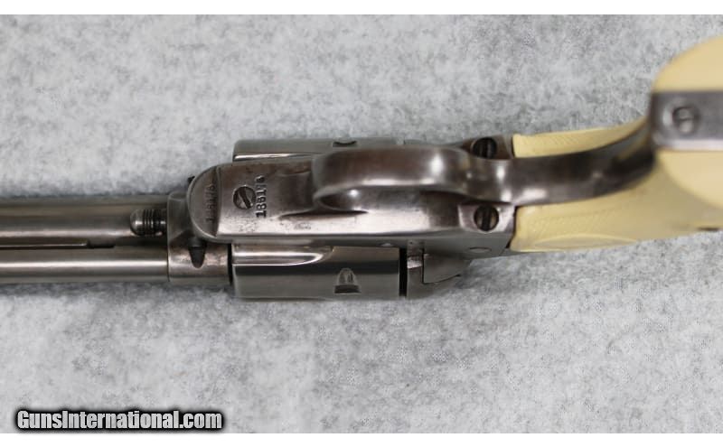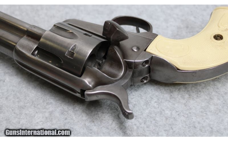 Description: Colt Single Action Army revolver chambered in .45 Colt. The serial number (186176) indicates that the revolver was manufactured in 1899. Features include a 4-1/2 inch blued barrel and color casehardened frame with plastic grips. In overall good condition, the revolver has wear as one would expect from a firearm of this age. The barrel appears to have been replaced at some point. .45 Colt SOLD Curio/Relic: Yes Metal Condition: Good with Handling Marks and Wear Wood Condition: Good with Handling Marks and Discoloration Bore Condition: Clear with Light Pitting and Frosting Barrels: 4.5 inch Butt Pad: Plastic Weight: 2 lbs 3 oz Sights: Front Blade Item Location: Fort Worth, TX |