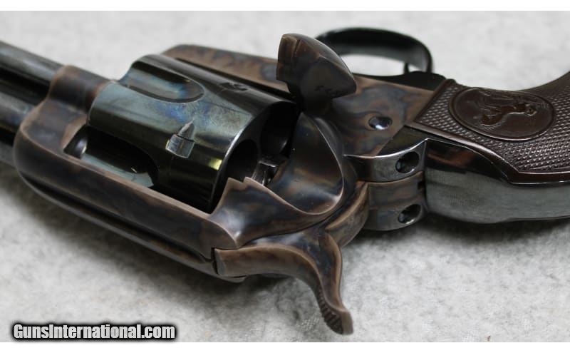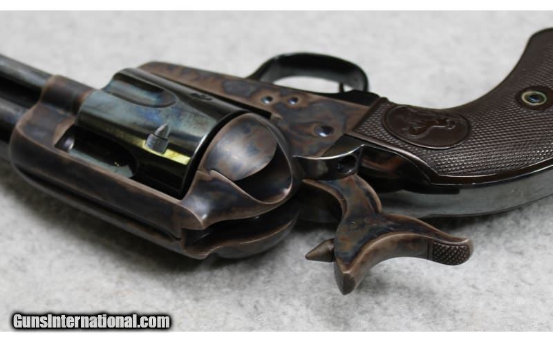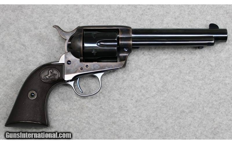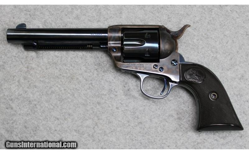 Description: Colt Single Action Army revolver chambered in .45 Colt. The serial number (303119) indicates that the revolver was manufactured in 1907. Features include a 5-1/2 inch blued barrel and color casehardened frame with hard rubber grips. In overall very good condition, the revolver appears to have been professionally restored at some point. Butt is stamped "W.F. & Co.". .45 Colt SOLD Metal Condition: Excellent with Minor Handling Marks Wood Condition: Very Good with Minor Handling Marks Bore Condition: Slight Darkening with Some Pitting Triggers: Single Action Butt Pad: Hard Rubber Weight: 2.4 lbs Item Location: Fort Worth, TX |