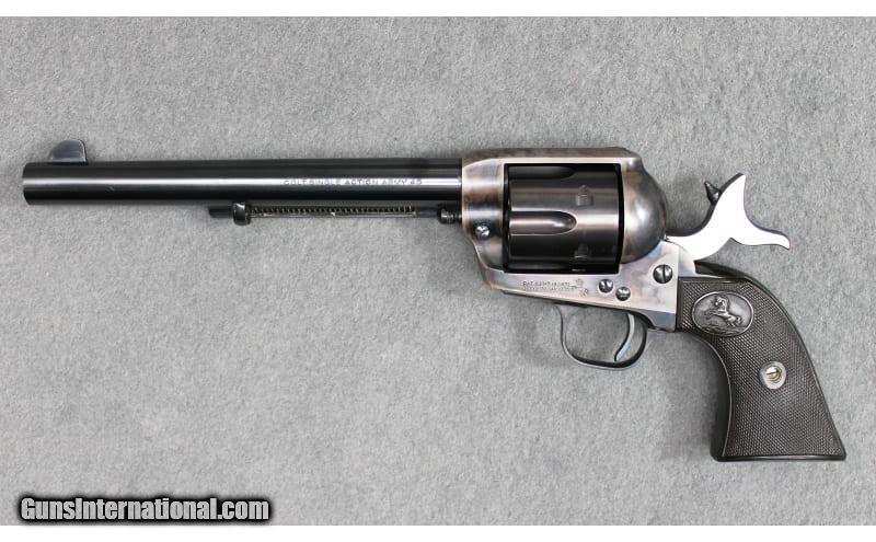 Description: Colt Single Action Army revolver chambered in .45 Colt. First Generation dated to 1937. Features include a blued 7-1/2 inch barrel and color casehardened frame. Cylinder appears to have been replaced along with the hard rubber grips at some point in its long life. No accessories. .45 Colt SOLD Curio/Relic: Yes Metal Condition: Very Good as Restored with Minor Handling Marks and a Faint Cylinder Drag Line Bore Condition: Bright And Clear with No Pitting Barrels: 7.5 inch Butt Pad: Replacement Hard Rubber Item Location: Fort Worth, TX |