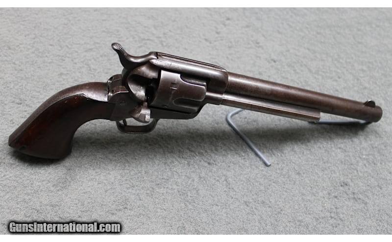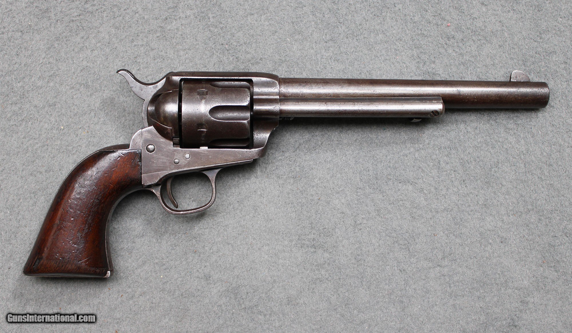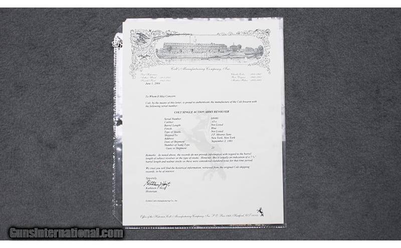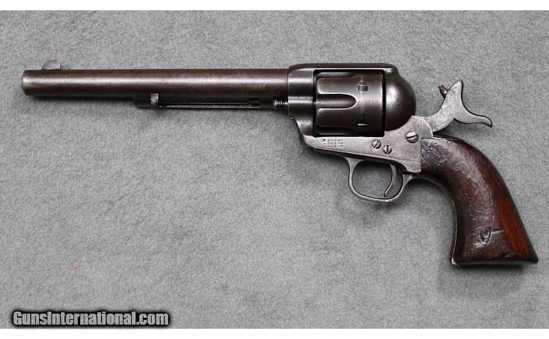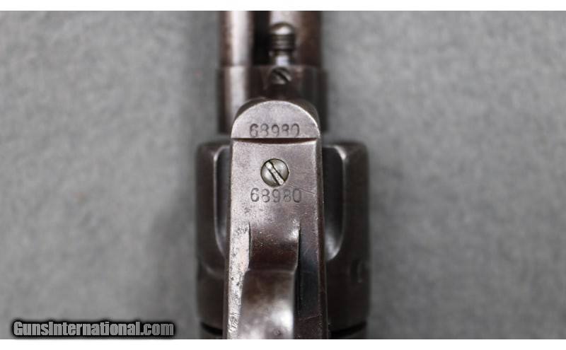 This Colt Single Action Army is chambered in .45 Colt. Firearm features a 7.5" barrel, walnut grips. Pistol comes with factory letter dating this piece to 1881. Serial number 68980. Good overall condition, mostly dark gray with brown patina. Some patches of light pitting and grip shows wear. Mechanically excellent. Pistol and letter only; No box, No accessories. .45 Colt
