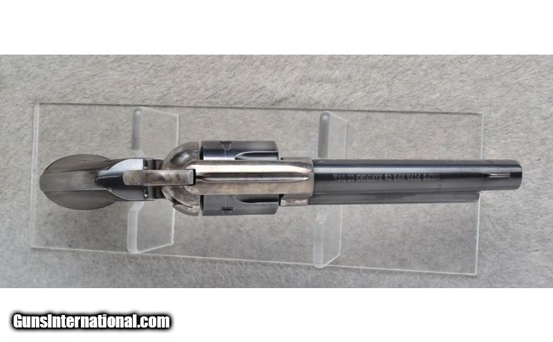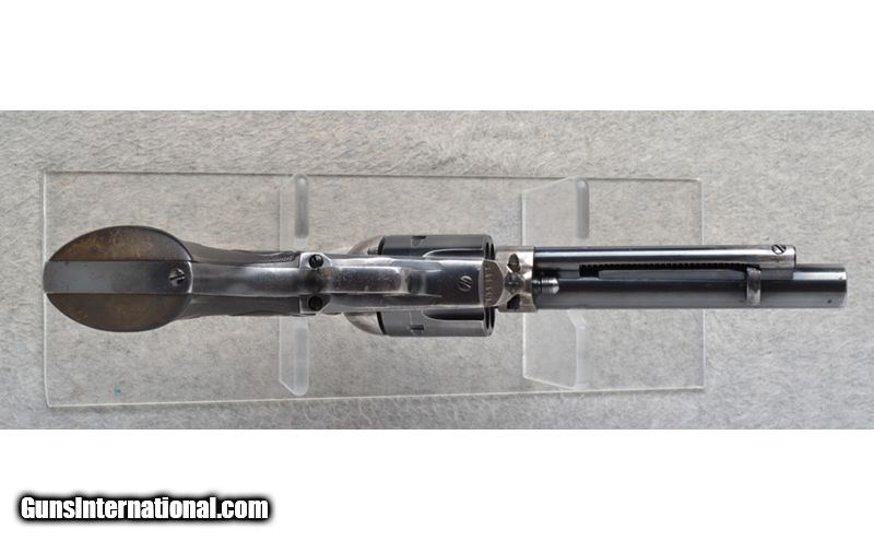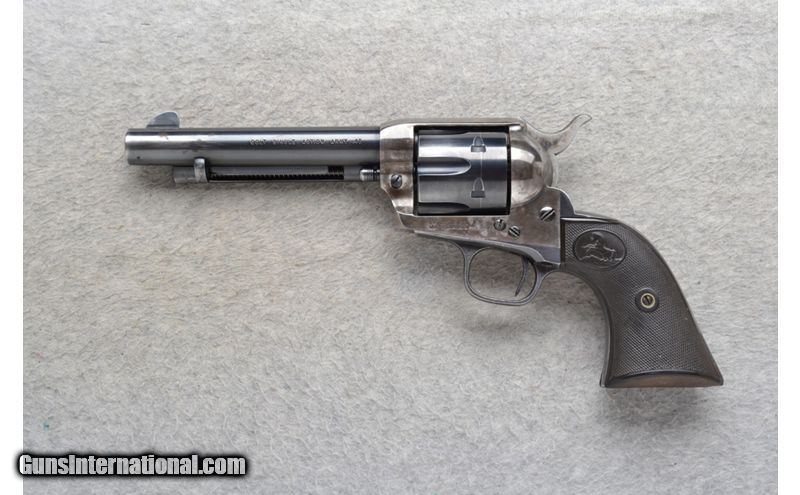 Description: This Colt Model Single Action Army is a 6 shot single action revolver in .45 Long Colt Cal. It has a 5 3/8 inch barrel. A blade front and integral notch rear sight. The grip is a checkered hard plastic with the Colt horse logo. It has a case colored receiver and a checkered hammer spur. Serial Number 341417. The Colt Single Action Army is a classic and highly sought after shooter and collectible revolver. .45 Long Colt SOLD Chambers: 6 shot fluted cylinder. Metal Condition: Good. Light blue wear. A few spots of minor freckling. Bore Condition: Very good. Barrels: 5 3/8 inch. Triggers: Single Action. Weight: 38 oz. Sights: Blade front. Integral notch rear. Item Location: Richfield, WI |