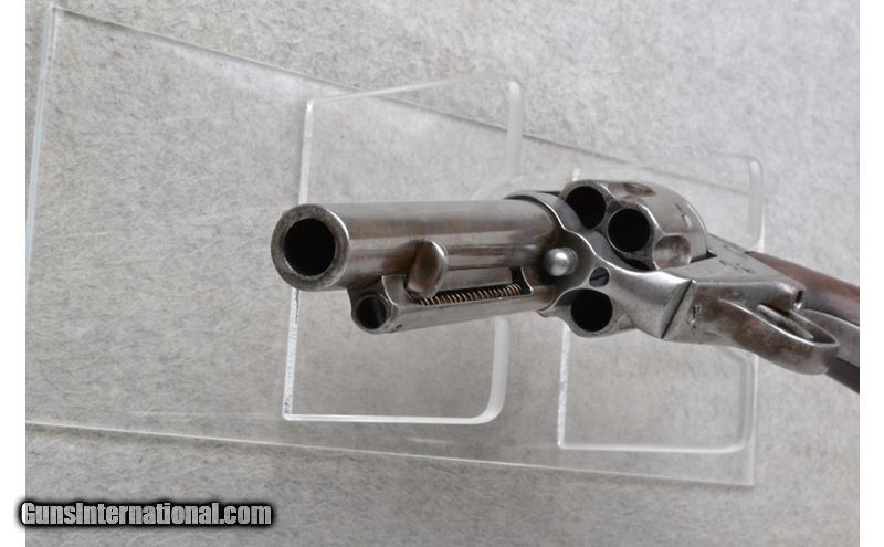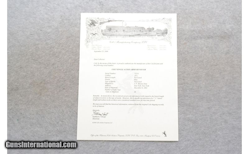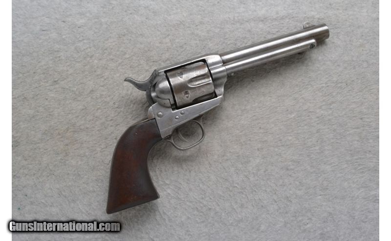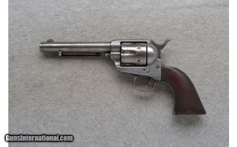 Description: This Colt Model Single Action Army is a 6 shot single action revolver in .45 Long Colt Cal. It has a 5.5 inch barrel. A blade front sight and an integral notch rear sight. The grip is a smooth walnut. Serial Number 73253 (1881). Comes with a Colt's Manufacturing Company authentication letter. Cylinder lock up is good. .45 Long Colt SOLD Antique: Yes Chambers: 6 shot. Metal Condition: "No blueing, minor freckling and light use marks. Wood Condition: Light wear. A small chip missing left side at bottom front. Bore Condition: Light rust at the bore otherwise good. Barrels: 5.5 inch. Triggers: Single Action. Weight: 36 oz. Sights: Blade front. Integral notch rear. Item Location: Richfield, WI |