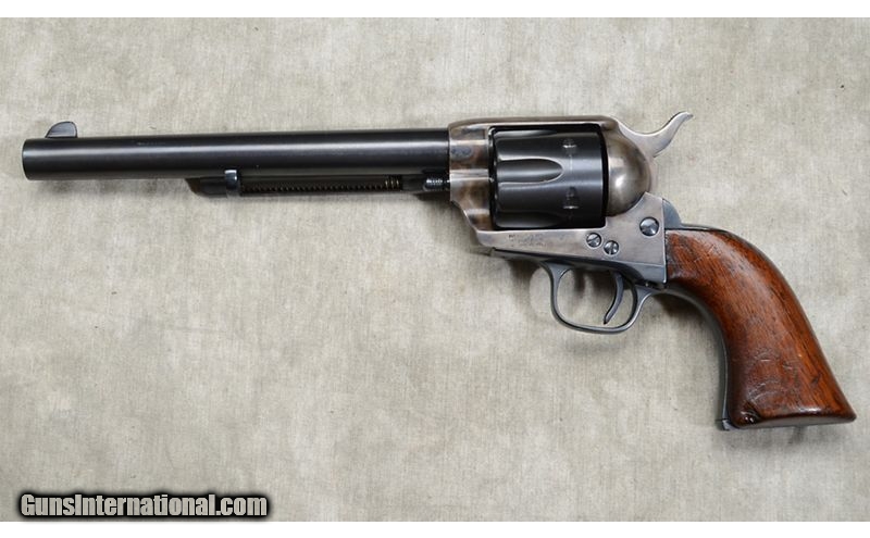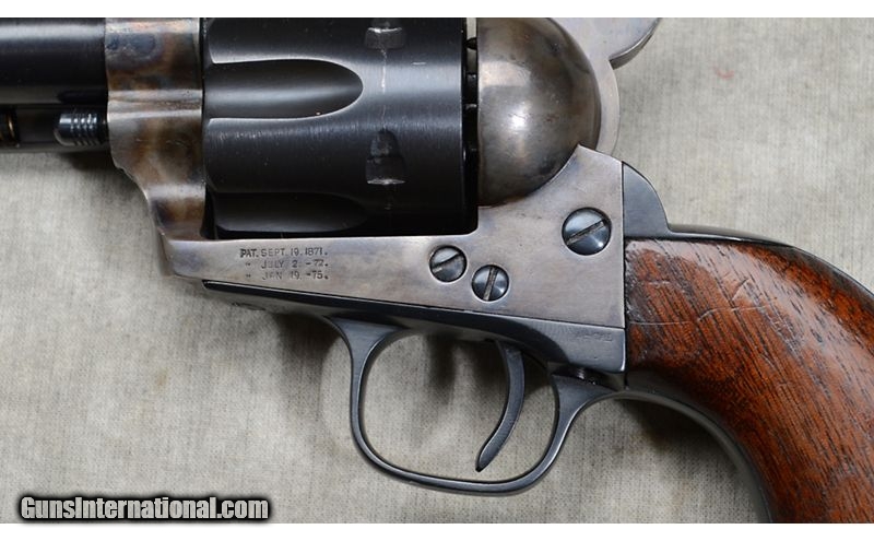 Description: The serial number of the frame dates to 1877 but appears to be upgrades with new barrel and cylinder. Good case color on the frame and very good blue on the barrel/cylinder. .45 Colt SOLD Antique: Yes Chambers: 6 Metal Condition: Very good overall. Blue on the barrel and cylinder looks new. Case color on the frame is good but is a little faded. Wood Condition: Good. There is a chip from the bottom of the left scale and several scratches on both sides. Bore Condition: A bit dark but good rifling. Barrels: 7-3/8 inch Triggers: Factory single action only trigger Butt Pad: Smooth walnut. Weight: 37 oz. Sights: Blade and top-strap notch Item Location: Rogers |