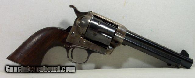 Description: Colt Single Action Army SN312650; shipped to Schoverling, Daly, & Gales, N.Y., N.Y. on July 11, 1910; no letter ordered but listed as 45 cal; blue;5 ½”bbl; and wood grips; gun has 6-point star on right rear bow of trigger guard and amperstand on rear faceoff cylinder; later original Colt bbl. now on gun with proper broken ‘O’ in address; all numbers match; I believe that current one-piece Walnut Grips were added at time of re-work, as there is a pin hole in grip strap for two –piece grips—although these grips could be original, as they fit well; fancy ‘quick draw hammer’ probably added at time of re-work, as Colt from Waco, Texas family stated that the hammer was for quick draw on father’s Colt; BEAUTIFUL 107 year old Colt with nearly all metal finish present; PERFECT action and bore; FFL/C&R required for out of state shipping; All items shipped fully insured Priority Mail- -Hand guns $30 --Long guns $45-- Spurs $30-- Knives, Swords & Sabers $30—Grips $20; return policy: three days inspection from the date the item is received; full refund of shipping both ways ONLY IF THE ITEM IS MISREPRESENTED. SOLD Curio/Relic: Yes Manufacturer: Colt Serial Number: 312650 |
