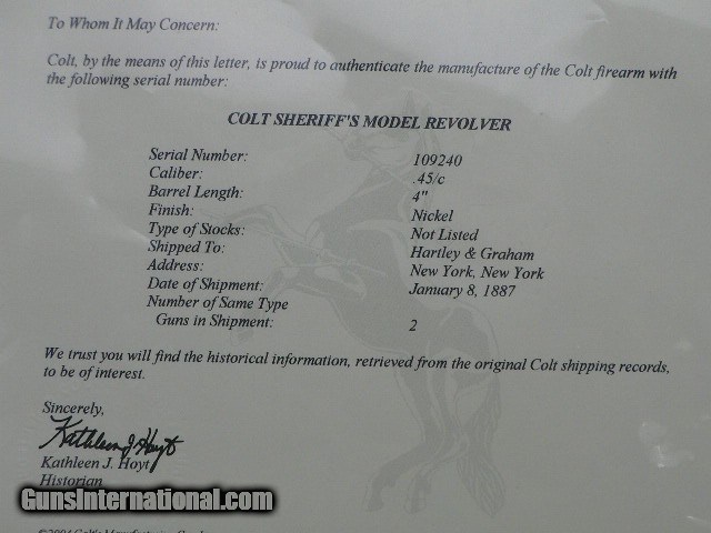 Description: -----SOLD----Colt Single Action Army 45 Sheriff ‘s Model Manufactured in Hartford Connecticut 1884 this is a 96% nickel gun with a two line barrel address, on the left side is three line patent, comes with old Ivory Grips. All matching serial number and mechanically is in good condition with tight cylinder lockup in single-action. Bore is good. Comes with a factory letter this gun was shipped to Hartley & Graham New York, New York on January 8, 1887 in a two gun Shipment. Serial number 10924X This Gun is “ANTIQUE” Ship right to your Door” PLEASE SEE PHOTOS FOR CONDTION If you Phone then call from 7:00 AM and 6:00 PM Central time. + Shipping is $50.00 I never selling gun without talking to somebody on the phone also want a copy of their drivers license to be sent to me. SOLD Antique: Yes Handgun Caliber: .45 Colt Manufacturer: Colt Model: Sheriff ‘s SAA Barrel Length: 4 Manufacture Date: 1884 |