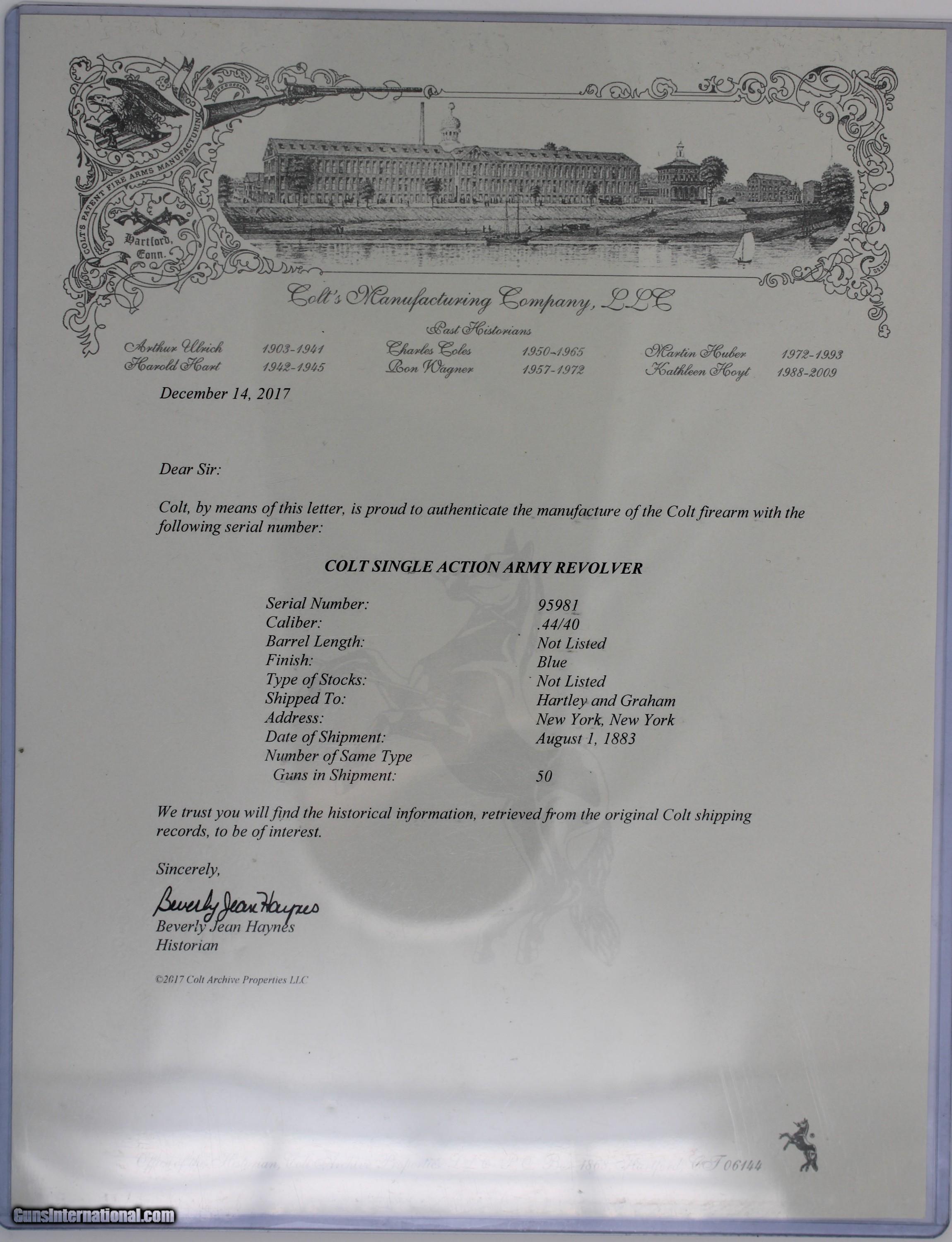 Antique- Ships direct unless prohibited by law. SOLD Antique: Yes Handgun Caliber: .44-40 Winchester (.44 WCF) Manufacturer: Colt Model: SAA Serial Number: 95981 Barrel Length: 7.5 |
