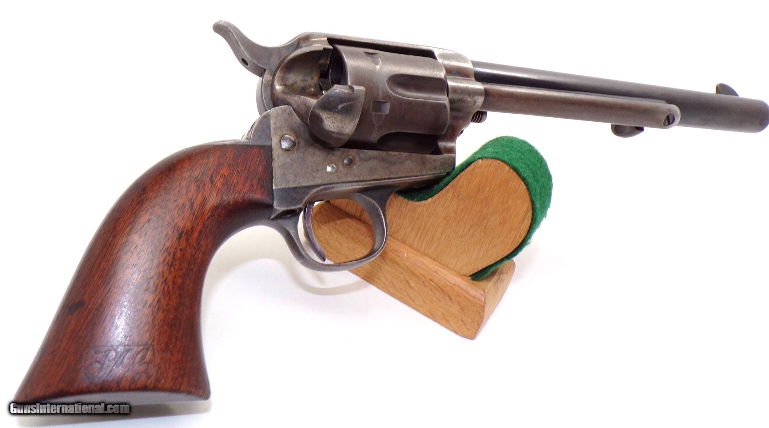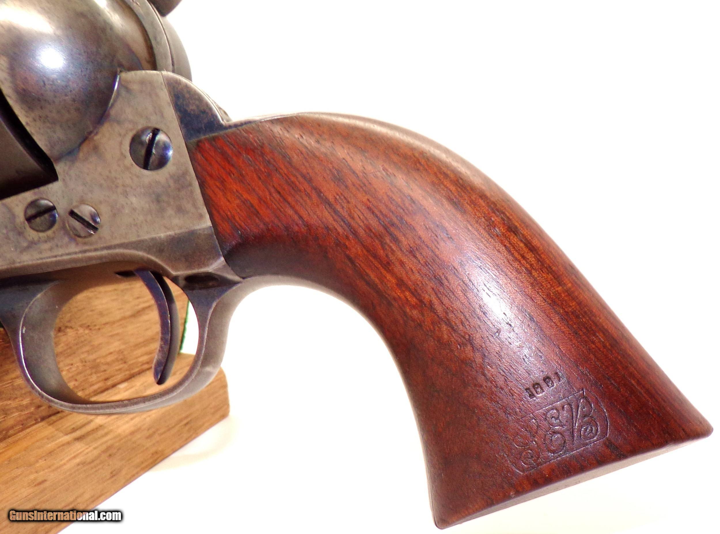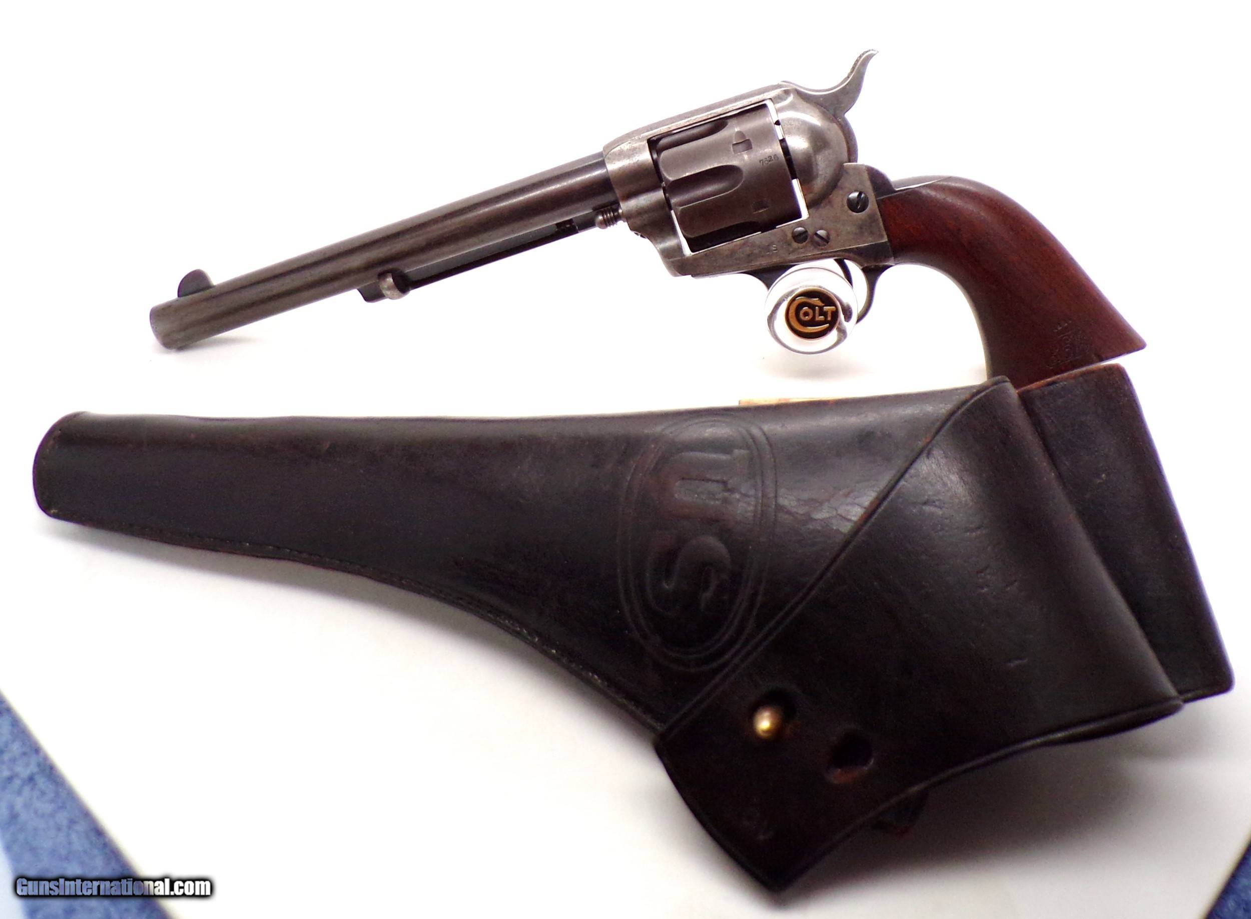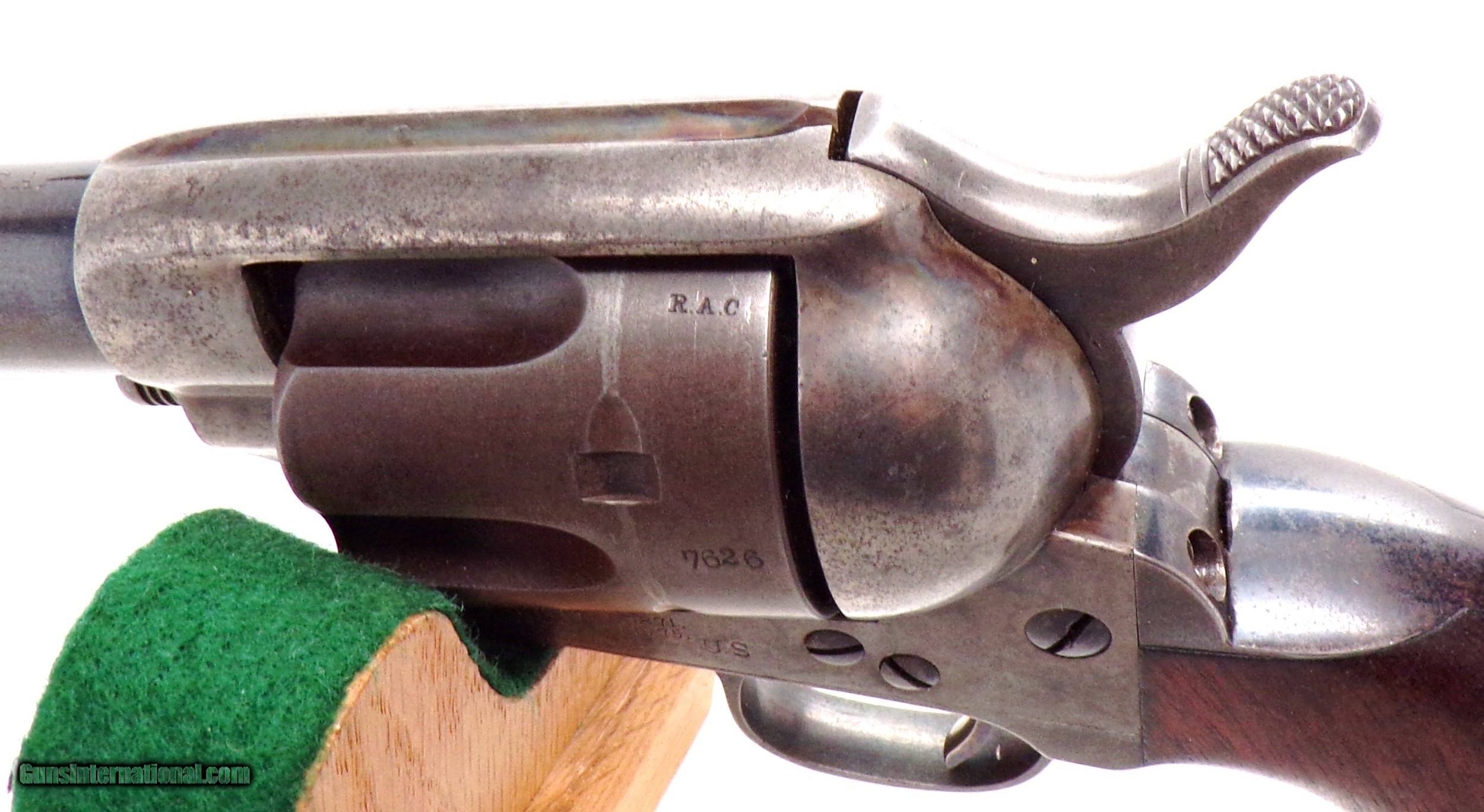 Description: SALE PENDING According to the Kopec letter this revolver falls between a NY Militia revolver and a Cavalry revolver. It was inspected by Capt. Stanhope E. Blunt. The Ordnance sub-inspector is Rinaldo A. Carr. Kopec could not locate this serial number in the national archives, but suspects it was possibly issued to Troop K. 8th Cavalry. He also states that based on the condition it might have been issued to a state militia unit, probably California or New York. As you can see in the pictures, this is a nice piece. Notice the Kopec letter mentions the hammer and cylinder pin were not original. Each is now correct. I do have the Kopec letter and the Colt Archives letter. This revolver is 100% correct. The finish is 100% original. A lot of original blue remains. As you will see, a very nice amount of original case color remains as well. ALL markings are clear, complete, and correct, including the inspector marks. Grips are excellent and fit perfectly. Cartouches on both stocks are excellent. Bore in the 7 1/2" barrel is bright and shiny. It will rate an eight on a one to ten scale. No issues. Action works perfectly and is crisp. Lock-up is tight. The last picture shows an original cavalry holster. It is in excellent conditon and is included. This Colt Single Action Army Cavalry is highly collectible. Condition is much better than many you will see. It will make a great addition to any collection. American Arms & Antiques item #2529. Please contact me for more pictures. SOLD Antique: Yes Serial Number: 137626 |