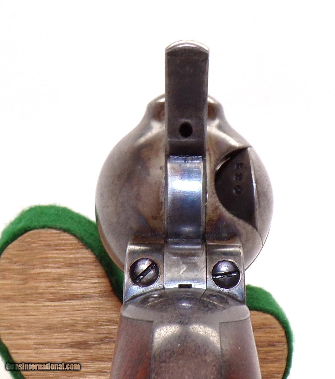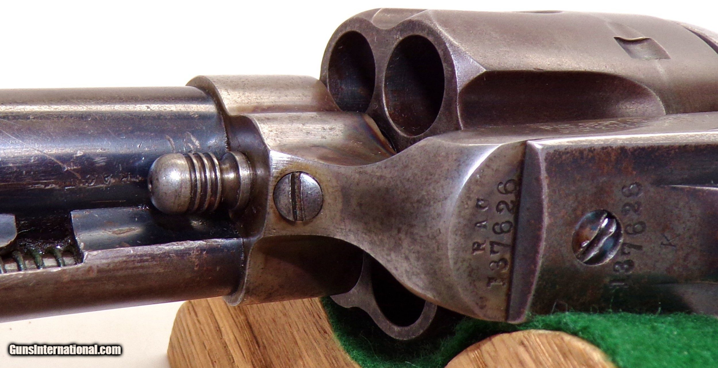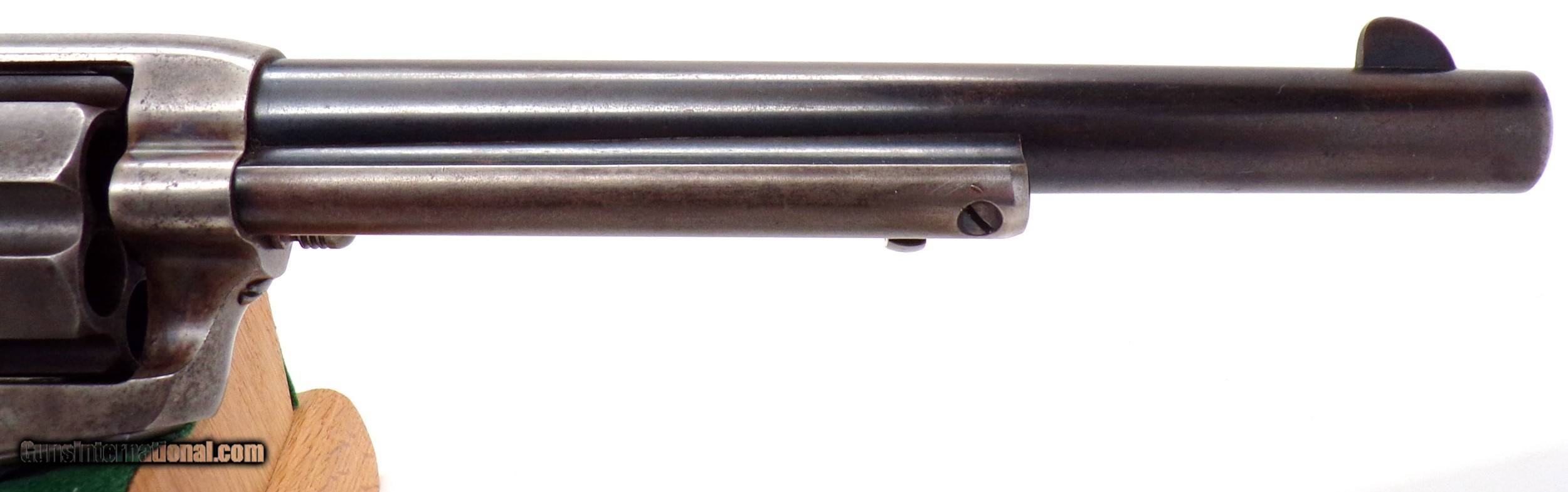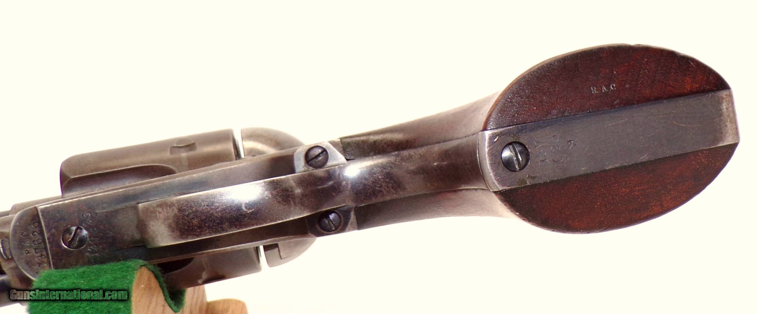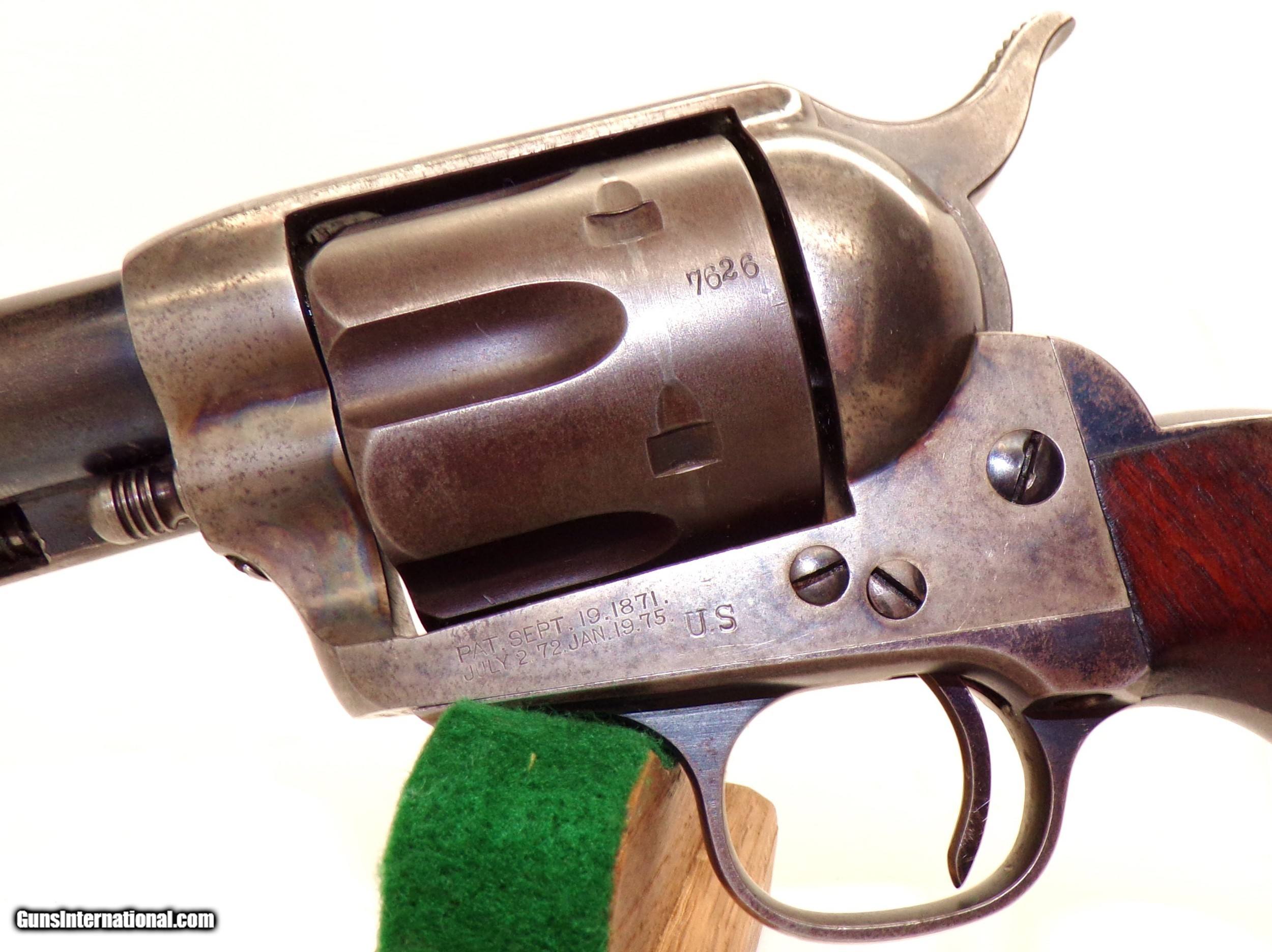 Description: SALE PENDING According to the Kopec letter this revolver falls between a NY Militia revolver and a Cavalry revolver. It was inspected by Capt. Stanhope E. Blunt. The Ordnance sub-inspector is Rinaldo A. Carr. Kopec could not locate this serial number in the national archives, but suspects it was possibly issued to Troop K. 8th Cavalry. He also states that based on the condition it might have been issued to a state militia unit, probably California or New York. As you can see in the pictures, this is a nice piece. Notice the Kopec letter mentions the hammer and cylinder pin were not original. Each is now correct. I do have the Kopec letter and the Colt Archives letter. This revolver is 100% correct. The finish is 100% original. A lot of original blue remains. As you will see, a very nice amount of original case color remains as well. ALL markings are clear, complete, and correct, including the inspector marks. Grips are excellent and fit perfectly. Cartouches on both stocks are excellent. Bore in the 7 1/2" barrel is bright and shiny. It will rate an eight on a one to ten scale. No issues. Action works perfectly and is crisp. Lock-up is tight. The last picture shows an original cavalry holster. It is in excellent conditon and is included. This Colt Single Action Army Cavalry is highly collectible. Condition is much better than many you will see. It will make a great addition to any collection. American Arms & Antiques item #2529. Please contact me for more pictures. SOLD Antique: Yes Serial Number: 137626 |