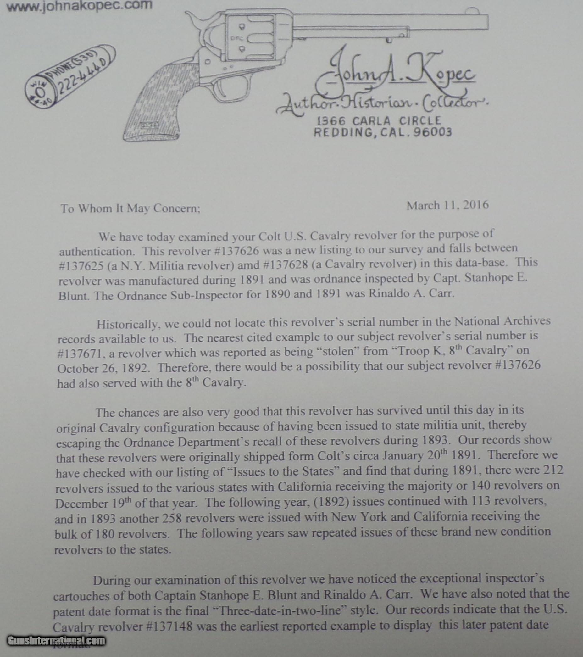 COLT SINGLE ACTION ARMY CAVALRY KOPEC & COLT LETTER