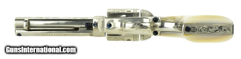 Colt Single Action Army Custom Engraved .45 caliber revolver. Manufactured in 1883. Barrel length 4¾”. Gun is beautifully scroll engraved with foliate scrolls with granular background. Screws are all fire or nitre blue. Grips are excellent fitting pearl and are later than the period of the gun. Barrel address and patent dates are sharp and clear. Has 100% of the later nickel finish. Really beautiful revolver! Note: Not for modern high velocity ammunition.
