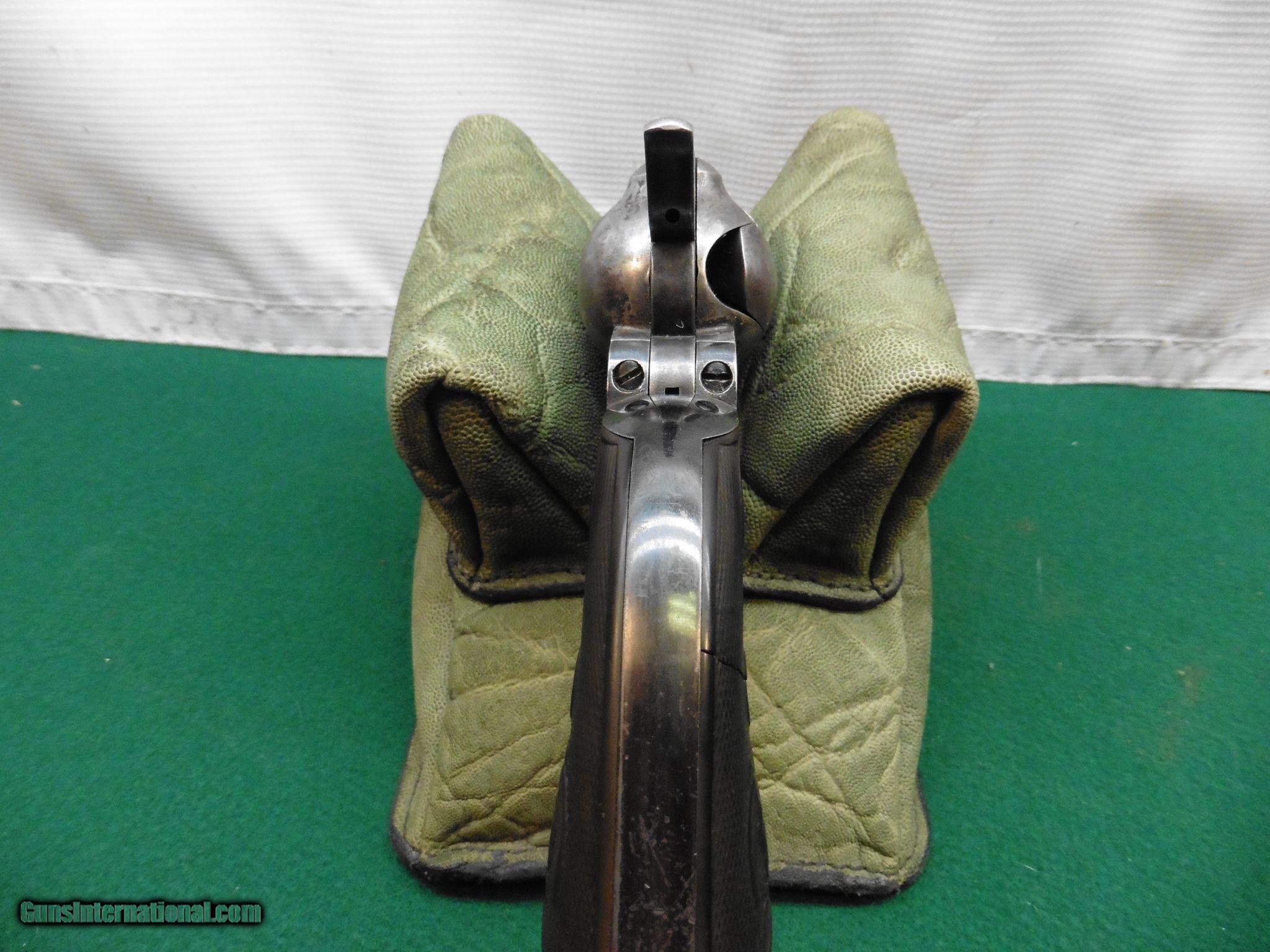 Description: Rare collectible Sheriff's model for sale. Chambered in 45 Colt with 4" barrel. This is an ejectorless model from the intermediate black powder period (1876-1890). This revolver is lettered and originally shipped to E.C. Meacham Arms Co. in St. Louis, Missouri on May 1, 1888. Approximately 1,500 ejectorless models were produced by Colt. This revolver still retains some of the original blue finish on the barrel, cylinder and upper portion of the backstrap. Your opportunity to own consecutive serial numbered Sheriff's models is out there somewhere as S/N 123311 is an identical to the subject. You just need to find it. Please contact us with any questions. Ammo belt not included (ambiance only). Owner has reduced asking price (5/8/18) Cheers SOLD Antique: Yes Manufacturer: COLT Model: SAA SHERIFF'S MODEL Serial Number: 123310 Caliber Info: 45 COLT |