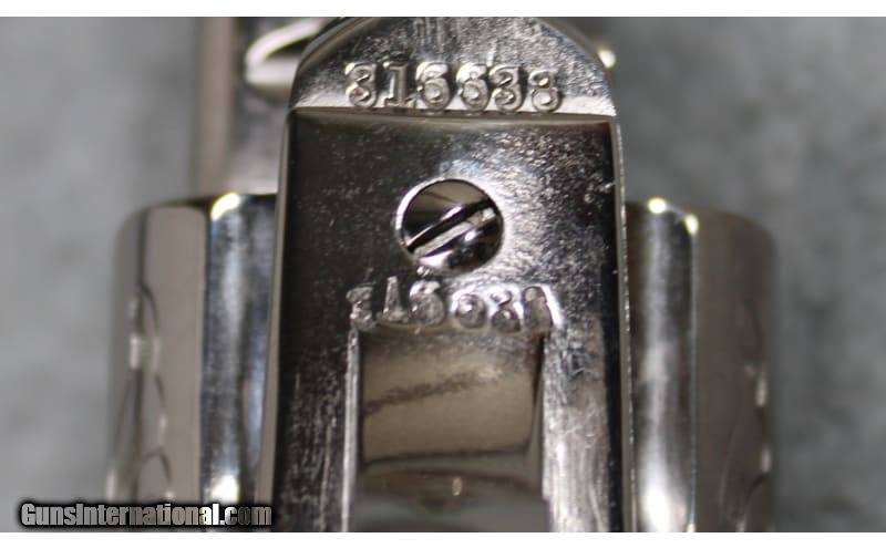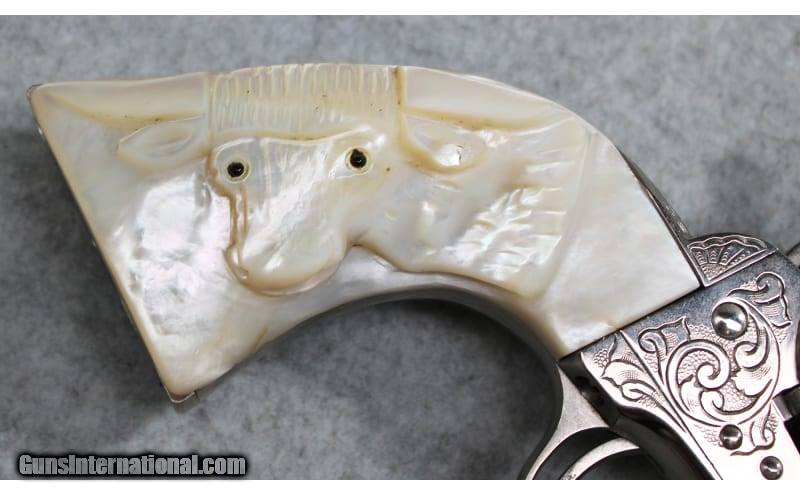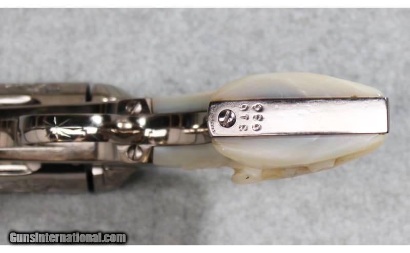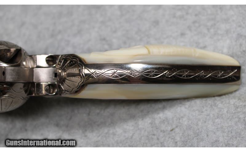 Description: This Colt revolver is chambered in .45 Long Colt. 99% of the nickel plating is retained with only very minor handling marks. This pistol is embellished by custom engraver David W. Harris. Features pearl grips with steer head carving and 75% surface coverage with DWH's floral scrollwork among other engravings. Fan patterns adorn the recoil shield, loading gate, and top of the backstrap. Signature ("DW HARRIS") can be found on the gun's butt. Marked with the two-line Colt Hartford address. Frame is marked with two-line patent date and the Rampant Colt logo. Date of manufacture is 1911 with subsequent engravings in the interim. .45 Long Colt SOLD Curio/Relic: Yes Metal Condition: Very good with minor handling marks Wood Condition: N/A Bore Condition: Bright and clear with good rifling Barrels: 4.75 inch Triggers: Single Action Butt Pad: Pearl grips with steer head carving Weight: 2 lb 5 oz Sights: Front blade sight Item Location: Fort Worth, TX |