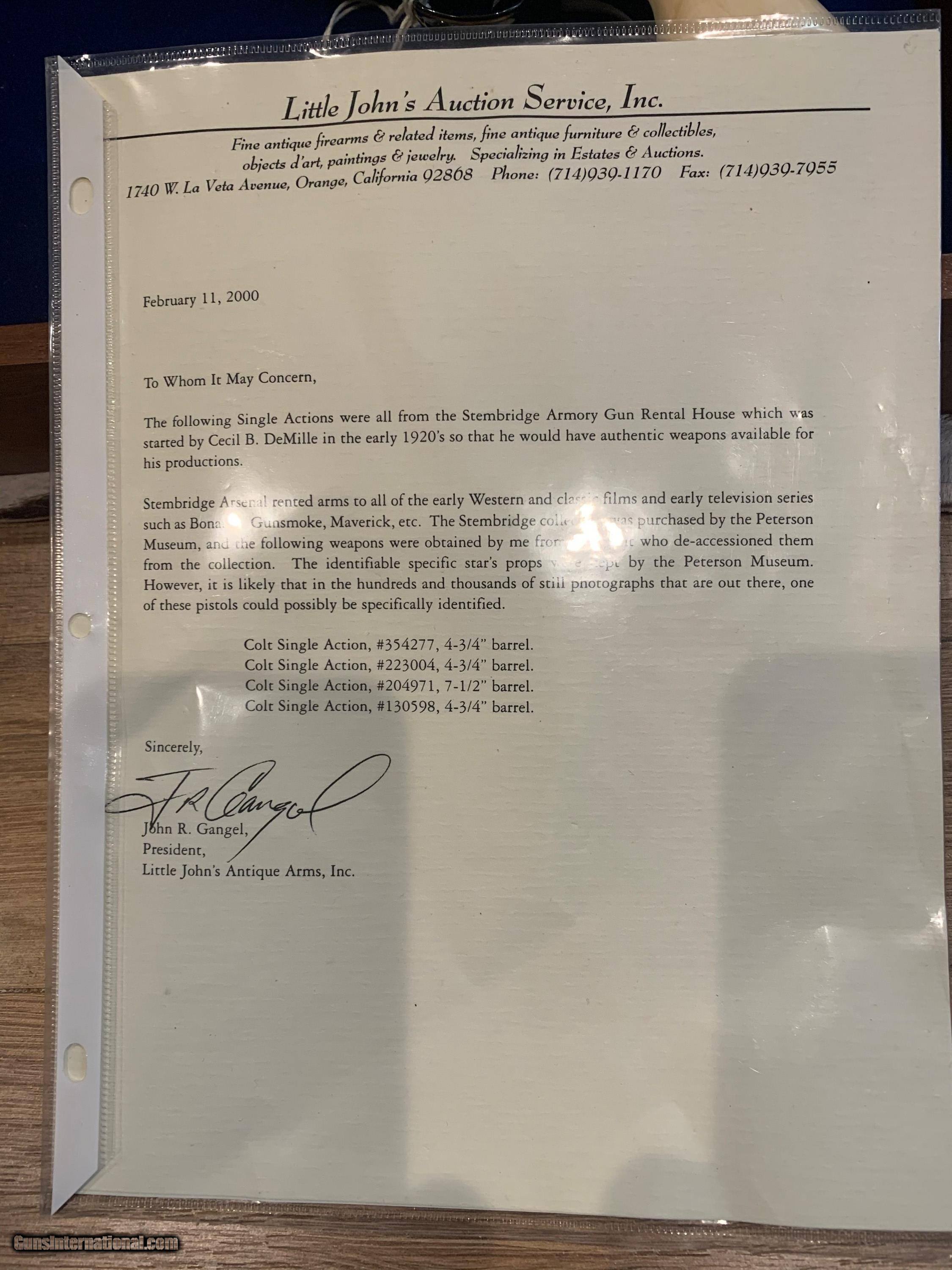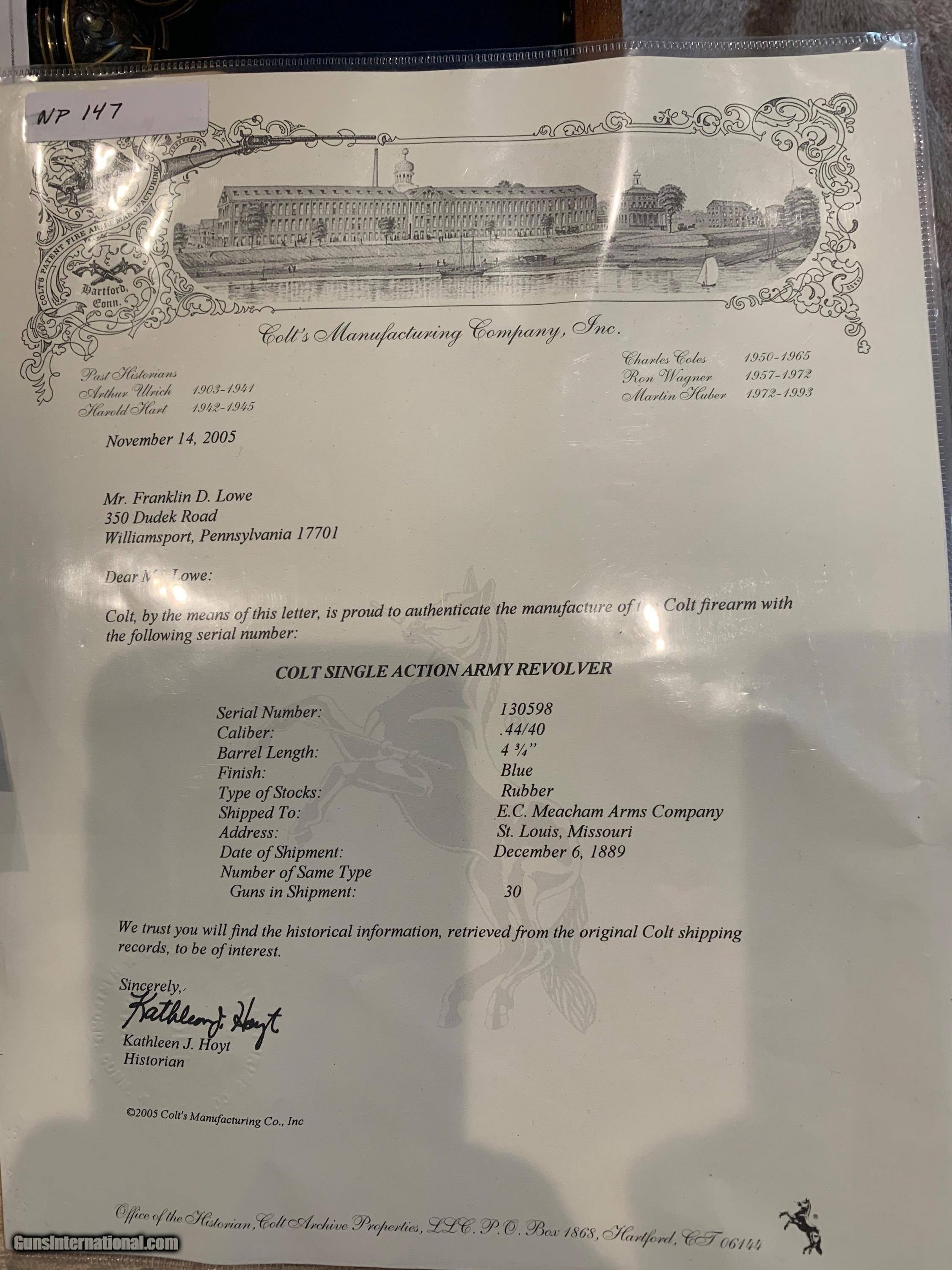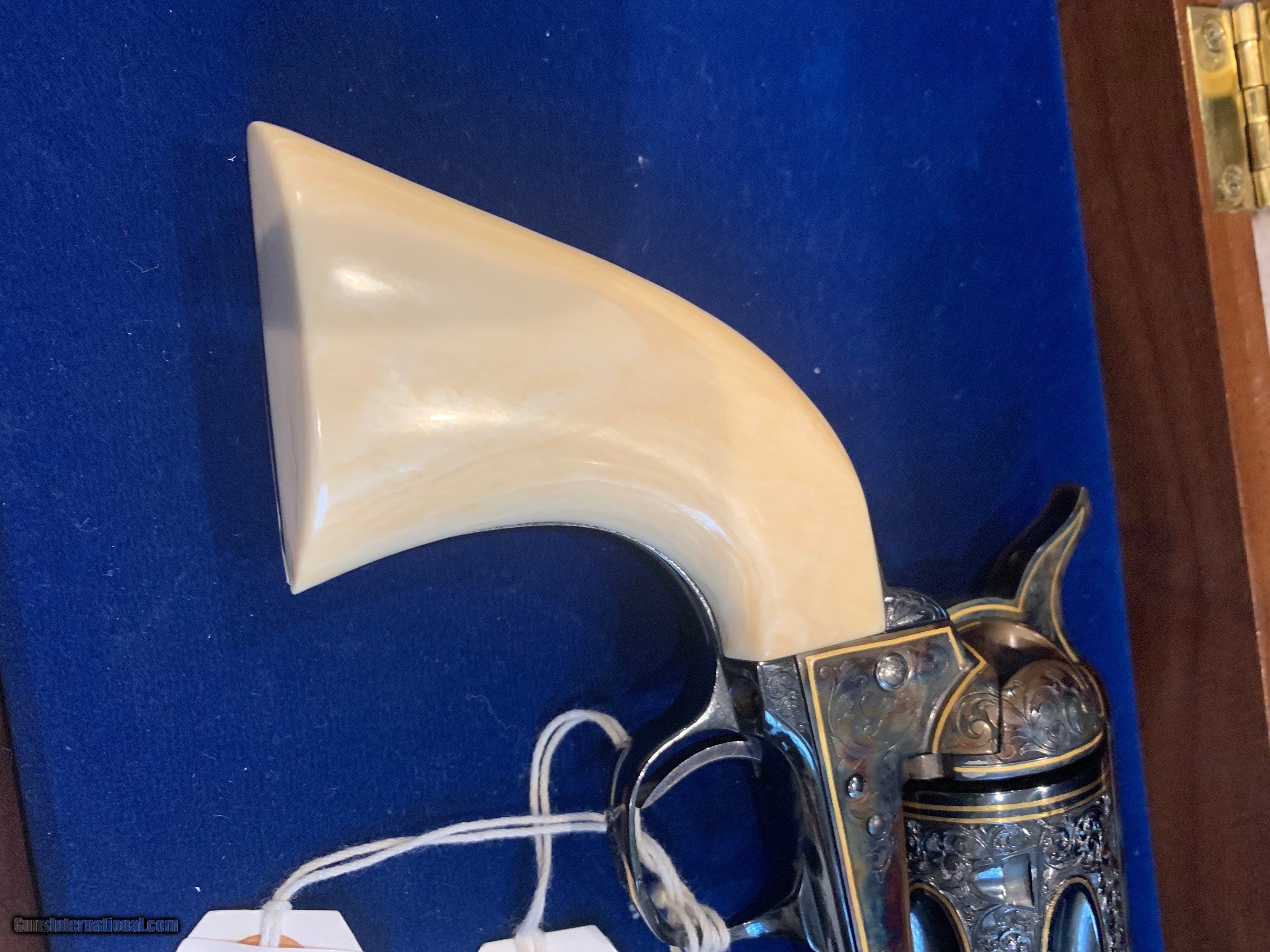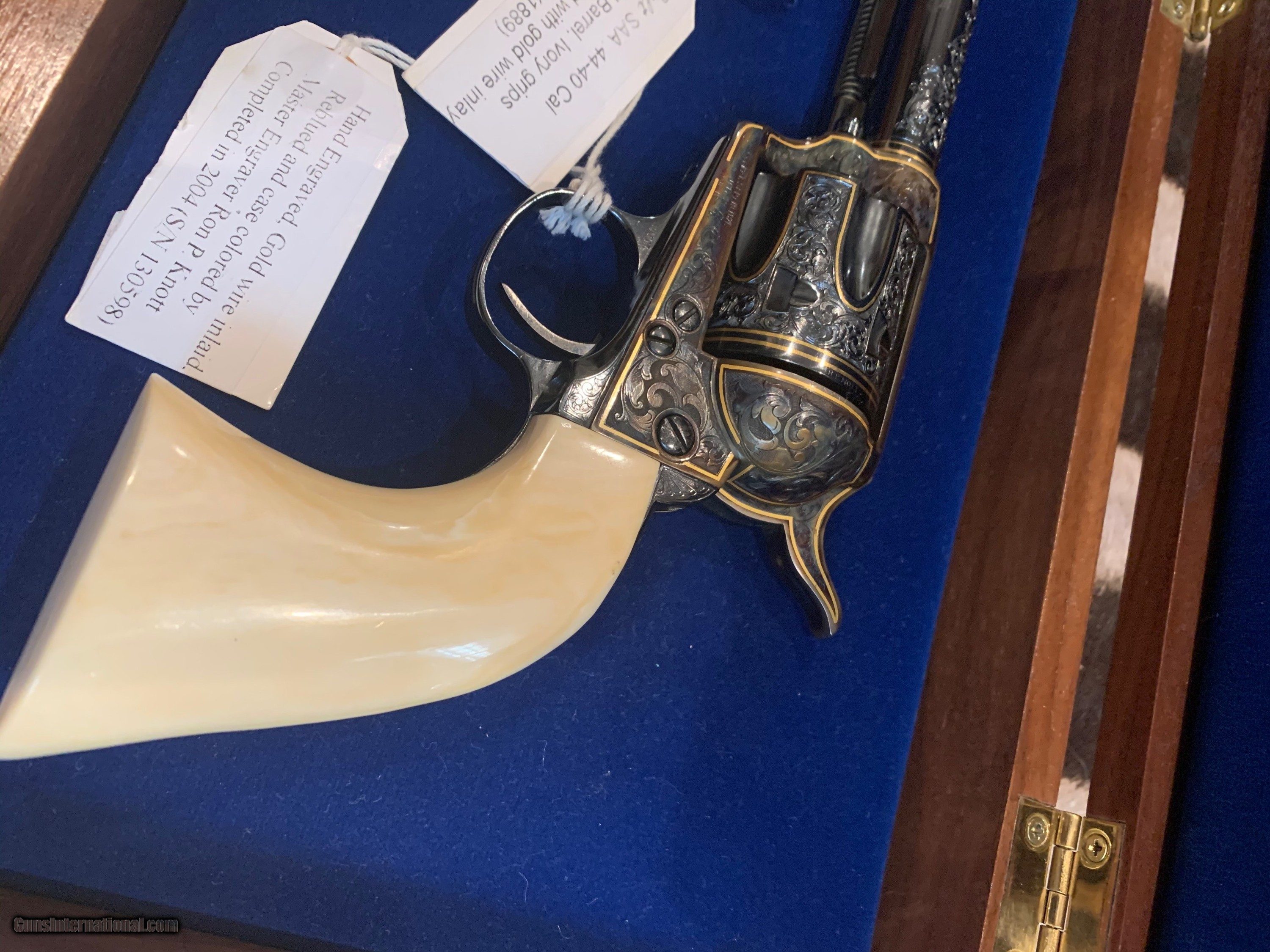 Description: SOLD Single Action Army 44-40 made in 1890 engraved by master Colt engraver Ron P Knott with gold filaments, extensive hand engravings, case colored with genuine ivory grips (pre ban certificate comes with the gun) the gun remains in 99% condition overall with only slight rotation markings on the cylinder. Certificate of authenticity and provenance come with the gun. Handguns will ship FFL to FFL two days insured Fedex. SOLD Rifle Caliber: .44-40 Winchester Manufacturer: Colt Model: SAA Barrel Length: 4-3/4” Condition: 99% Metal Condition: 99/% Engraving: Yes Case: Yes Item Location: North Carolina |